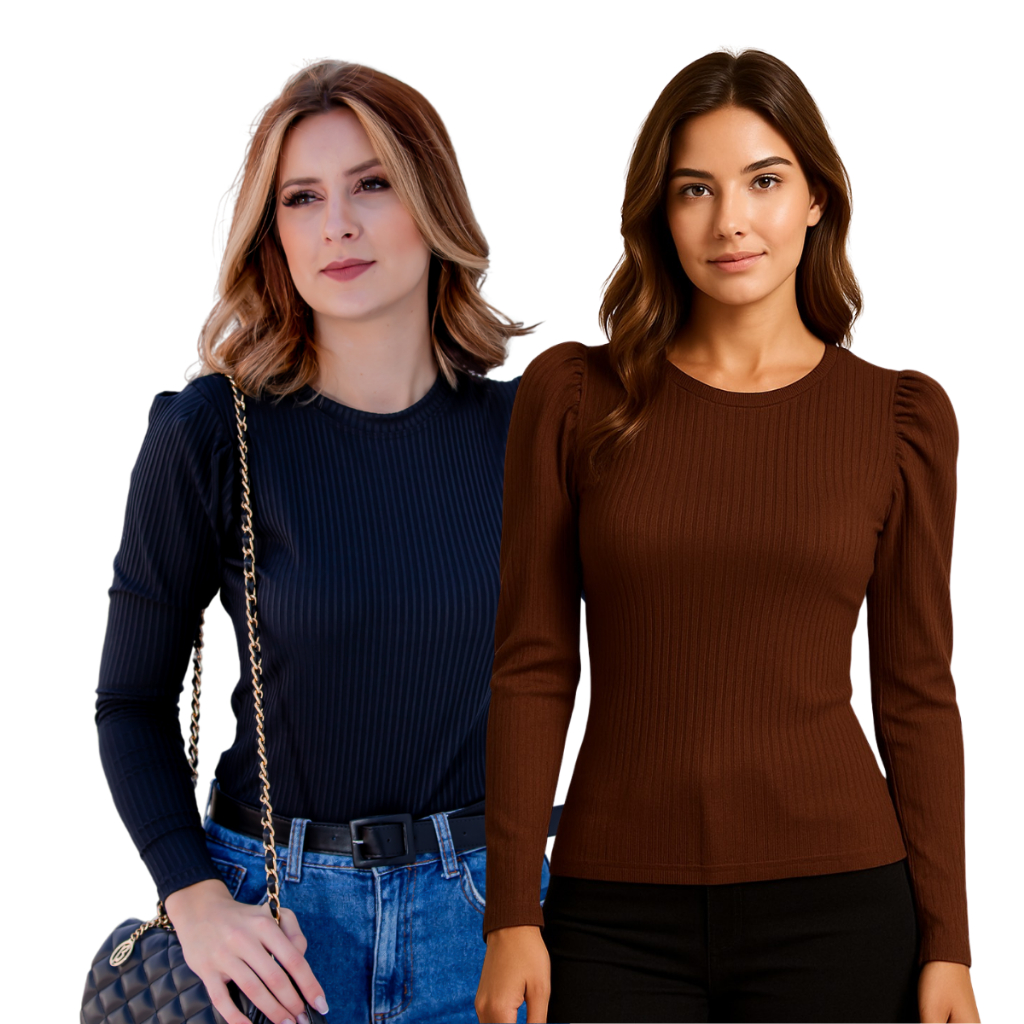 KIT 2 - Blusa Princesa Canelada Feminina Bufante Mangas Longas
