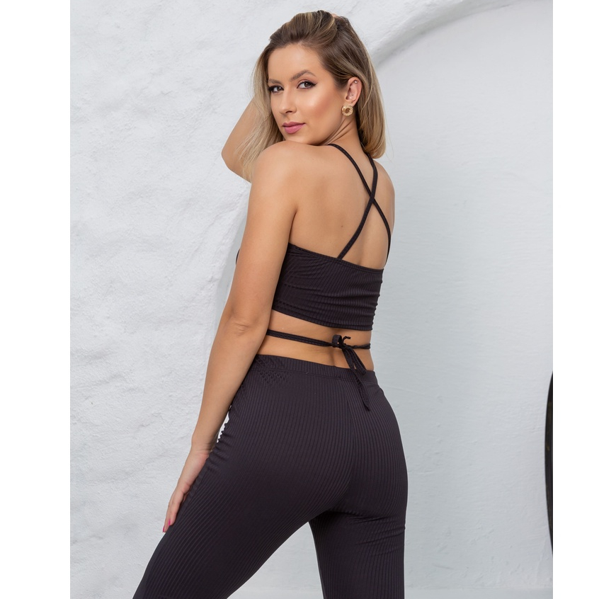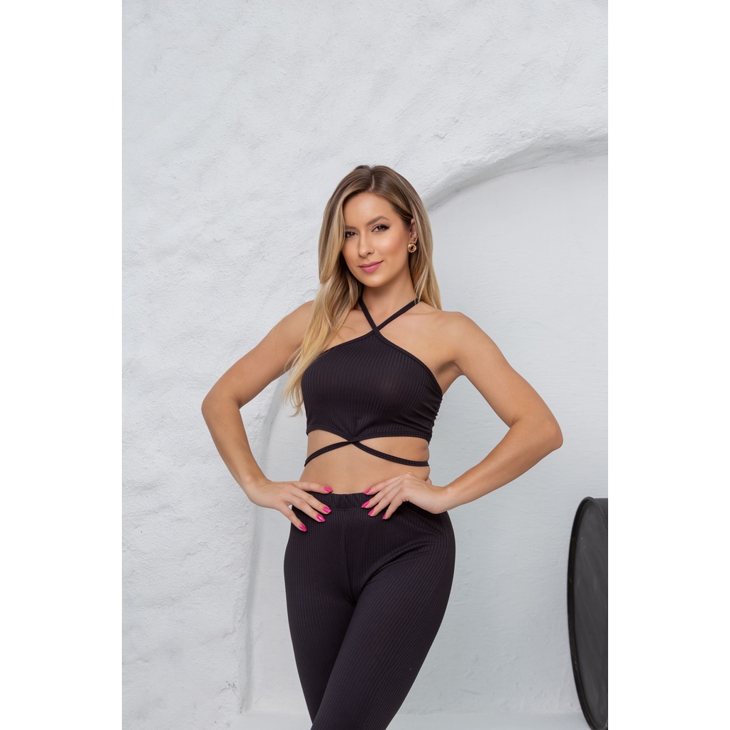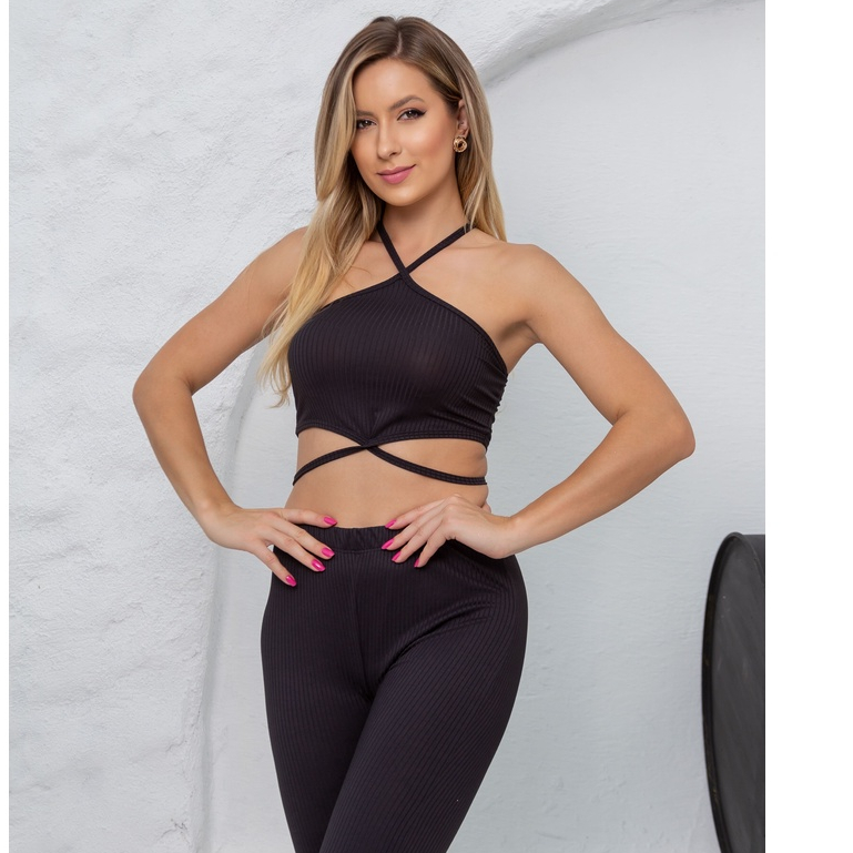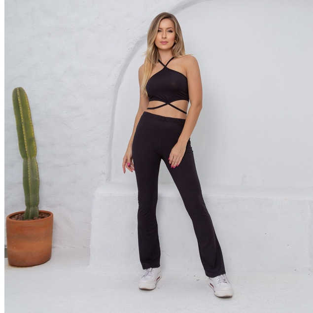Conjunto Canelado Preto Feminino - Conjunto de Calça e Top com Cruzado do Pescoço