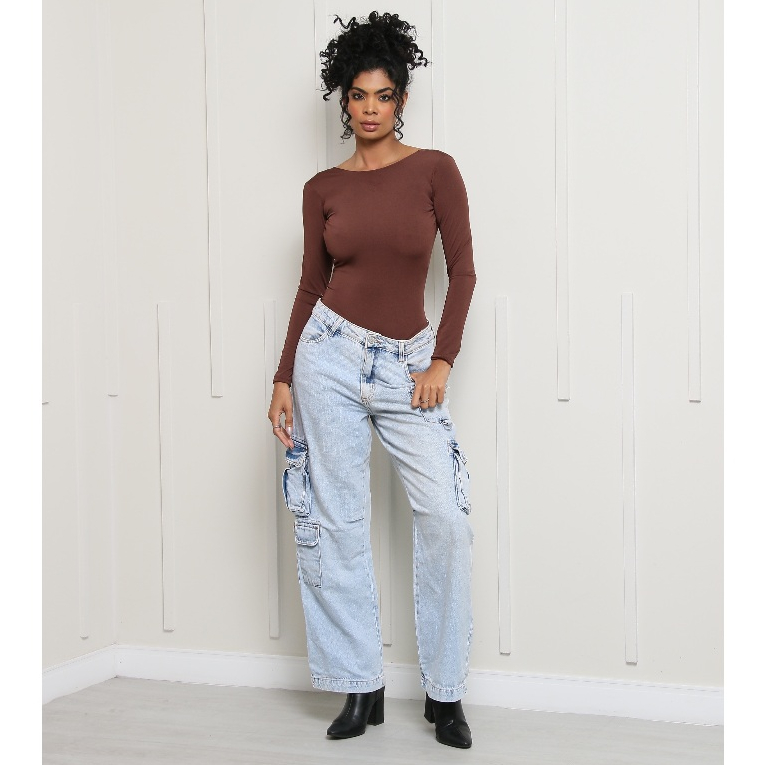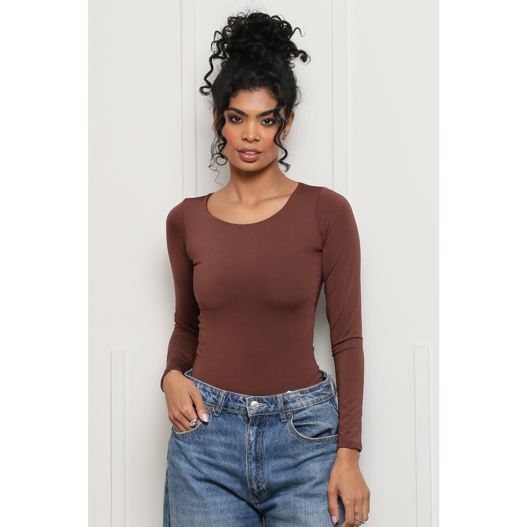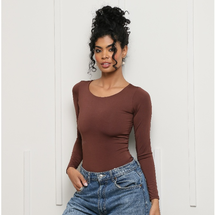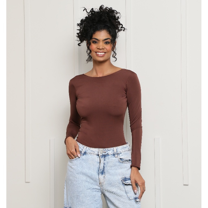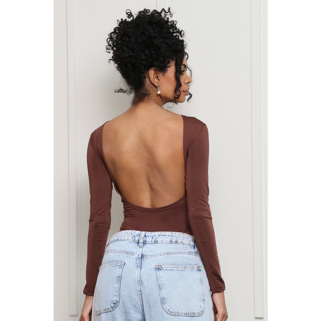 Body Manga Longa Marrom Aberto nas Costas