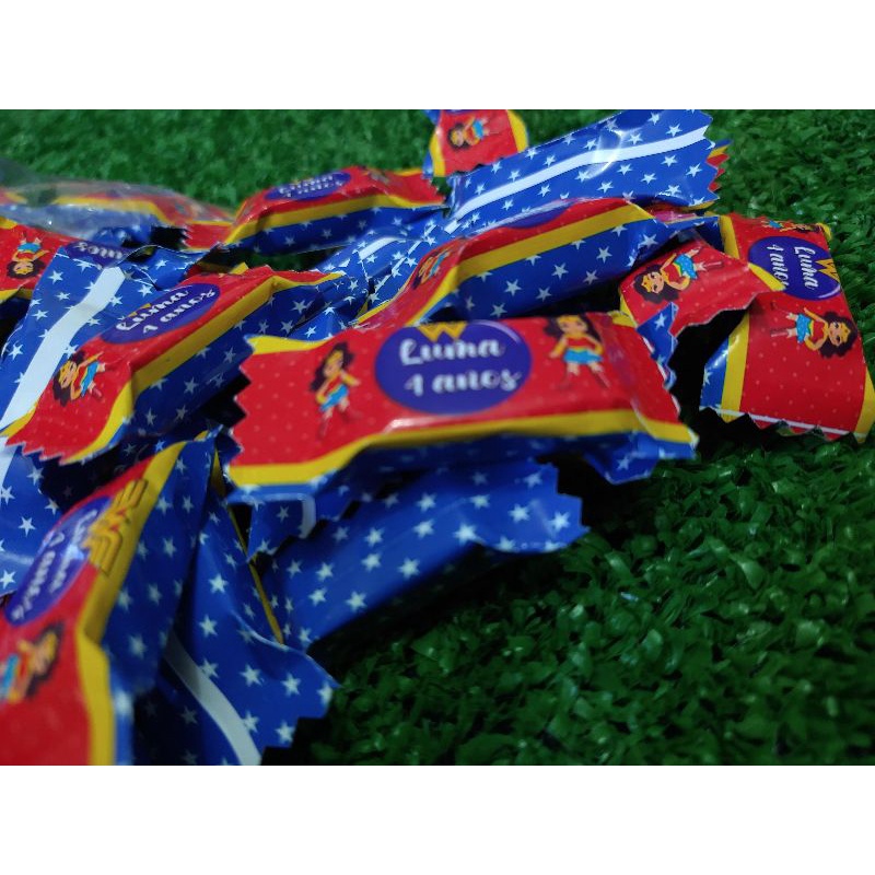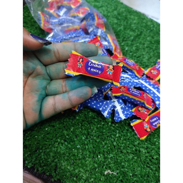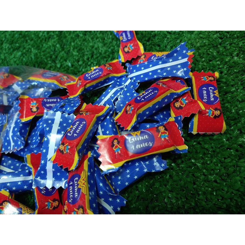 50 balas personalizadas para aniversário tema mulher maravilha, lembrancinha