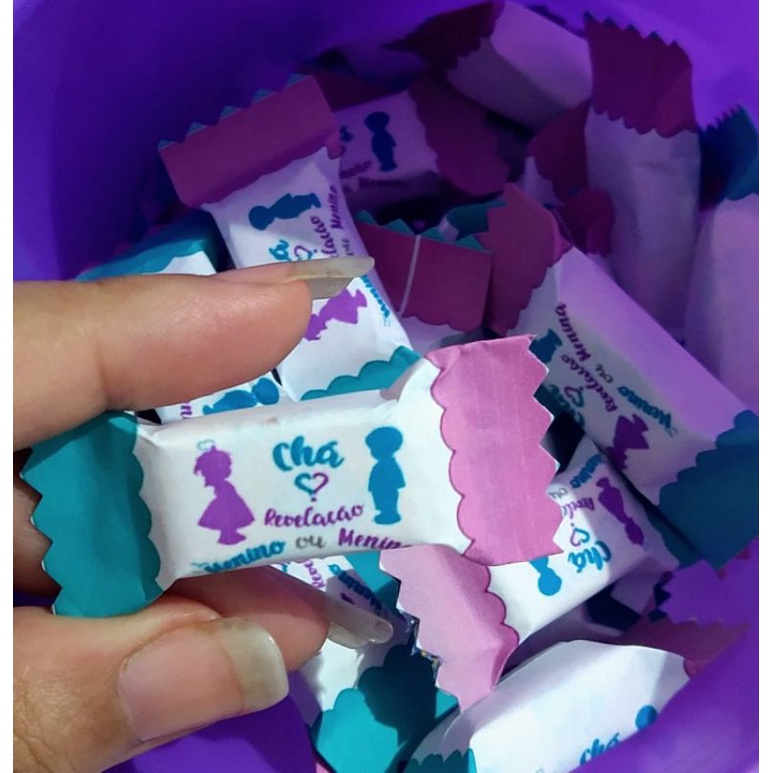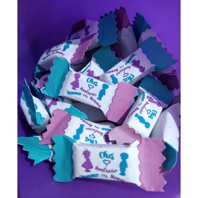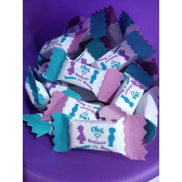 50 balas personalizadas chá de revelação ROXO E VERDE / LILÁS E VERDE , lembrancinha menino ou menina?