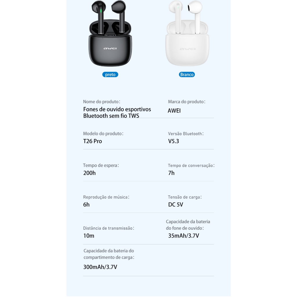 Fone de Ouvido Awei T26 Pro TWS Bluetooth 5.3 fone a prova d água IPX6 Toque inteligente Estéreo HiFi