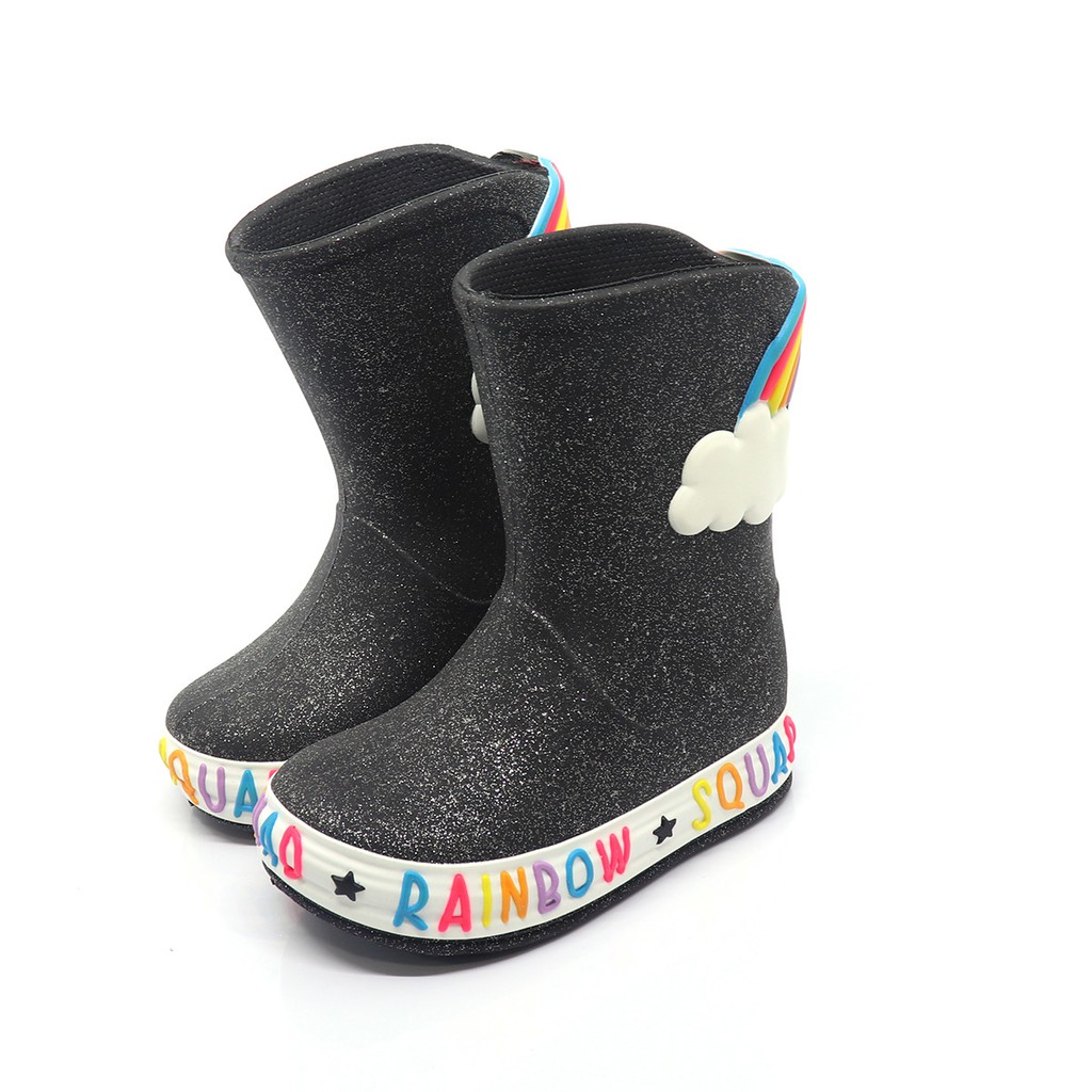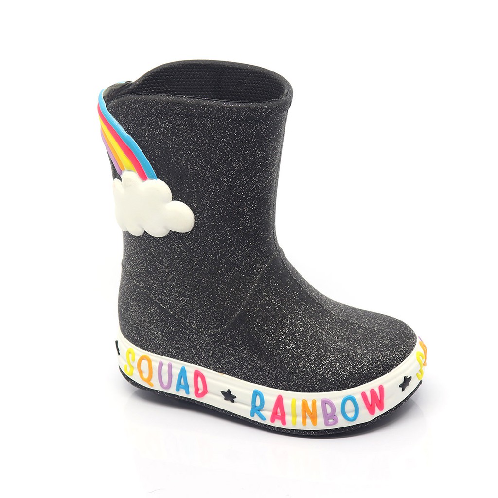 Galocha Bota Infantil Plugt Menina Confortável Leve Macio Nuvem Arco Iris Glitter Preto
