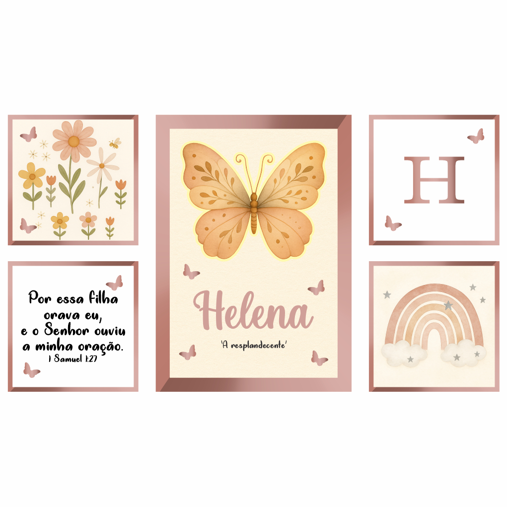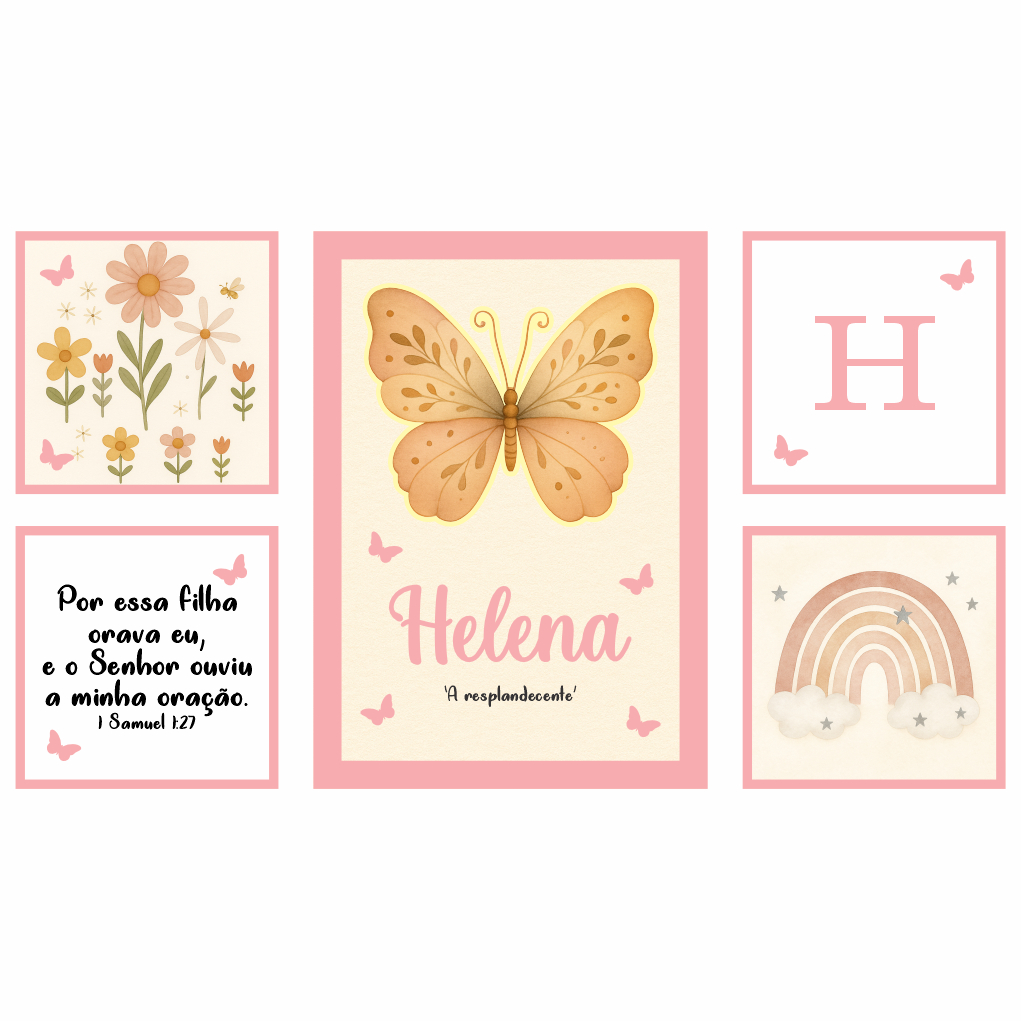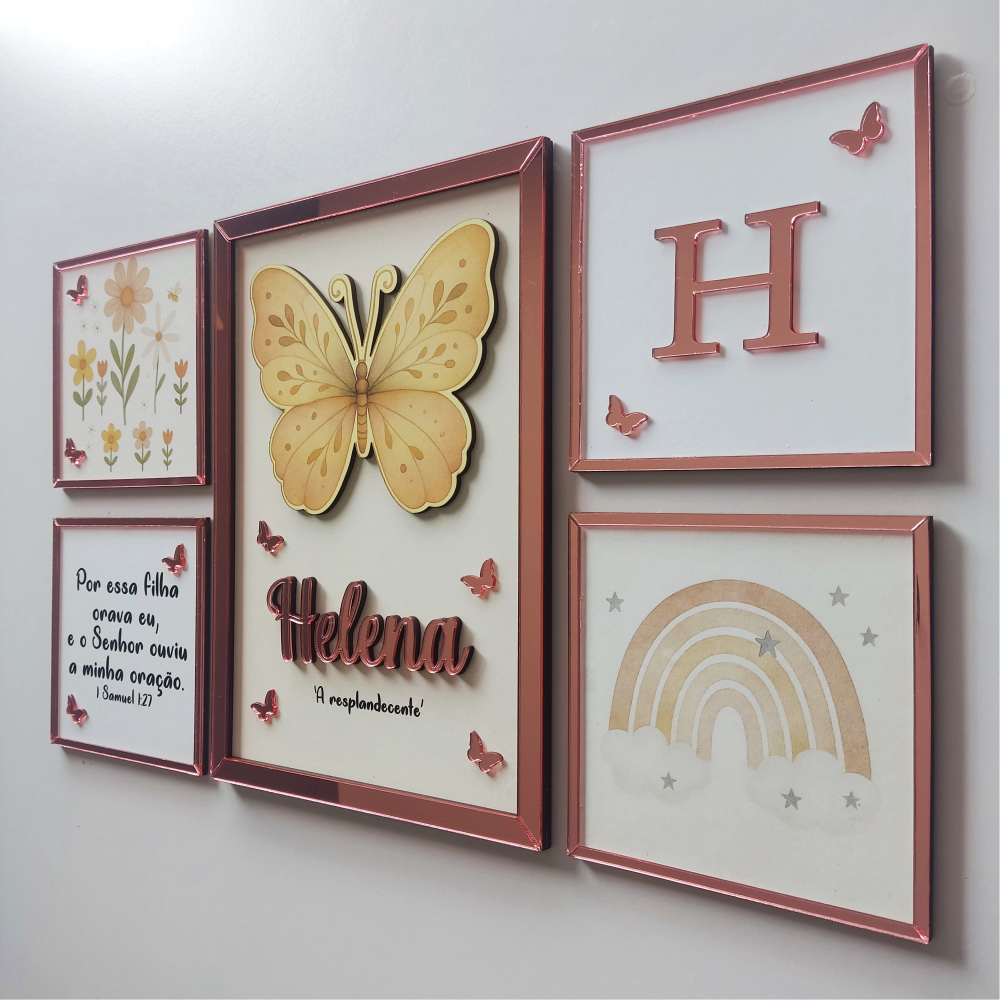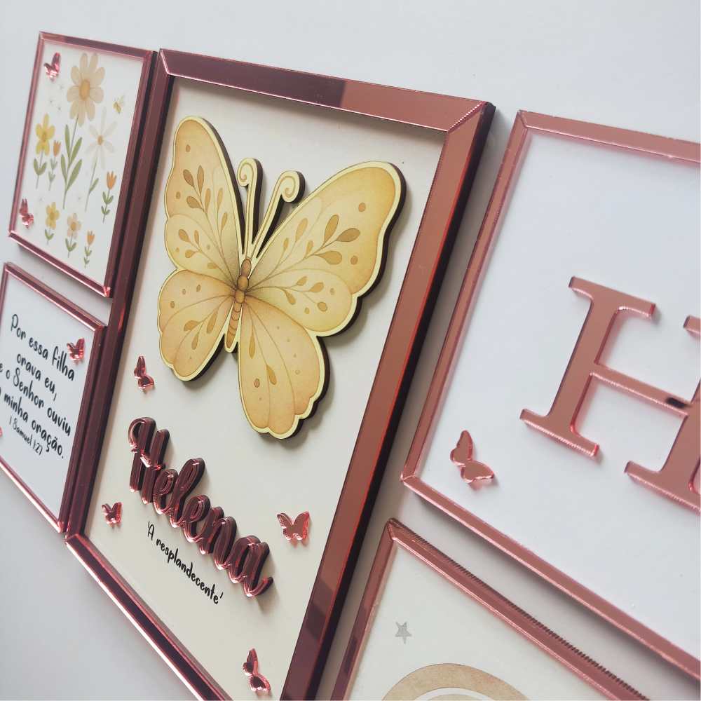 Kit 5 Quadros Decorativos Tema Borboleta com Nome e Versículo - Decoração Quarto Bebê Menina