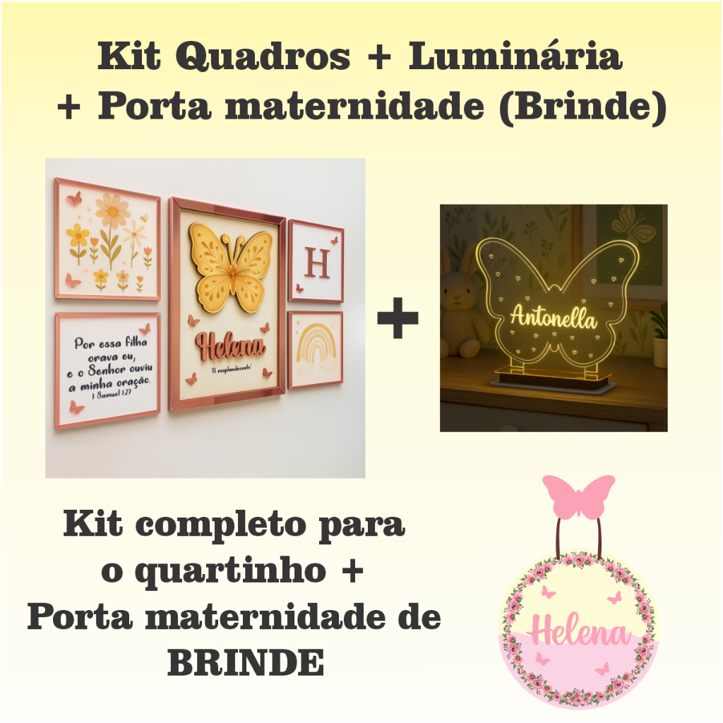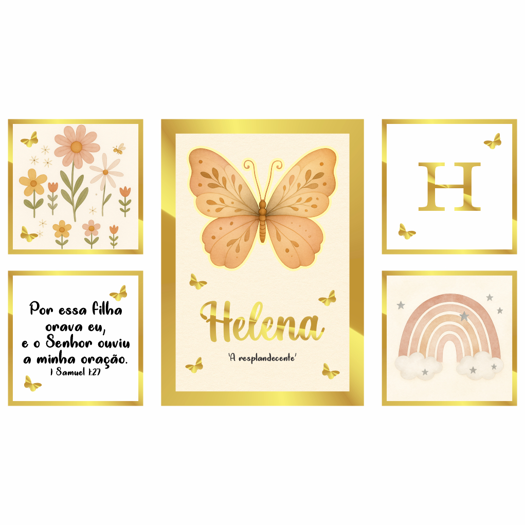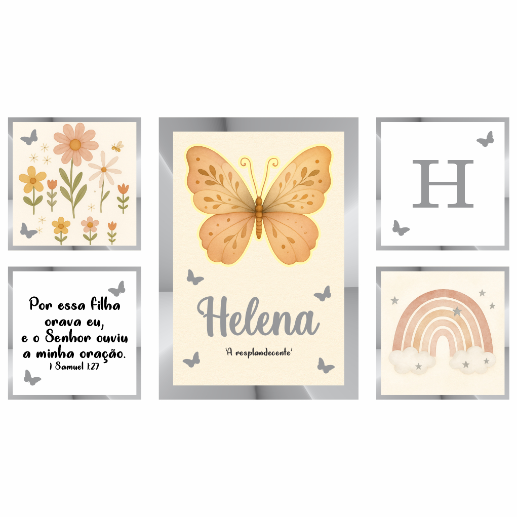 Kit 5 Quadros Decorativos Tema Borboleta com Nome e Versículo - Decoração Quarto Bebê Menina