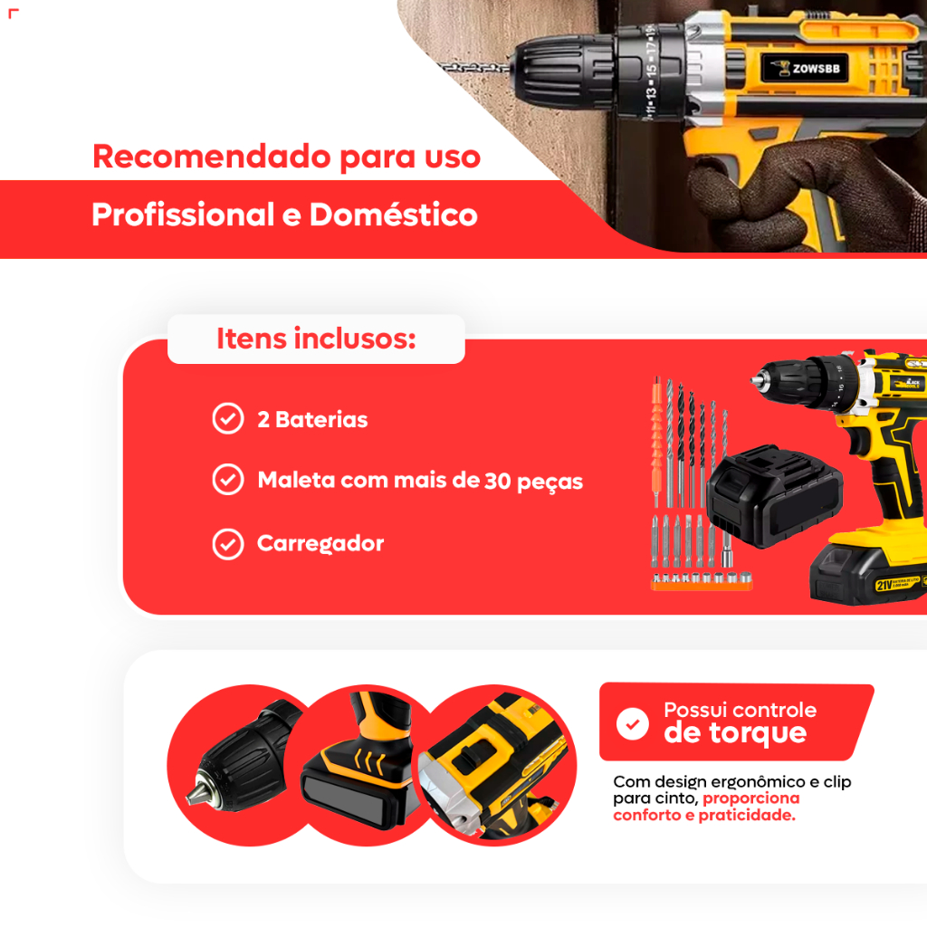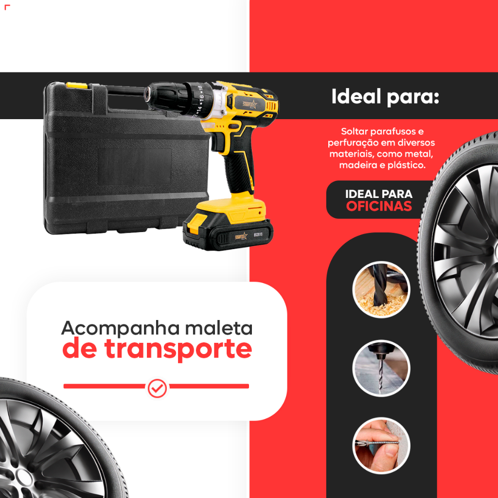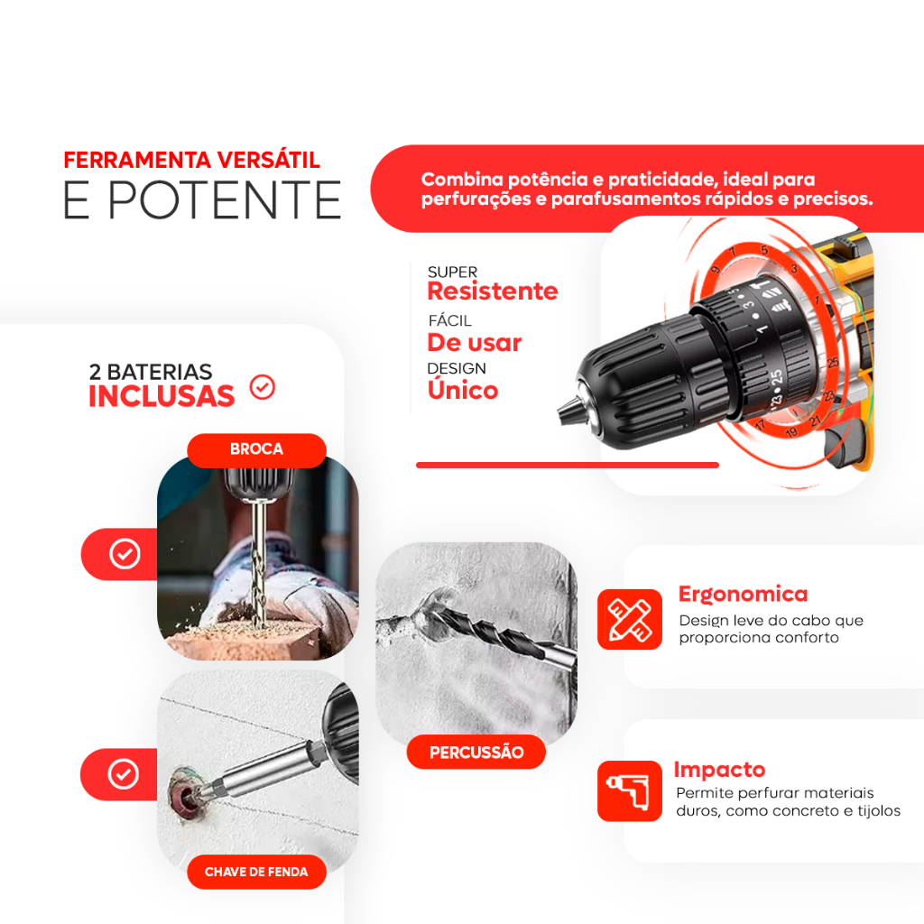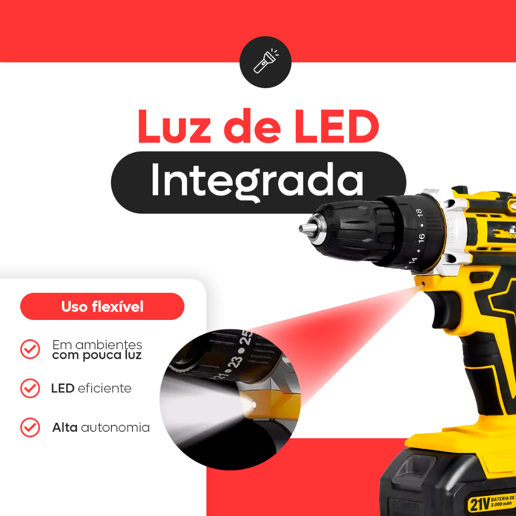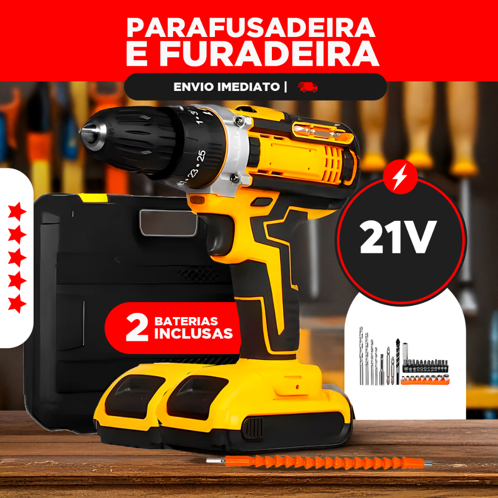 Parafusadeira Furadeira 21V 2 Baterias Forte e Resistente Com Maleta e Acessórios Completo