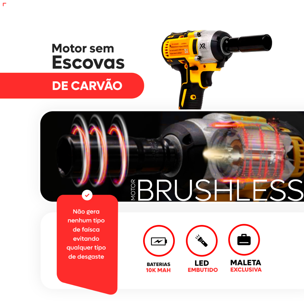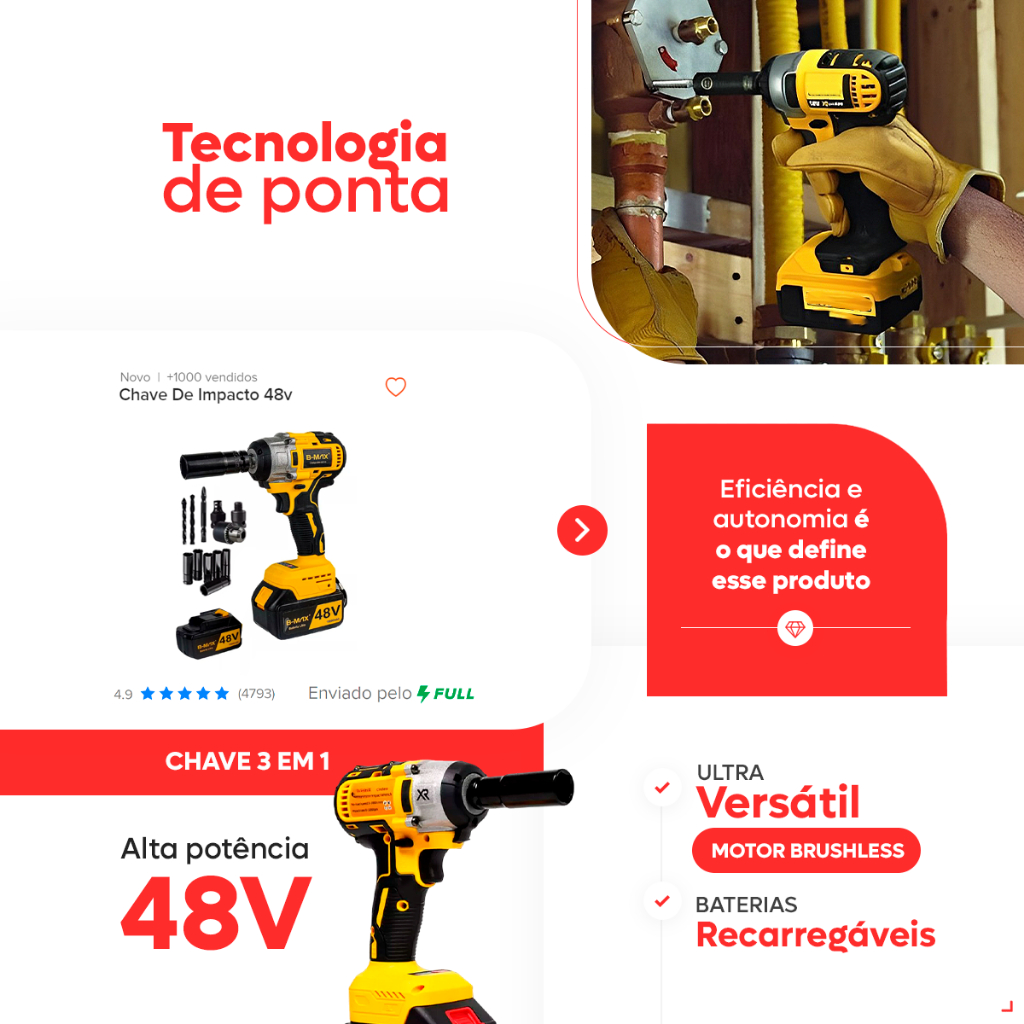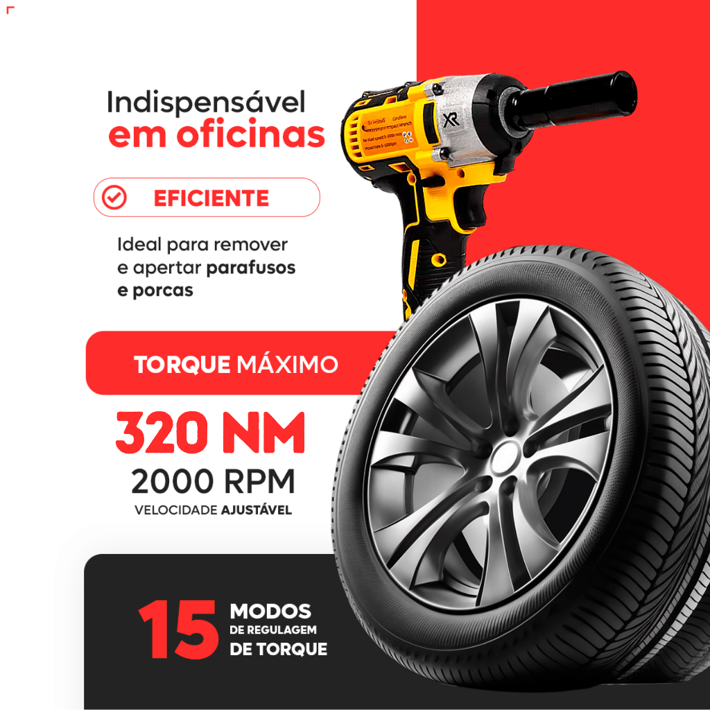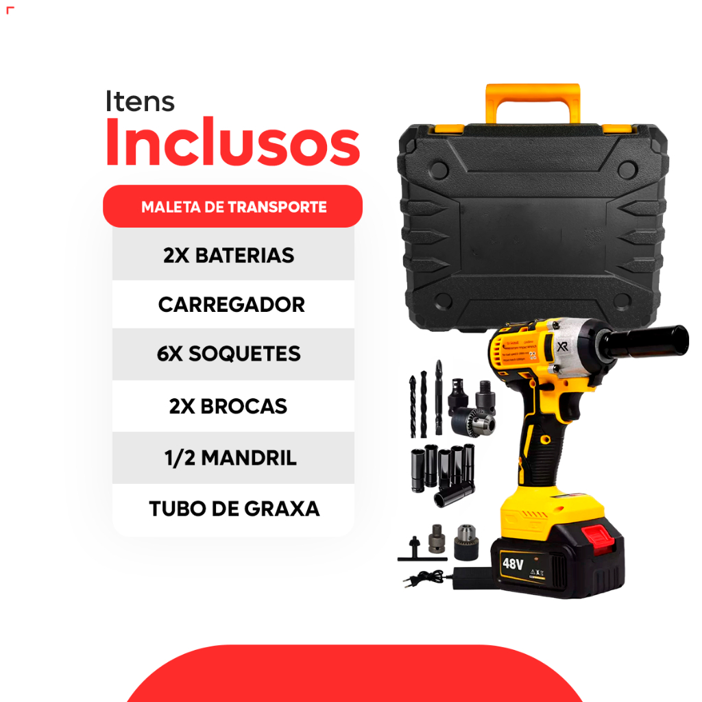Chave de Impacto 1/2" 48V Profissional com 2 Baterias de Litio Recarregável Portátil Parafusadeira