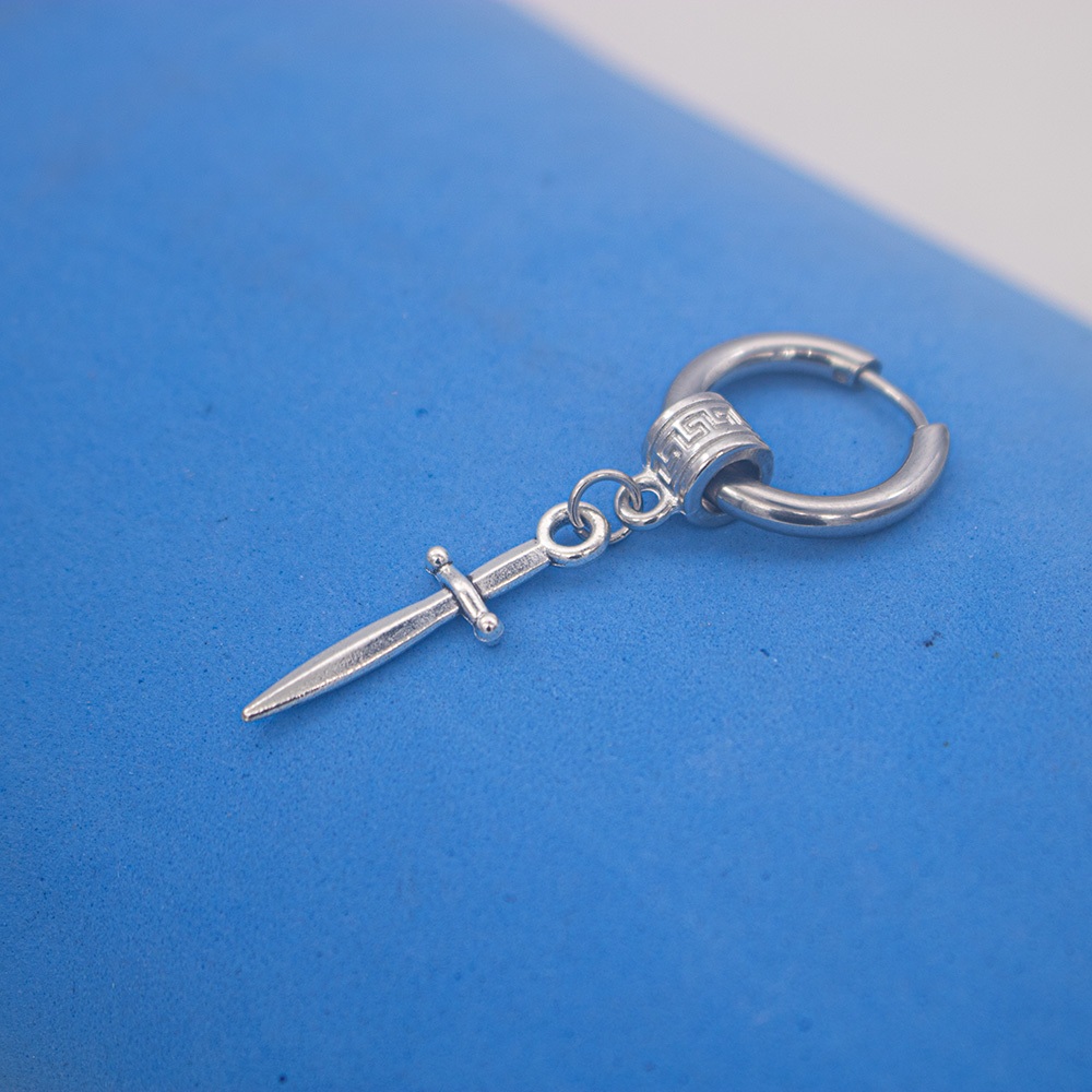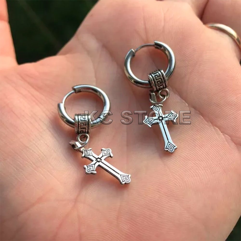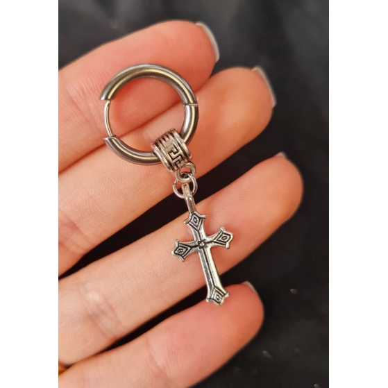 Brinco Masculino Argola prata Preto Black em aço inox clicker cruz crucifixo Vazado romana coreano