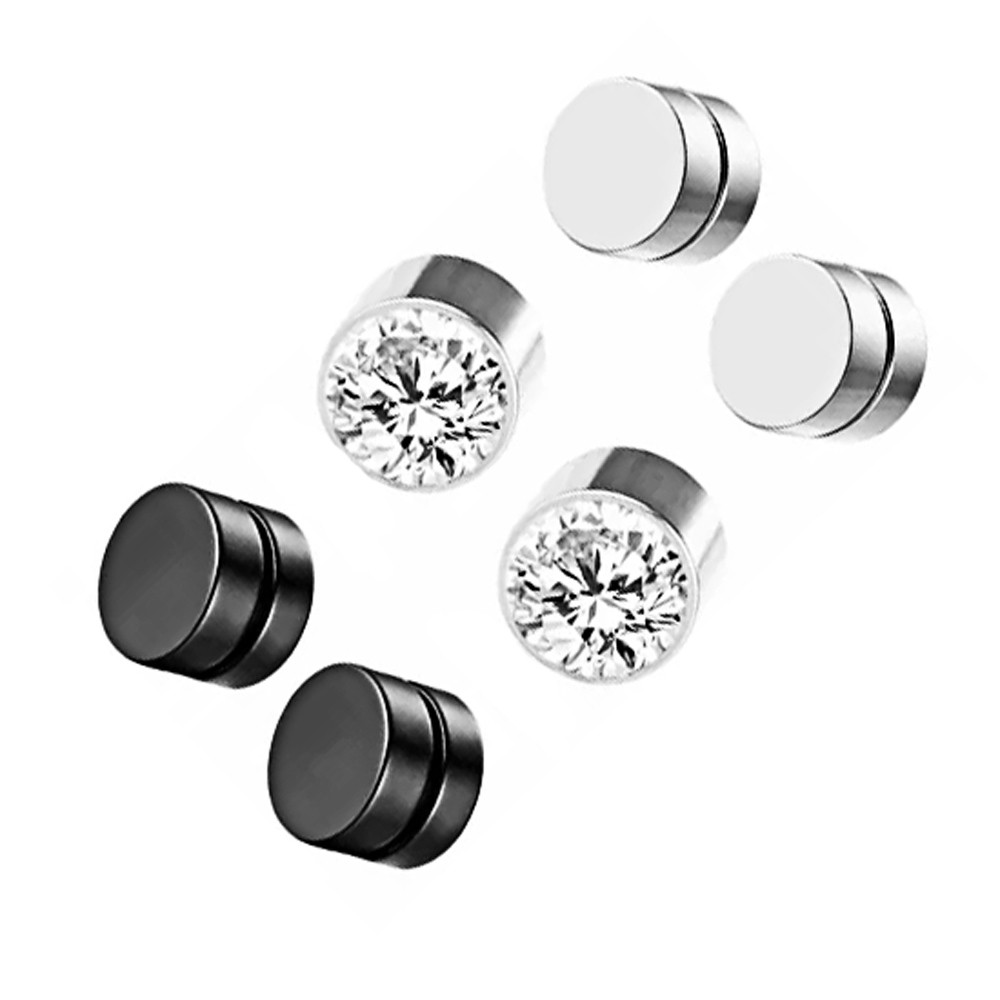kit 3 Pares brinco de pressão masculino feminino prata preto imã magnético redondo não precisa furo