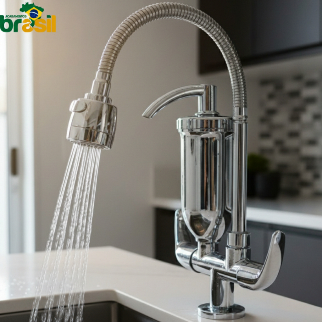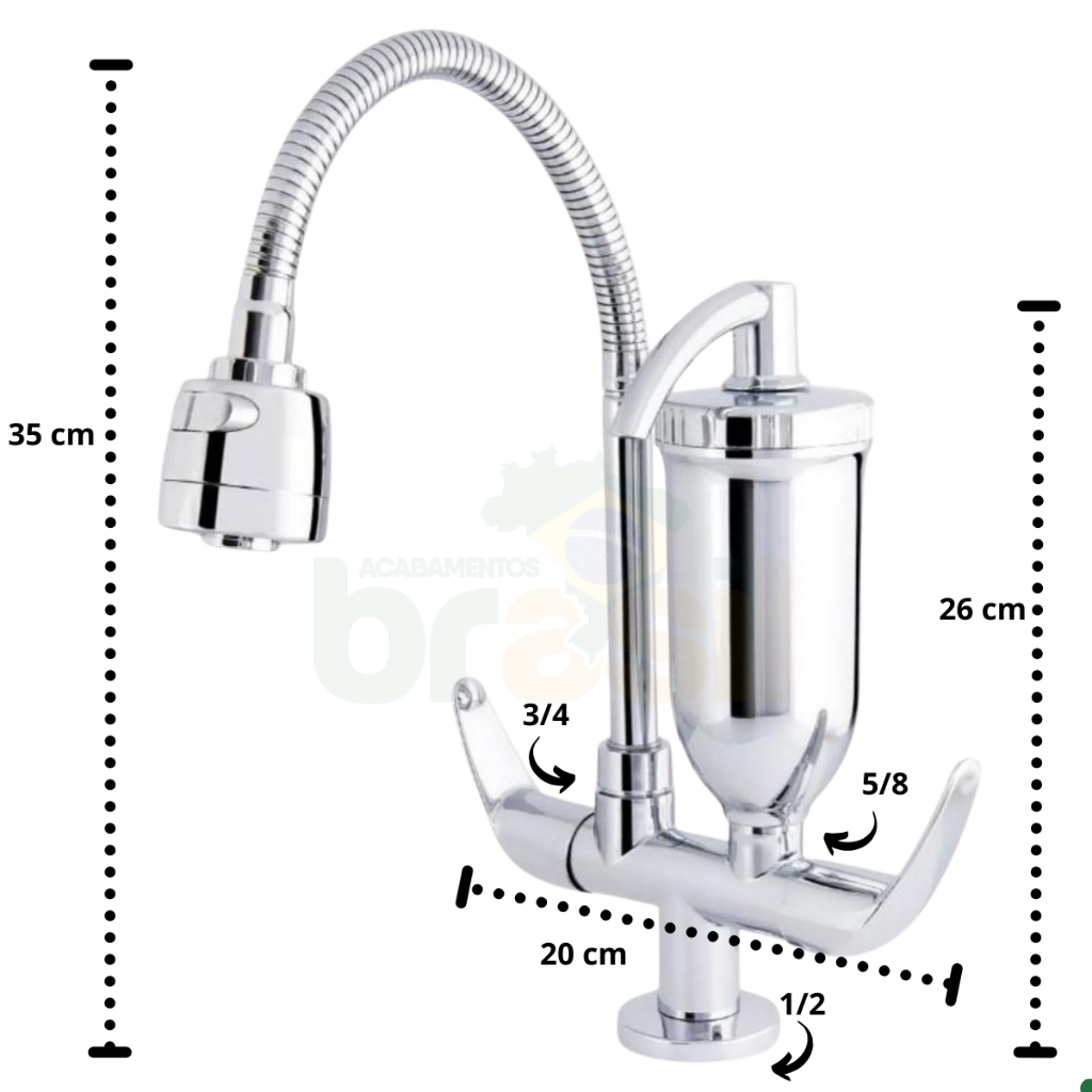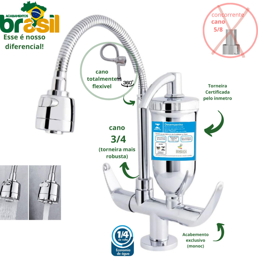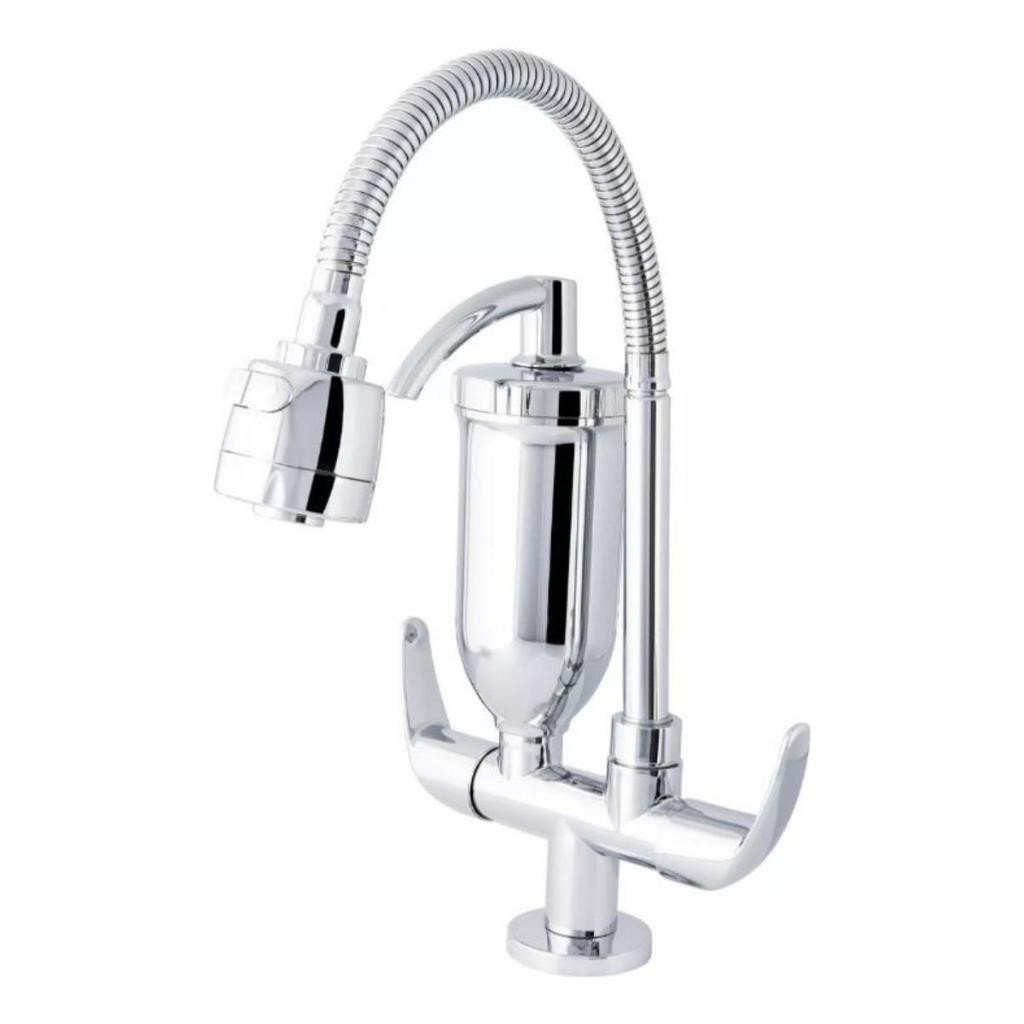 Torneira Gourmet Filtro purificador bancada cozinha Carvão Ativado Flexível Dois jatos Cromada Inox
