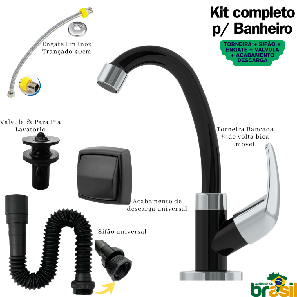 kit torneira preta banheiro completo sifão preto engate inox acabamento descarga valvula lavatorio