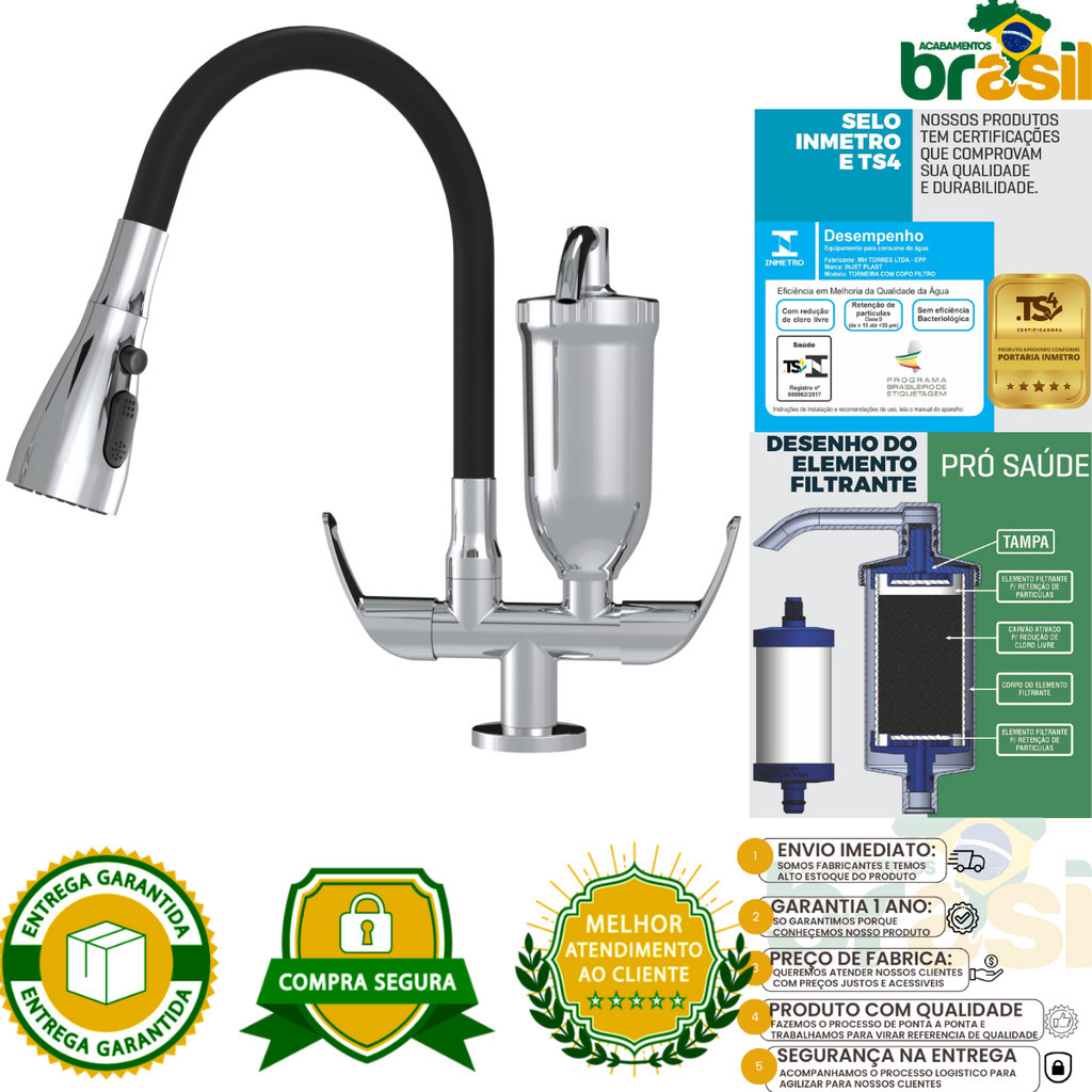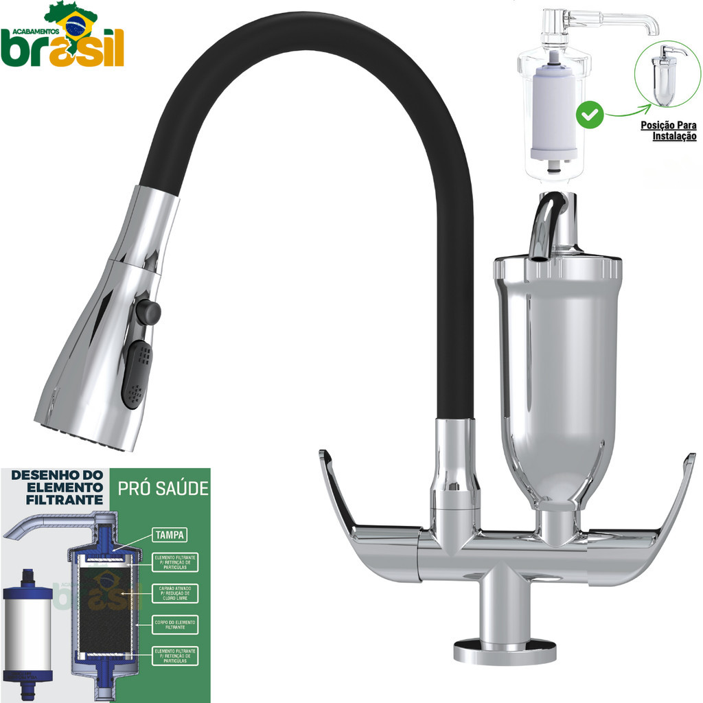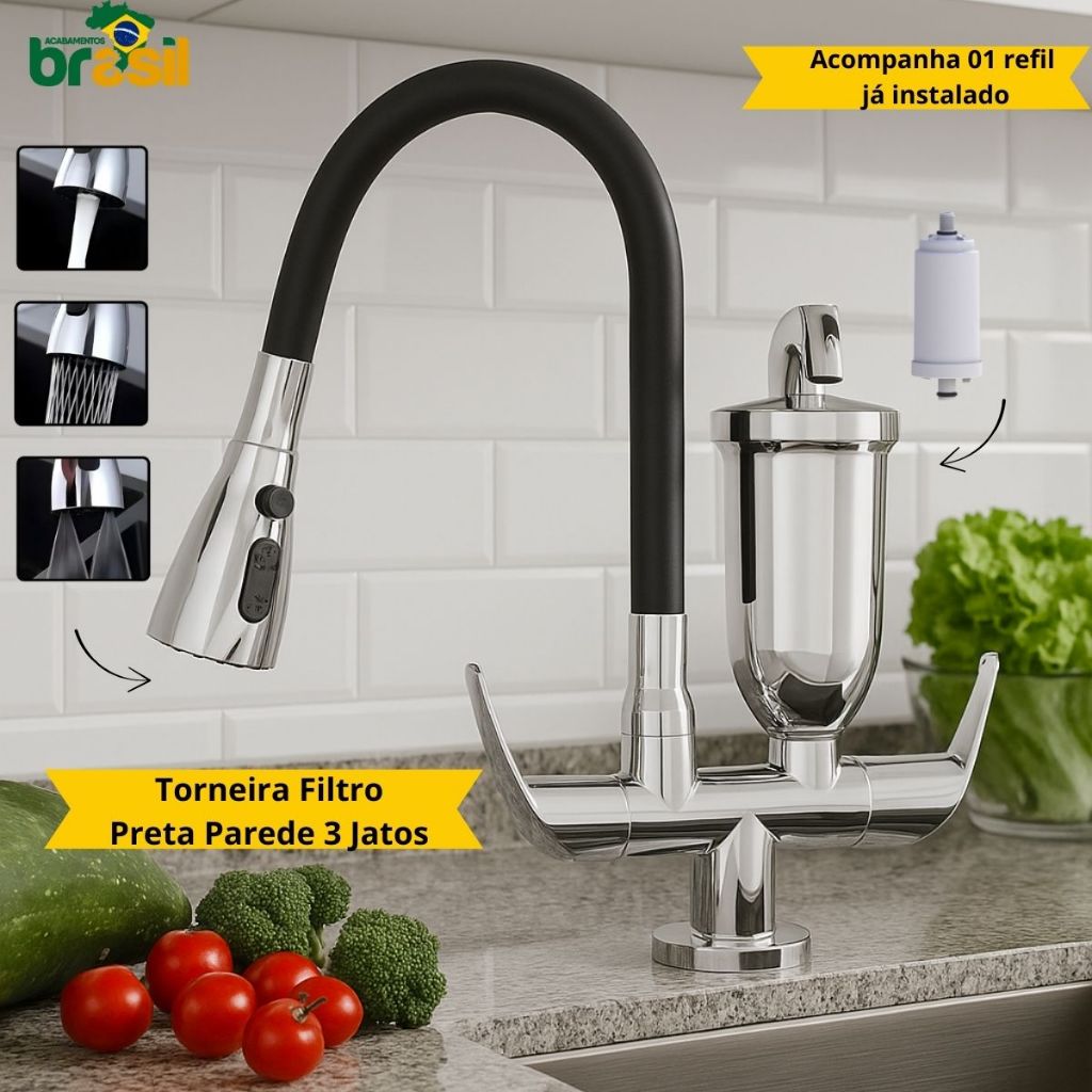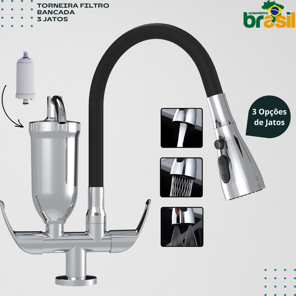 Torneira Filtro Bancada Cromada cozinha pia 3 Jatos filtro preto bica alta pressão