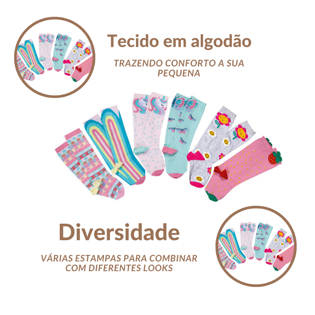Kit de 6 meias para galochas com estampas sortidas para meninas