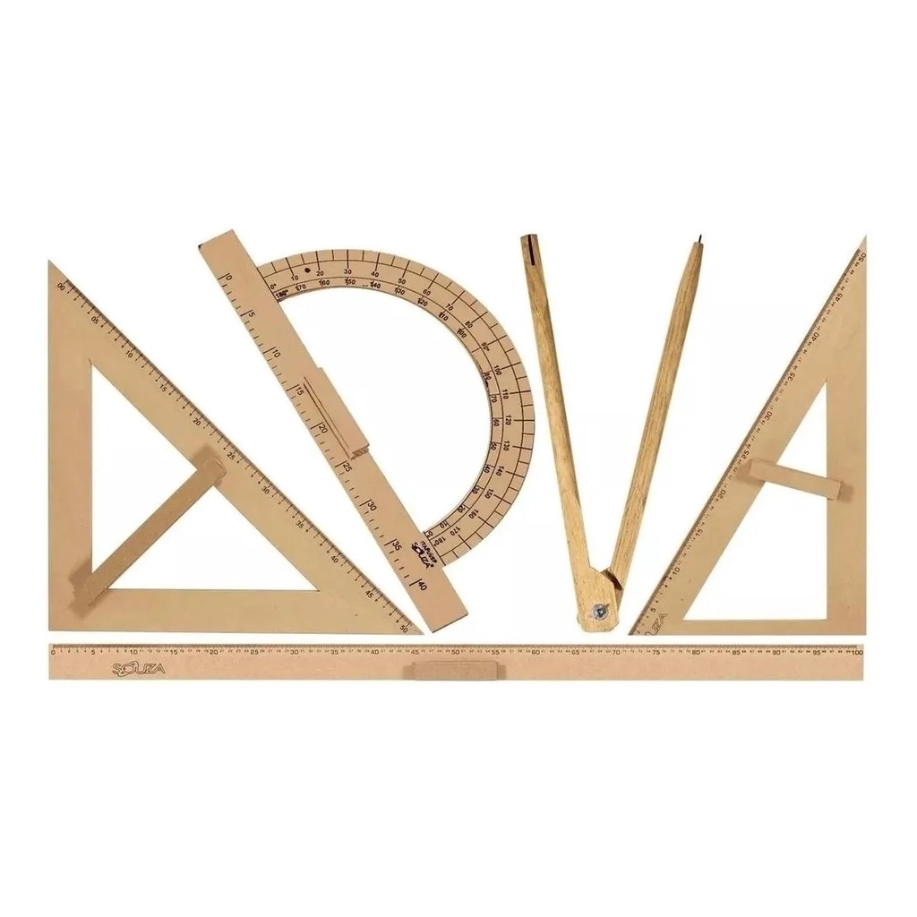 Kit Geométrico Mdf 5 Pçs - Compasso Quadro Verde - Esquadro Transferidor Regua