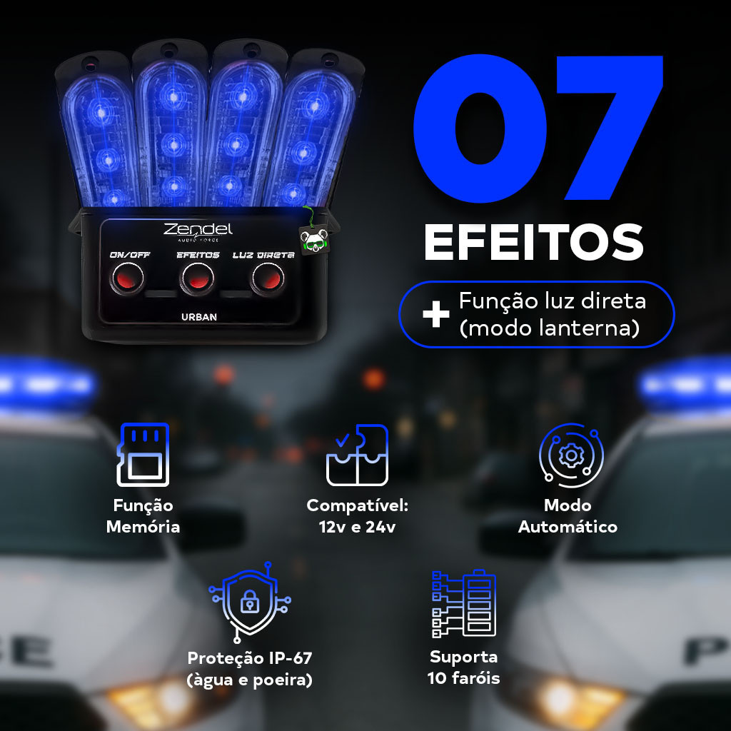 Kit Strobo Automotivo 4 Faróis Azul Urban + Central Zendel