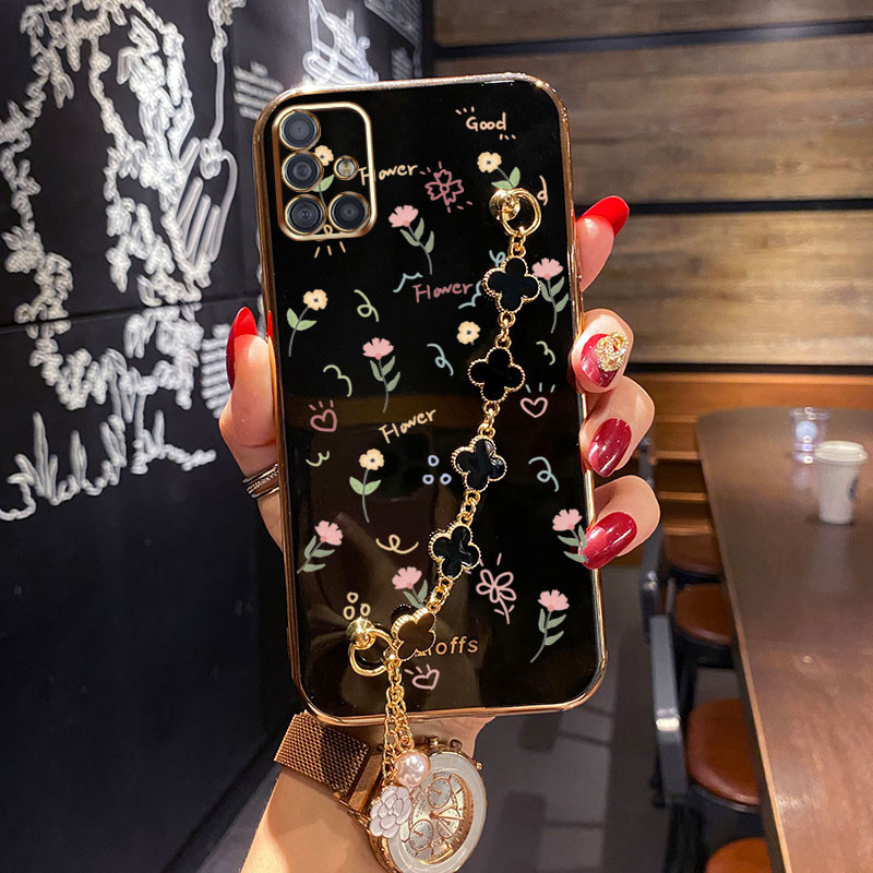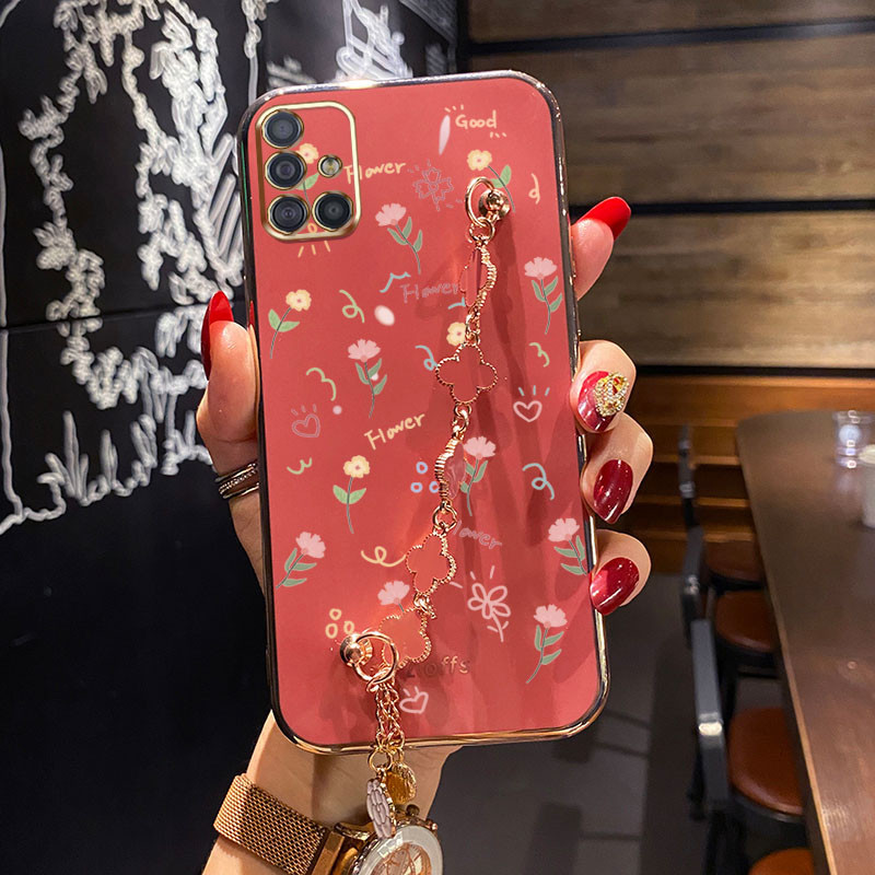 Invólucro Samsung Galaxy A31 A51 A71 4G Padrão De Flor Pequena Com Pulseira De Trevo De Quatro Folhas Capa Protetora De
