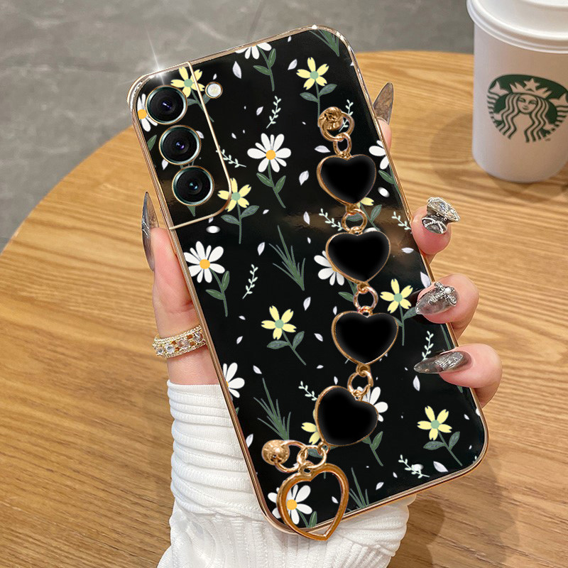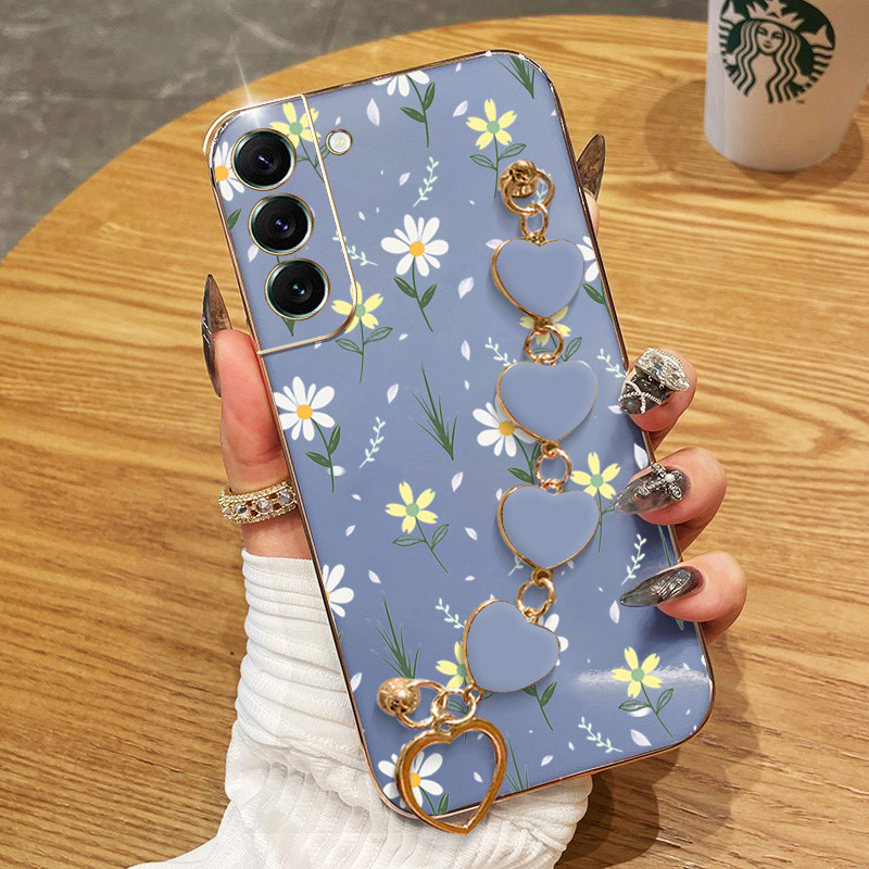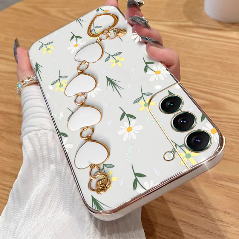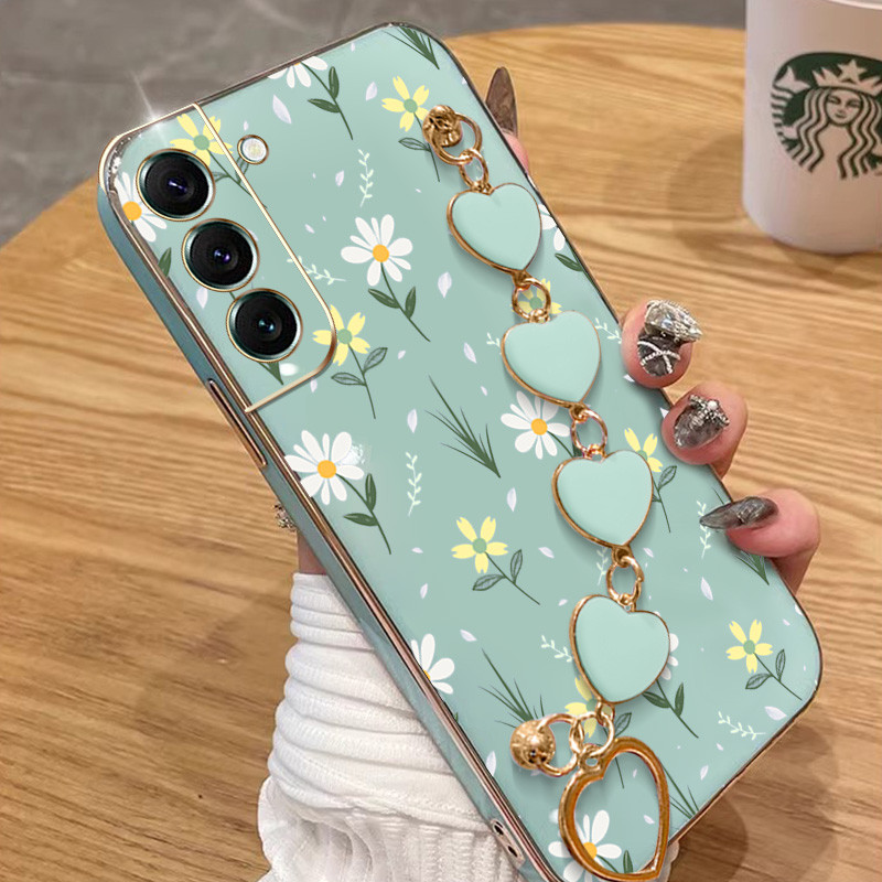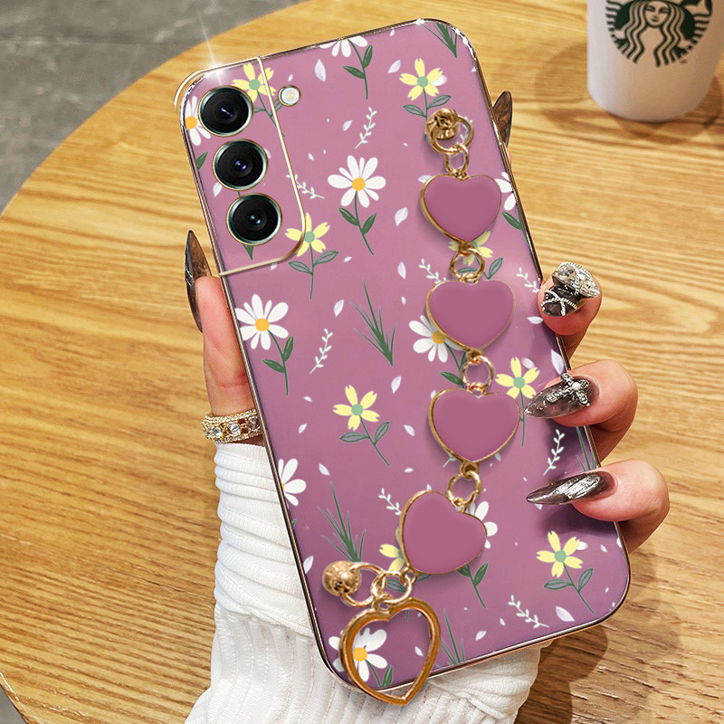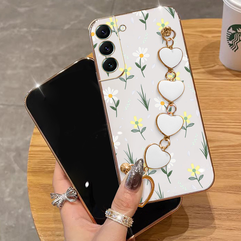Capa Para Samsung Galaxy S22 S23 S24 Plus Ultra FE S22 + S23 + S24 + Flores Pequenas Galvanoplastia De Telefone Anti-Queda Com Pulseira De Amor Protetora
