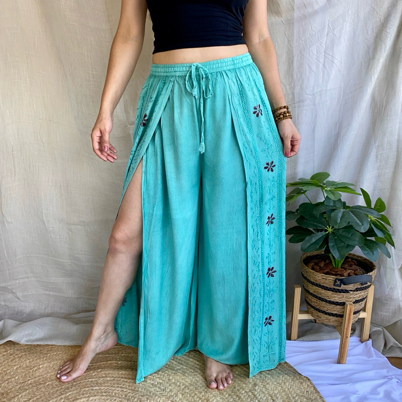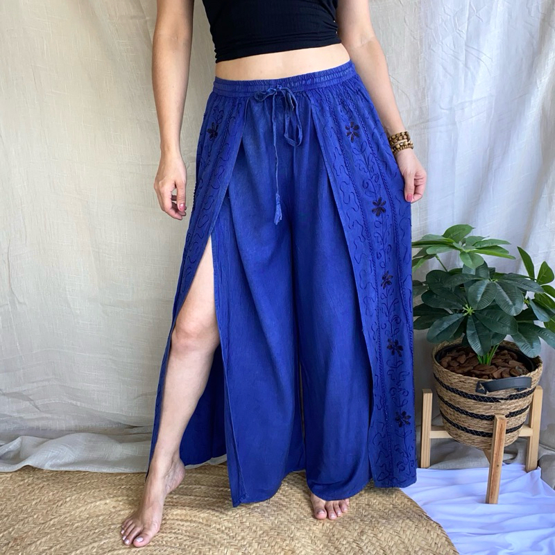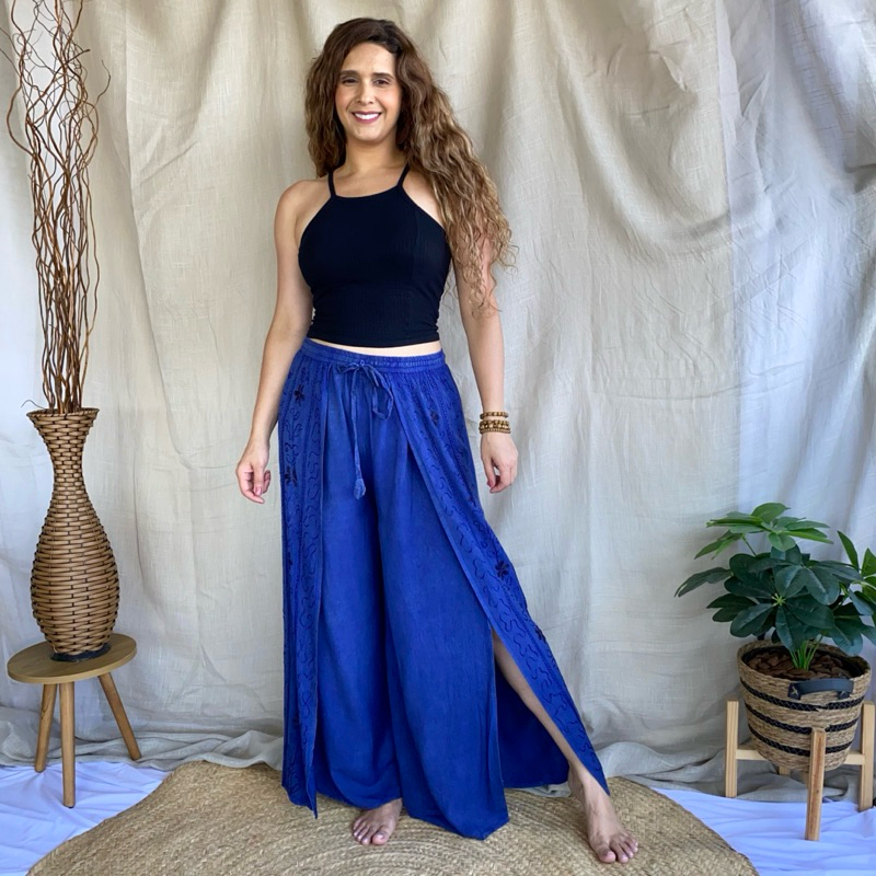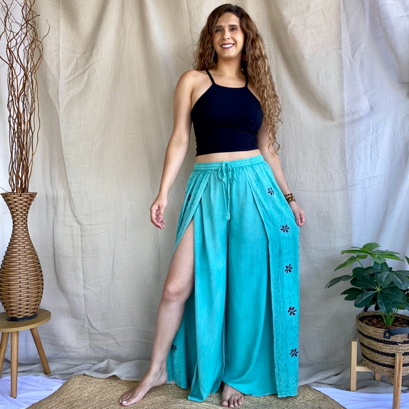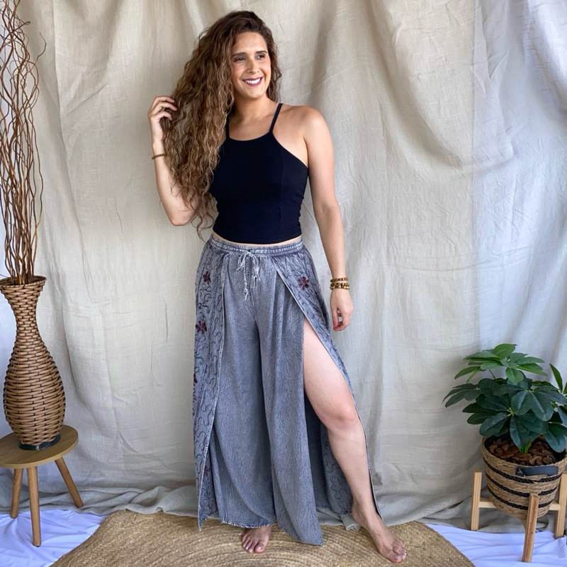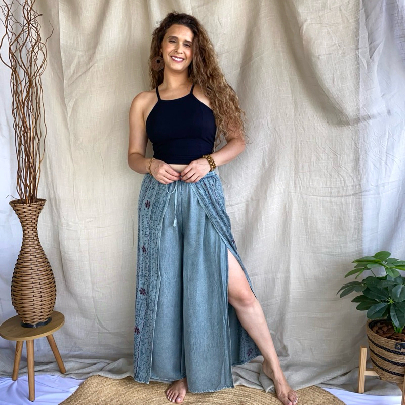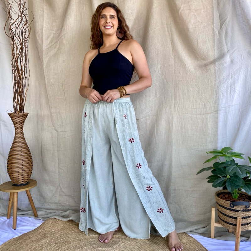 Calça Indiana Pantalona Com Fenda Bordada Moda Feminina Hippie