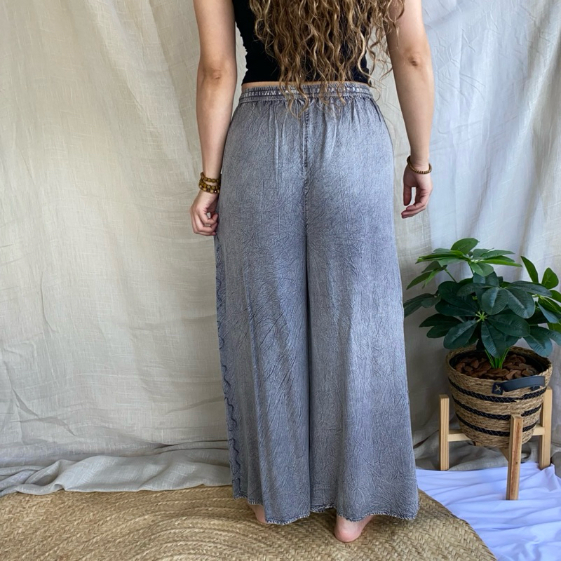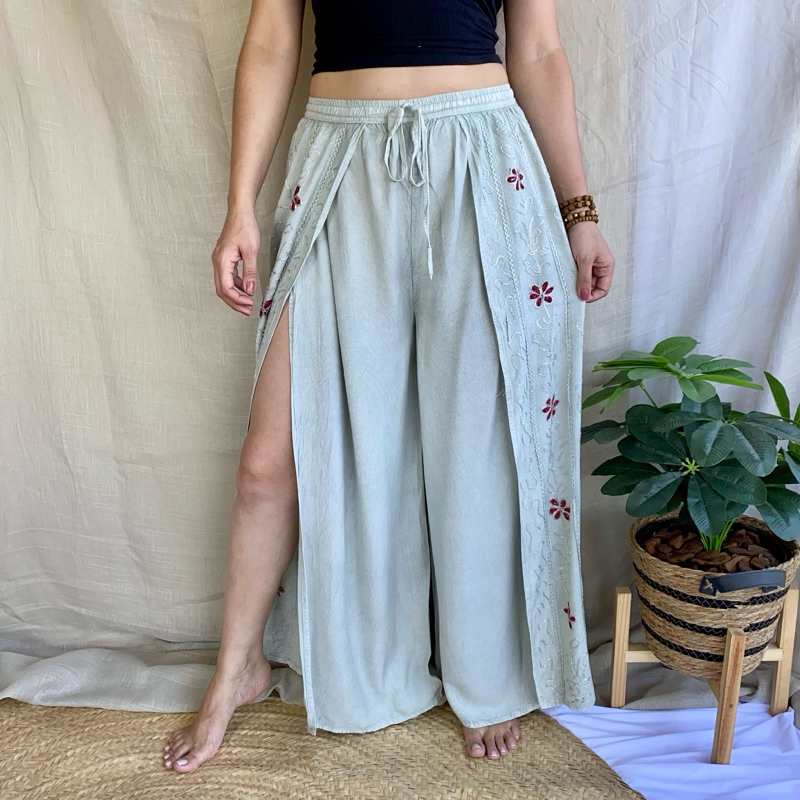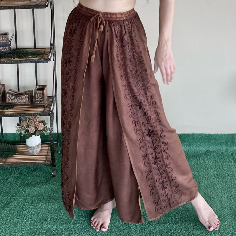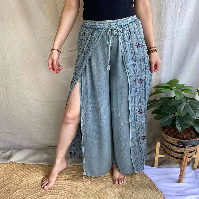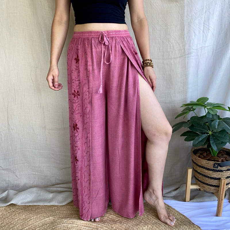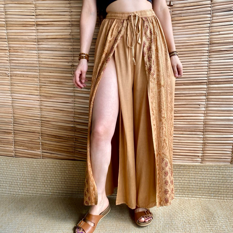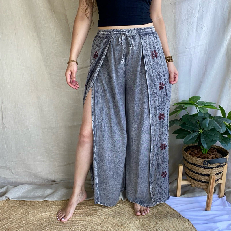 Calça Indiana Pantalona Com Fenda Bordada Moda Feminina Hippie