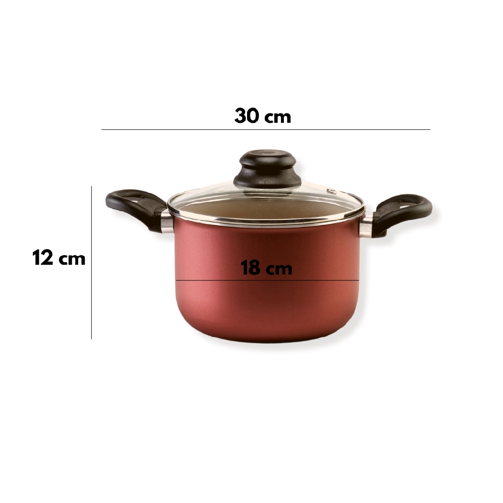 Caldeirão 18cm Cereja com Dourado Tampa de Vidro Alumi-Aço Linha Premium J4TECH Alumínio Antiaderente Teflon Ultra Resistente