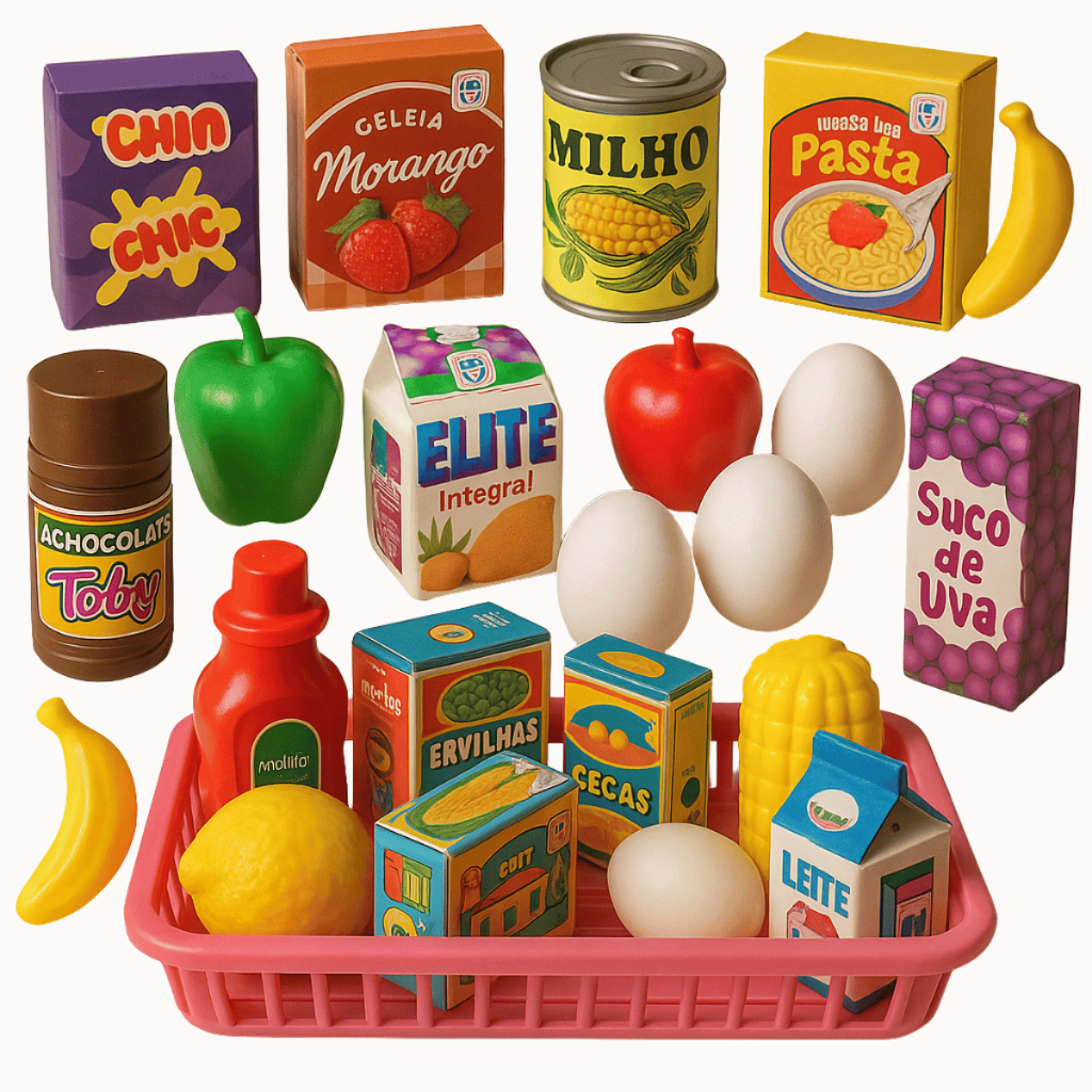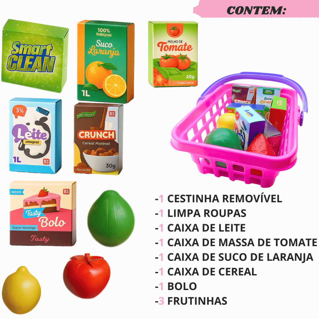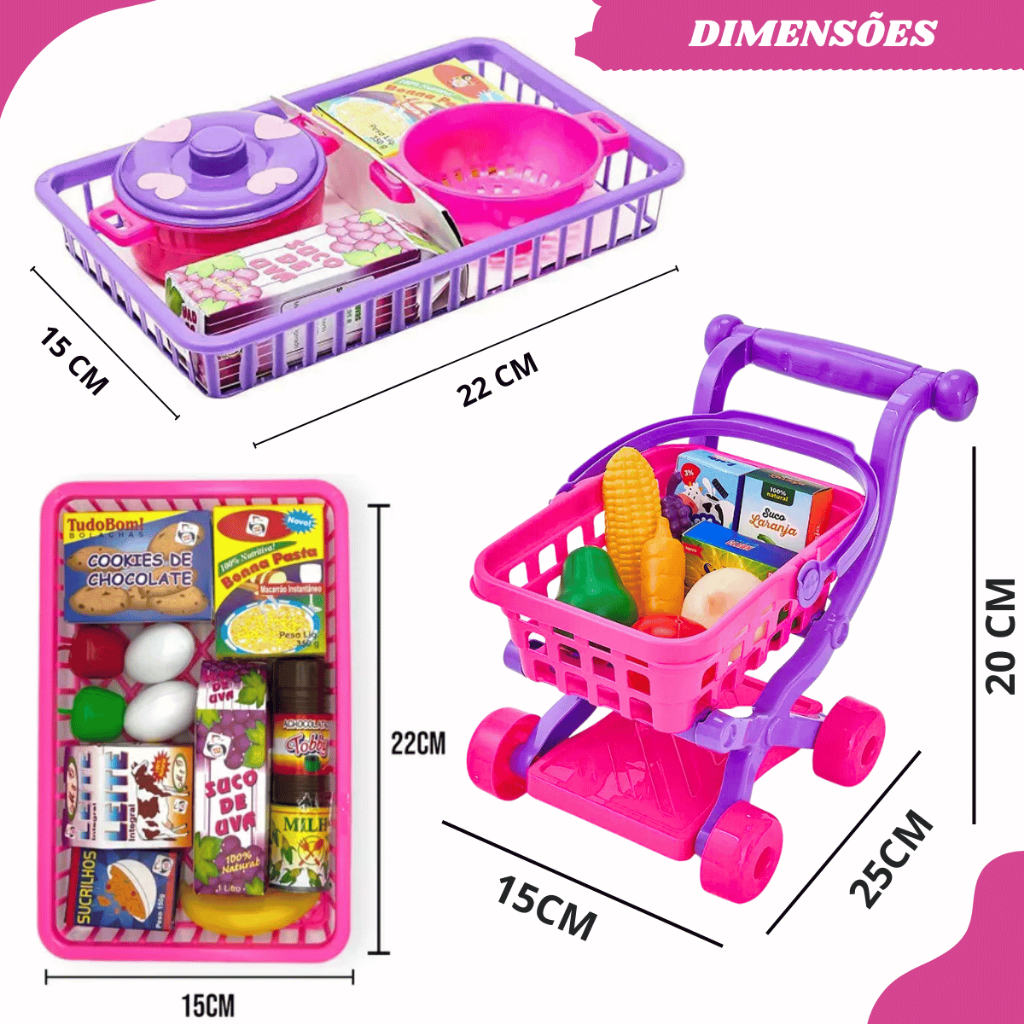 Kit Brinquedos Menina Carrinho Supermercado Cestinho Feirinha Conjunto Panelas Infantil Comidinha