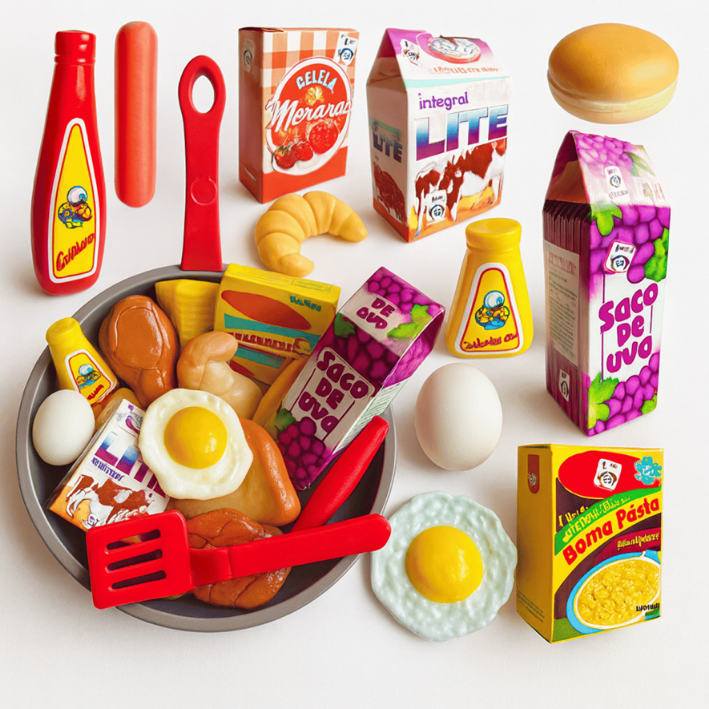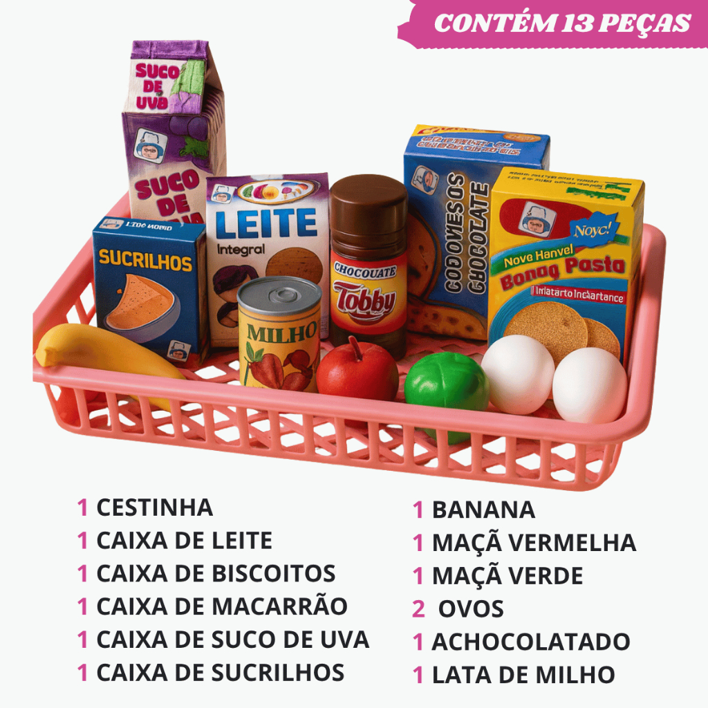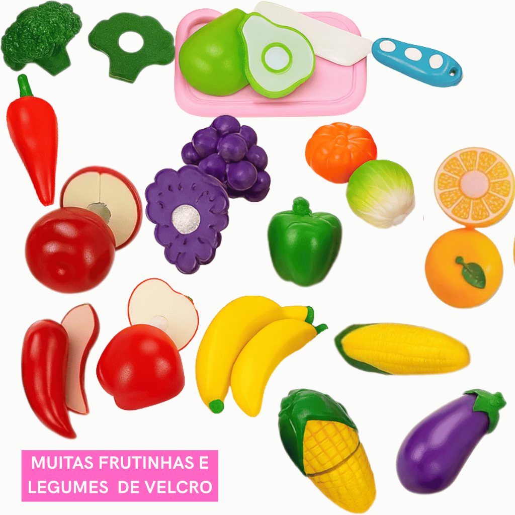 Cesta Mercado Frutas e Legumes de Cortar com Velcro + Frigideira C/ Comidinhas de Brinquedo Infantil