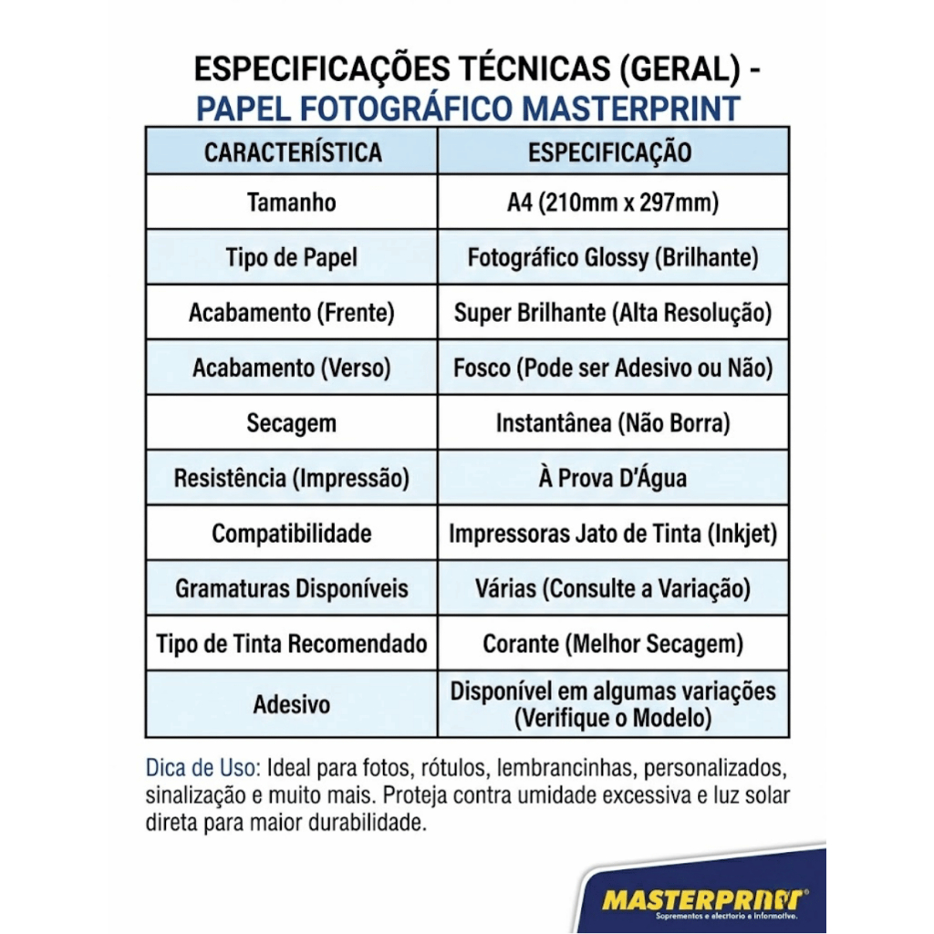 Papel Fotográfico A4 80/115/130/180/230g Premium Brilhante Glossy Adesivo À Prova D'água Masterprint