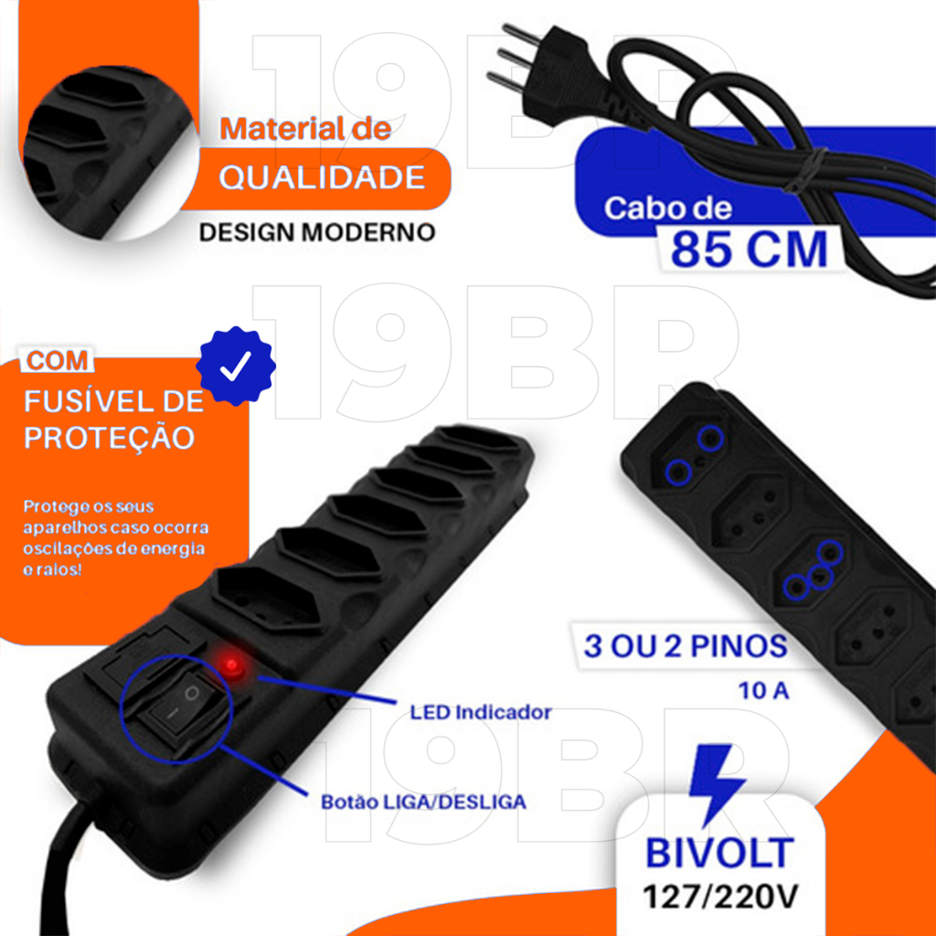 FILTRO DE LINHA RÉGUA DE TOMADAS 6, 5, 4 e 3 tomadas tripolar 10 Amperes com fusível