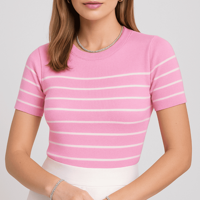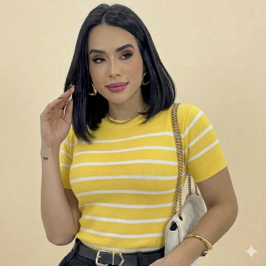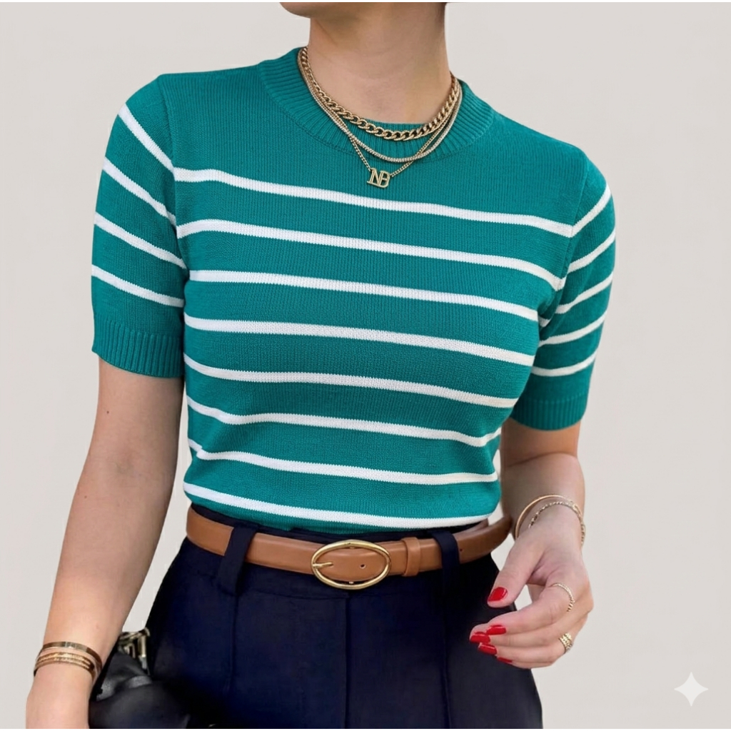 Blusa Feminina Listrada Casual Com Manga Curta Moda Trico Tendência 2025 Super Fresca e Leve