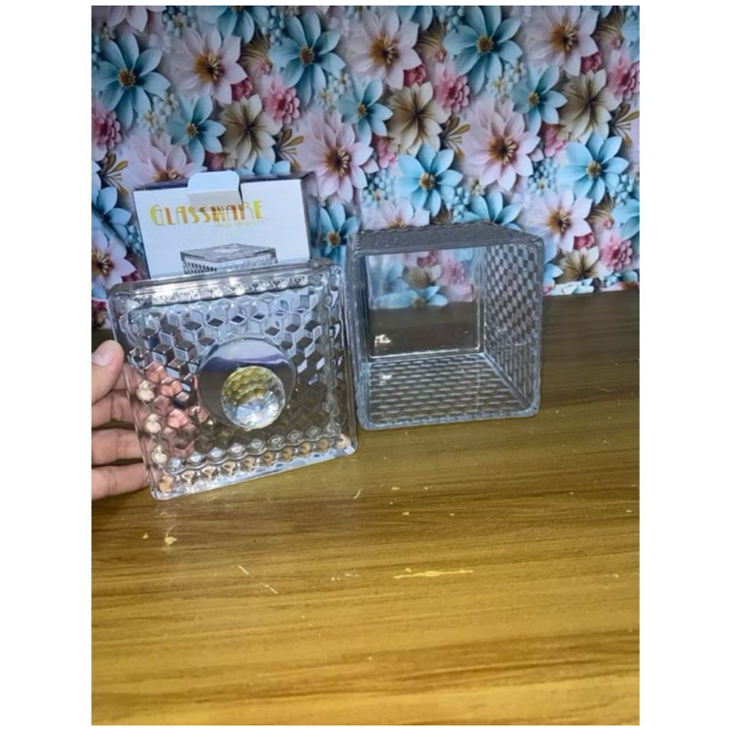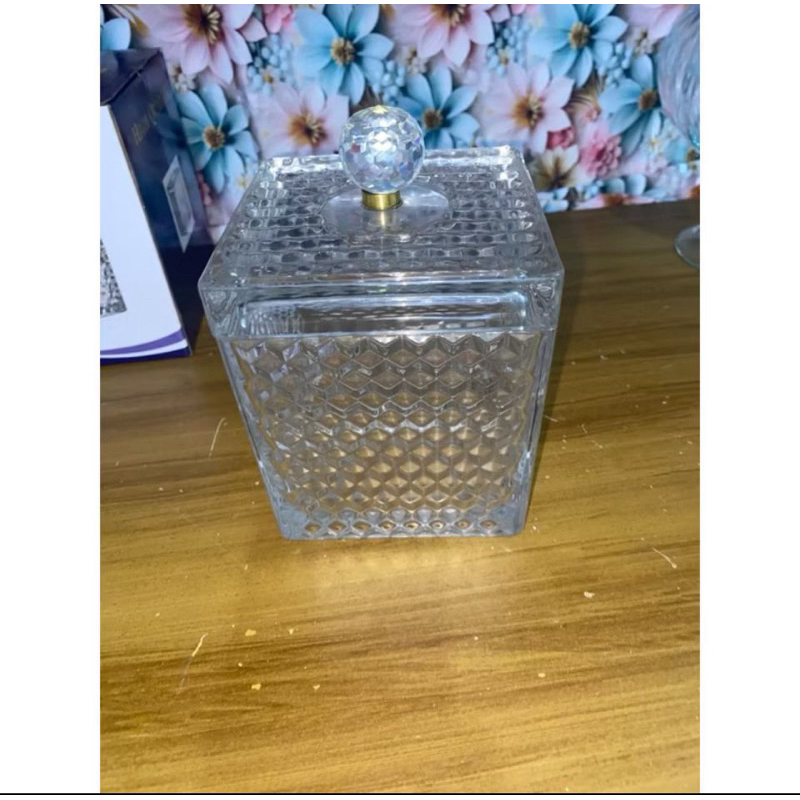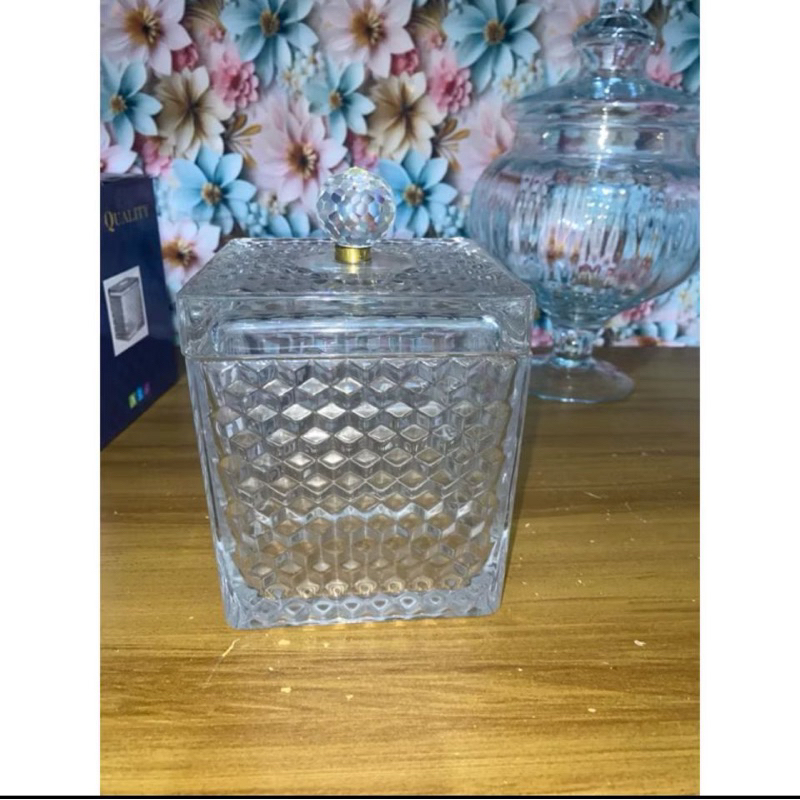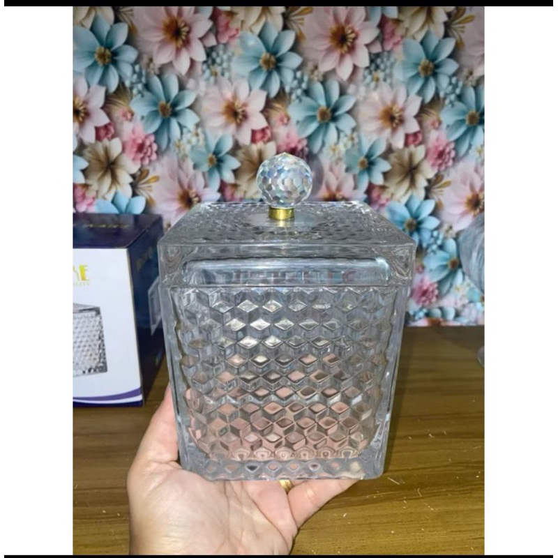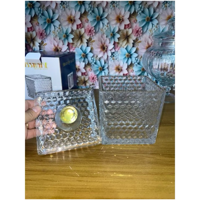 Bomboniere vidro espesso quadrada com tampa e pegador bolinha 20 cm