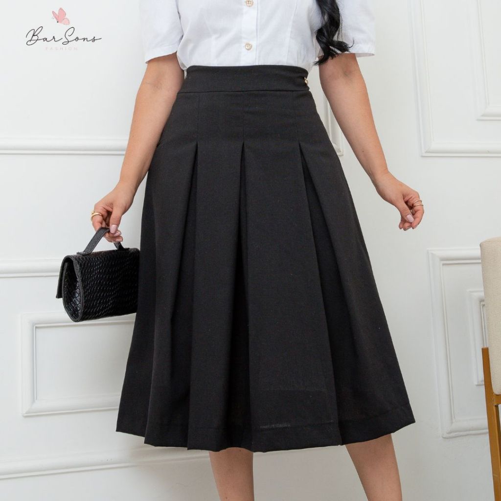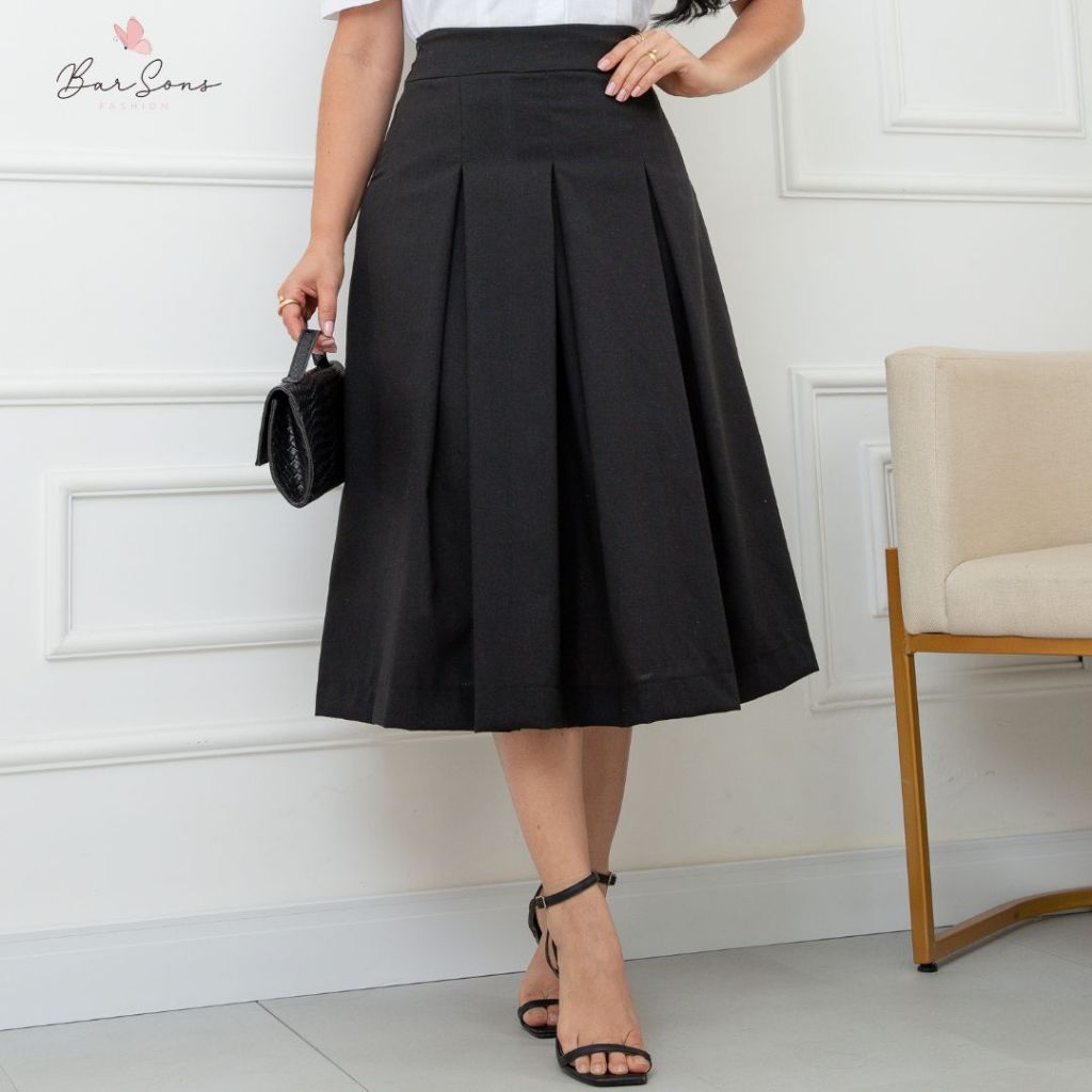 Saia Midi Godê Com Pregas em Linho Misto Moderna Moda Modesta Cristã Evangelica Elegante Premium - REF: Dalia