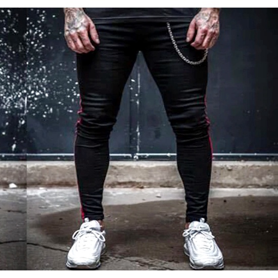 Calca Jeans Masculina slim com elastano preta listra faixa vermelha.