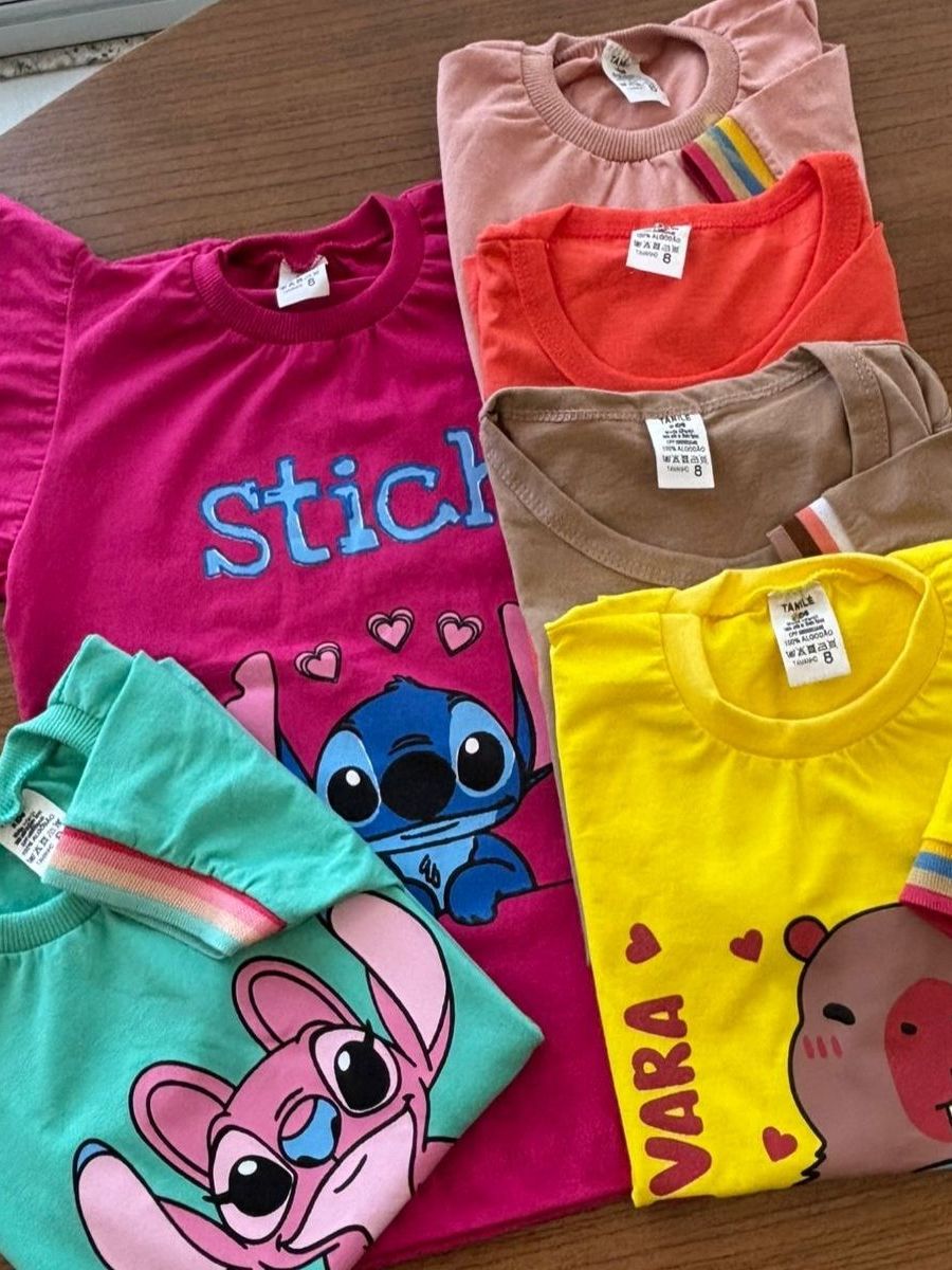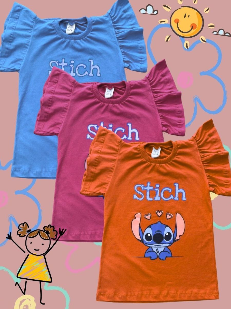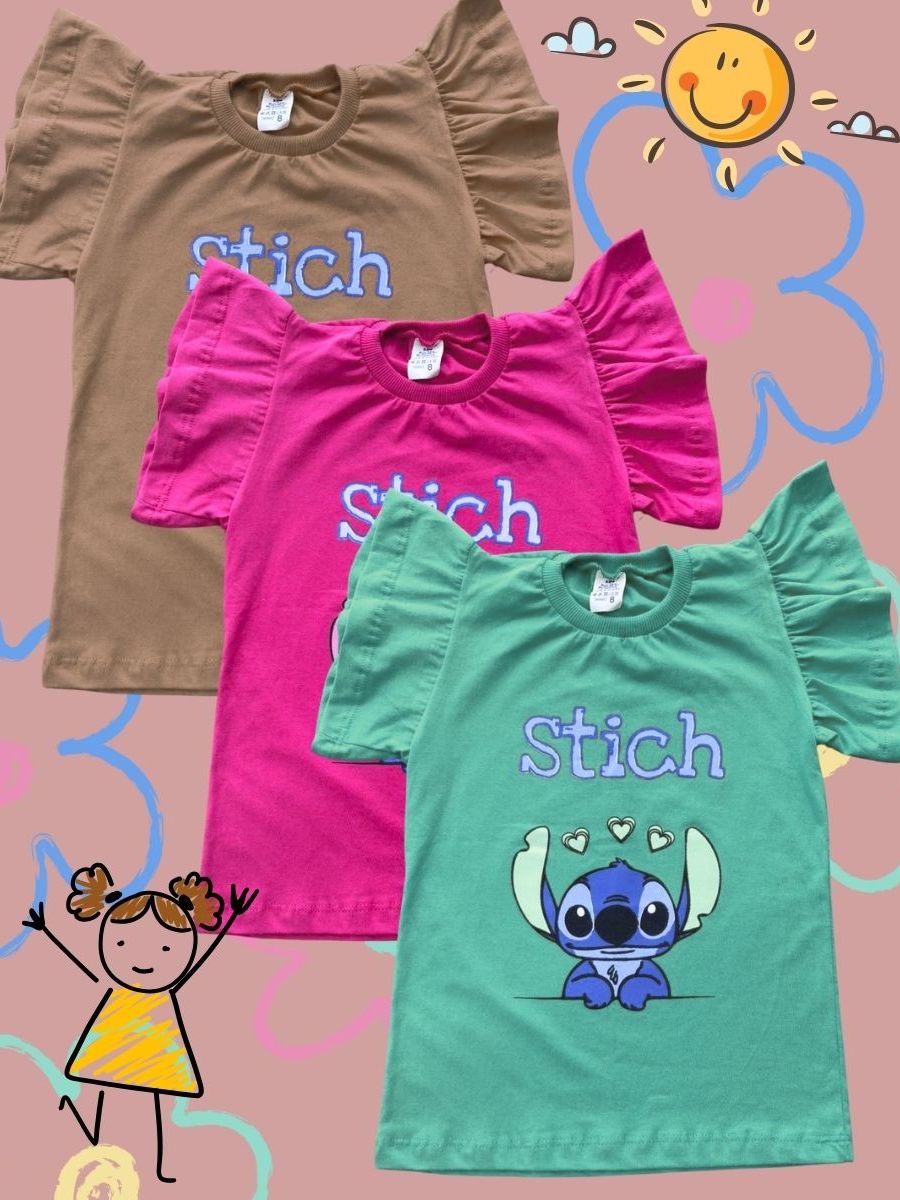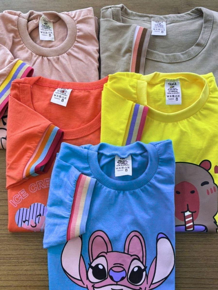 kit Com 5, Kit com 3 ou Kit com 2 Peças Tshirt infantil blusinha feminina manguinha bufante + barrinha colorida estampas