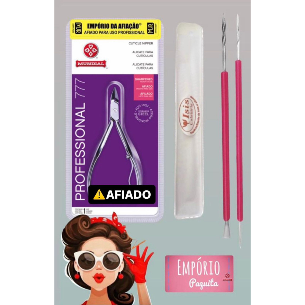 ALICATE MUNDIAL 777 INOX + ESPATULA (BASTAO MISTA) + PALITO ISIS CUTELARIA MANICURE UNHA PODOLOGIA