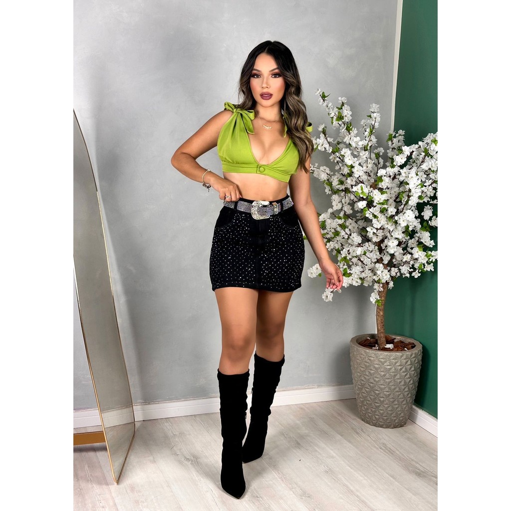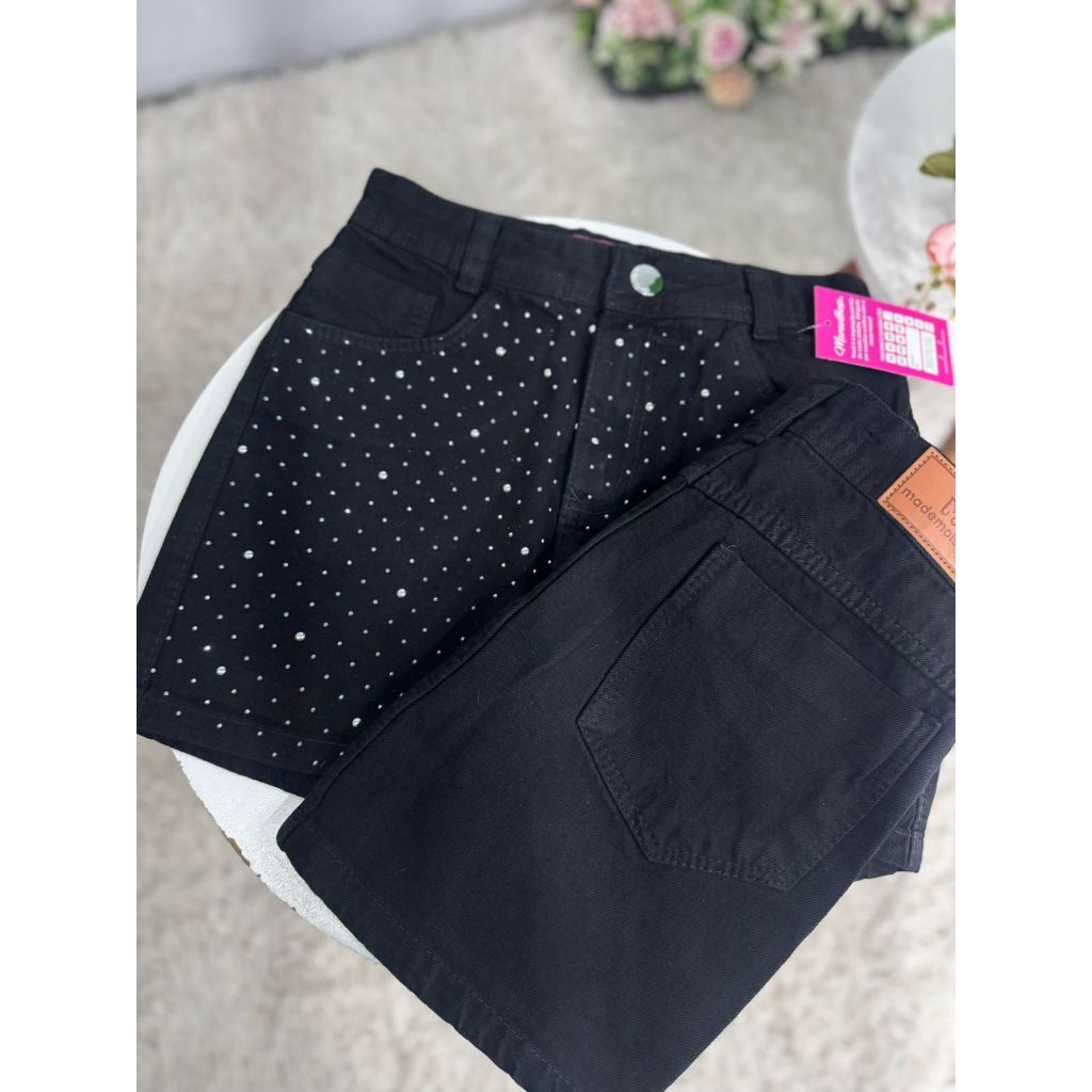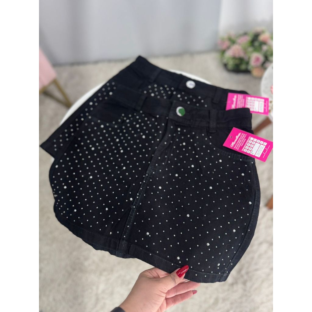 Saia Jeans Feminina Cintura Alta Preta Com Detalhes De Strass e Barra | 100% Algodão - Sem Elastano