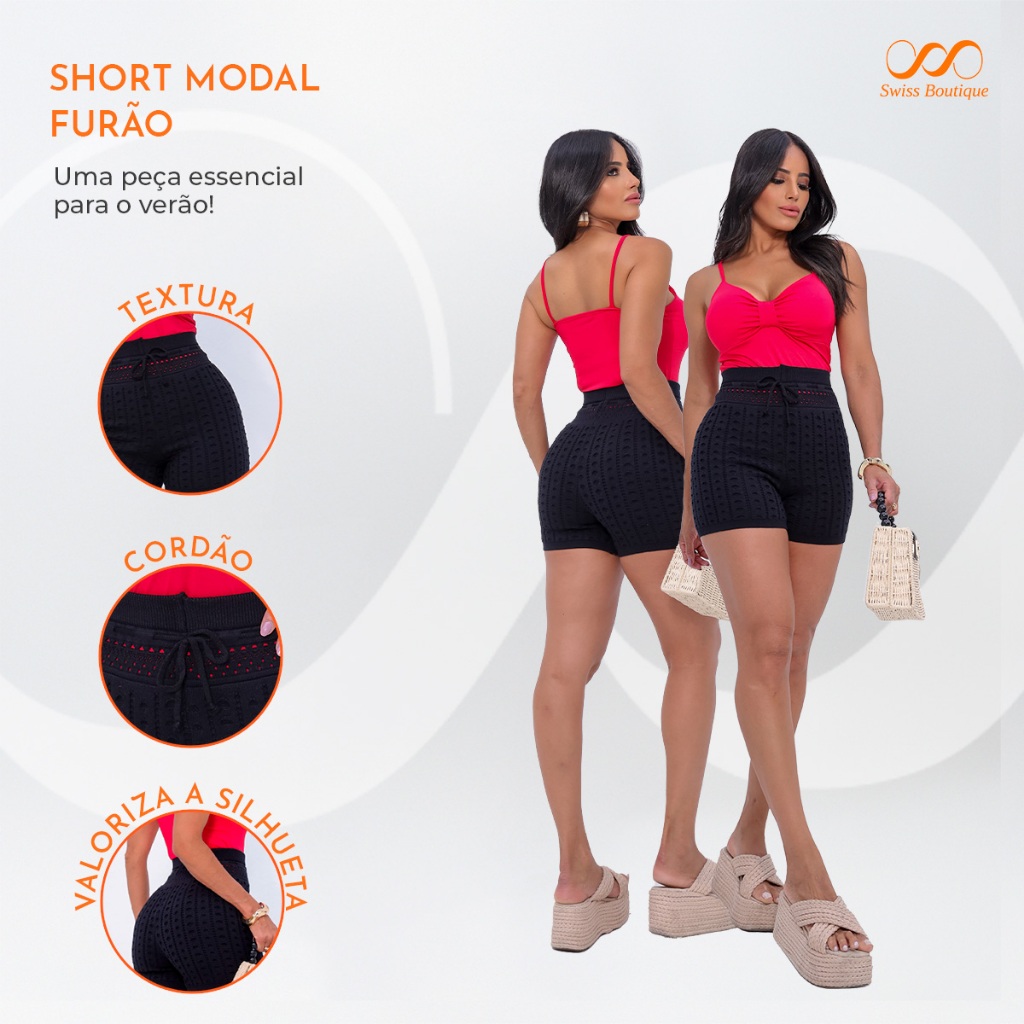 Short Feminino Curto Tricot Modal Vazado Top Moda Praia Luxo Verão Carnaval 2026