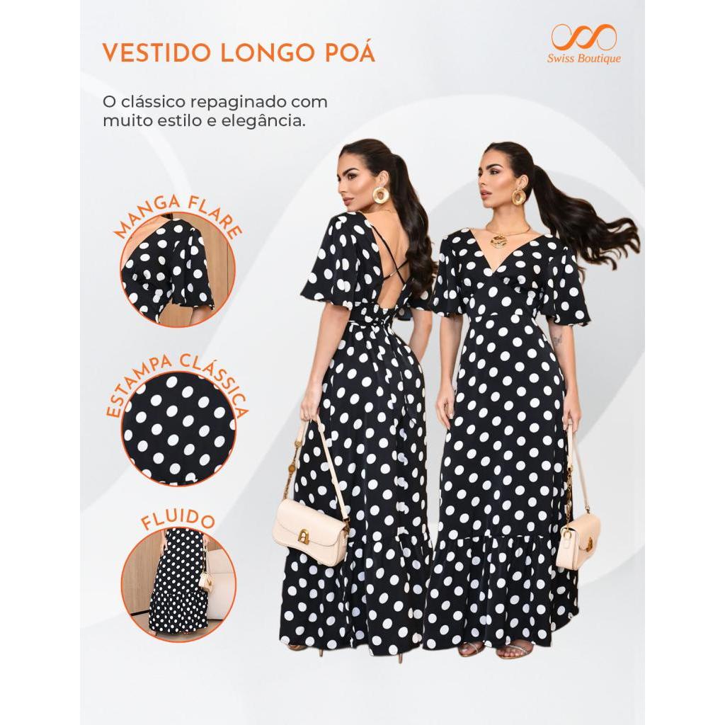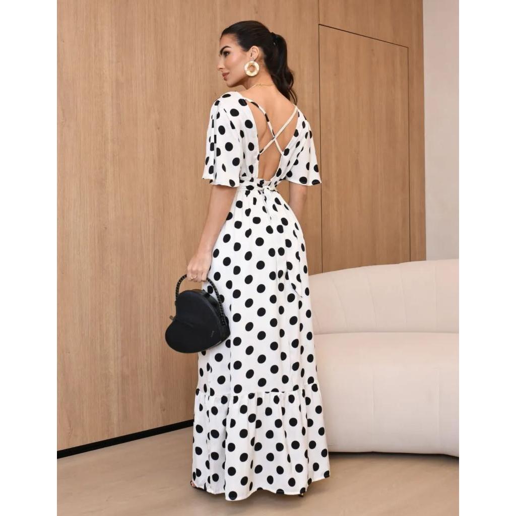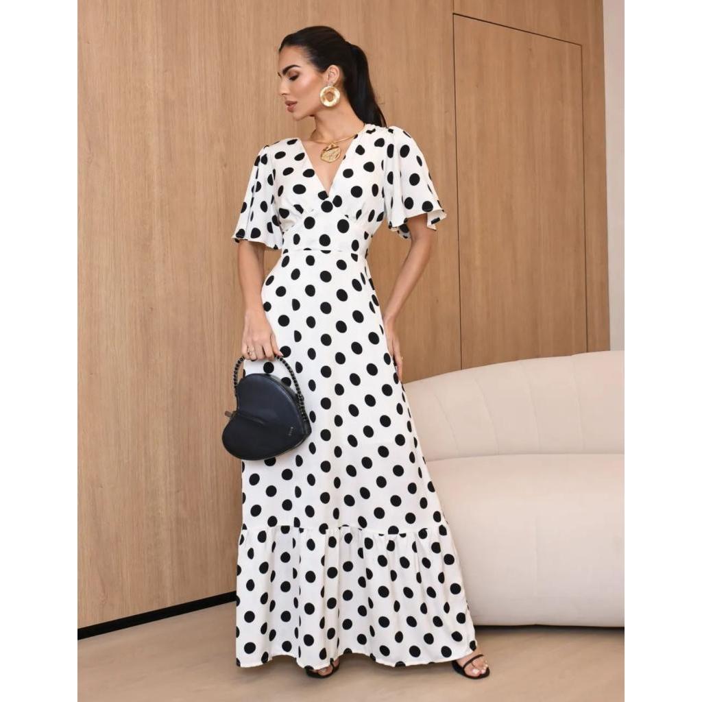 Vestido Feminino Longo Soltinho Manga Flare Póa Bolinhas Casual Elegante