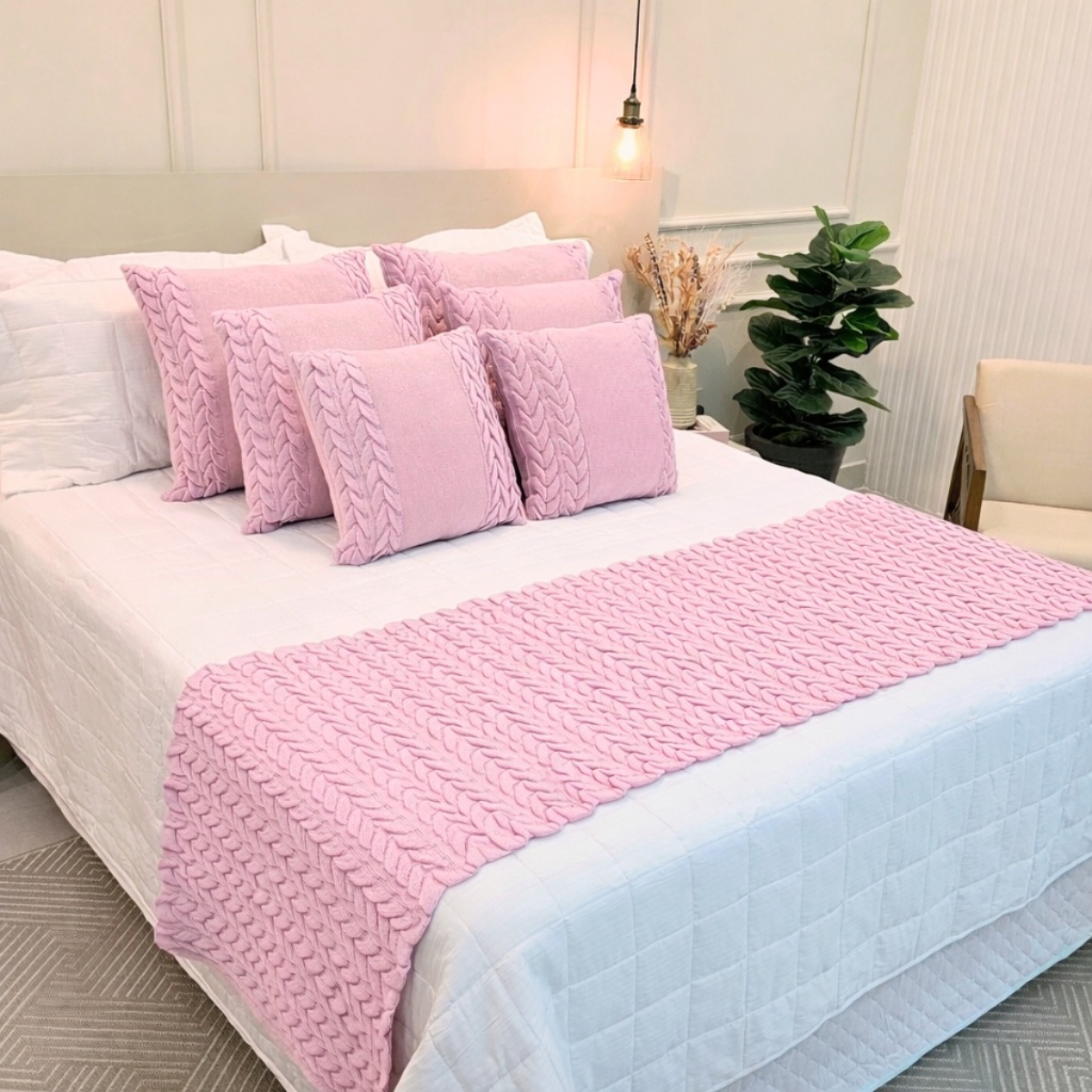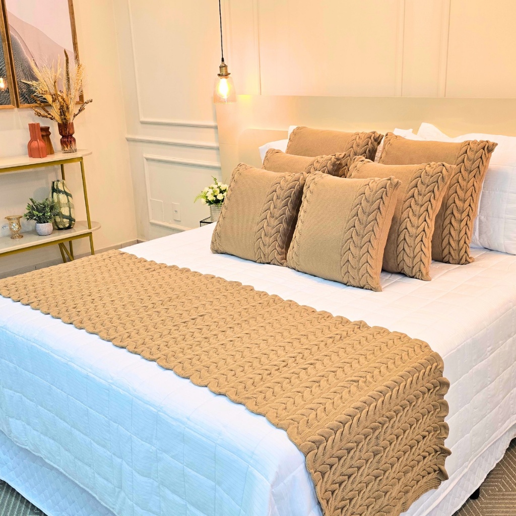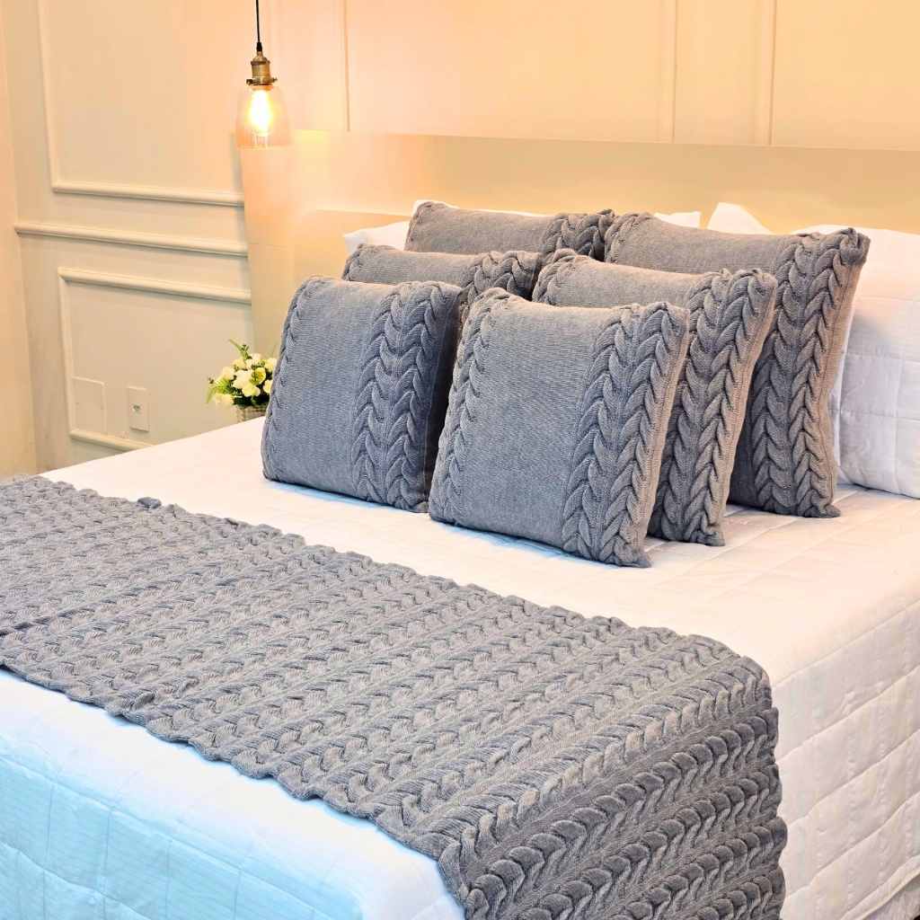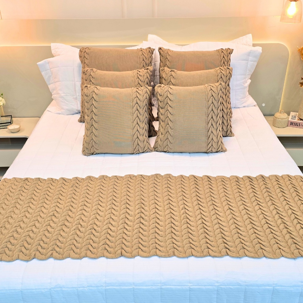 Kit Peseira Manta Tricot Sofá Cama Casal Queen King Aconchego Home Decor + 4 Capas Almofadas (2 de 50x50 e 2 de 60x60)