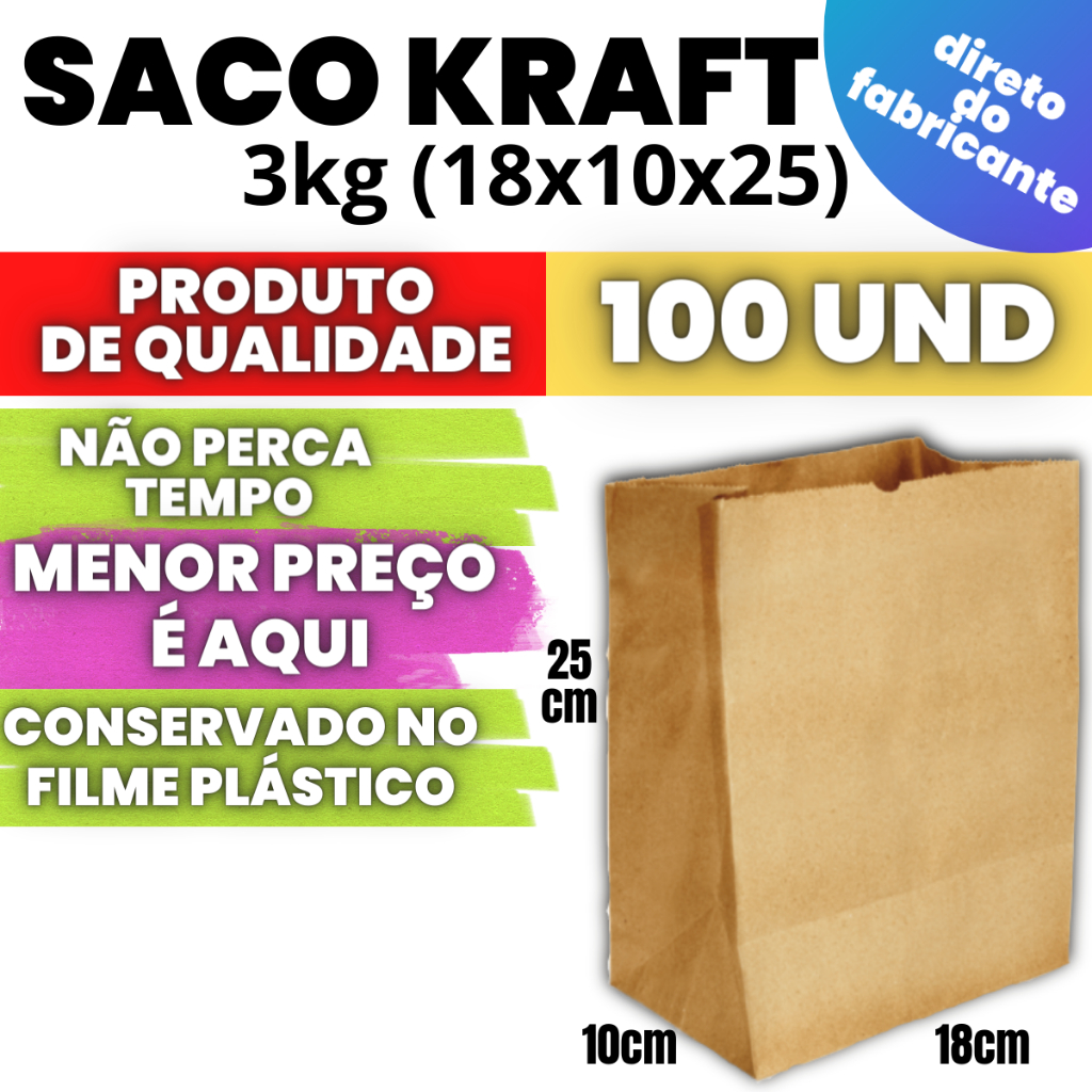 Saco Kraft Embalagem SOS Para Delivery 3KG Com 100 Und 25x18x10