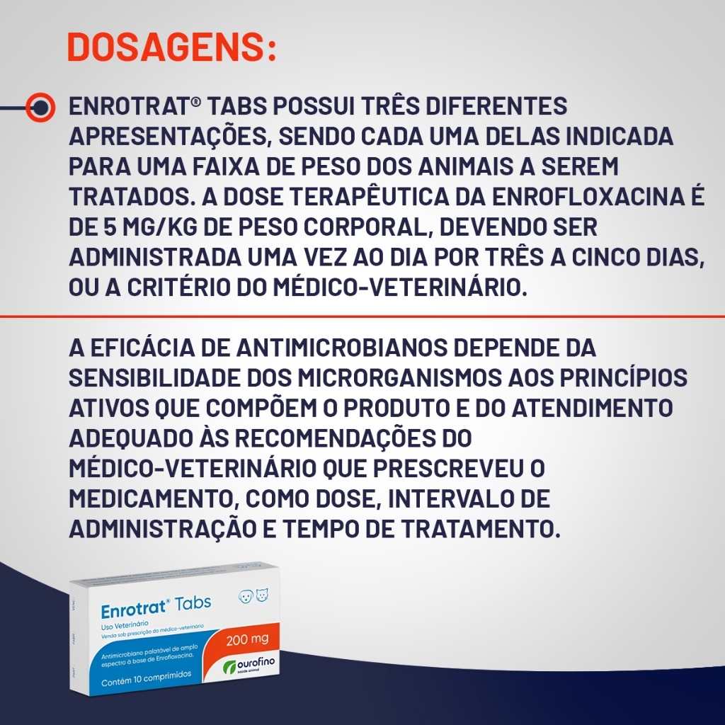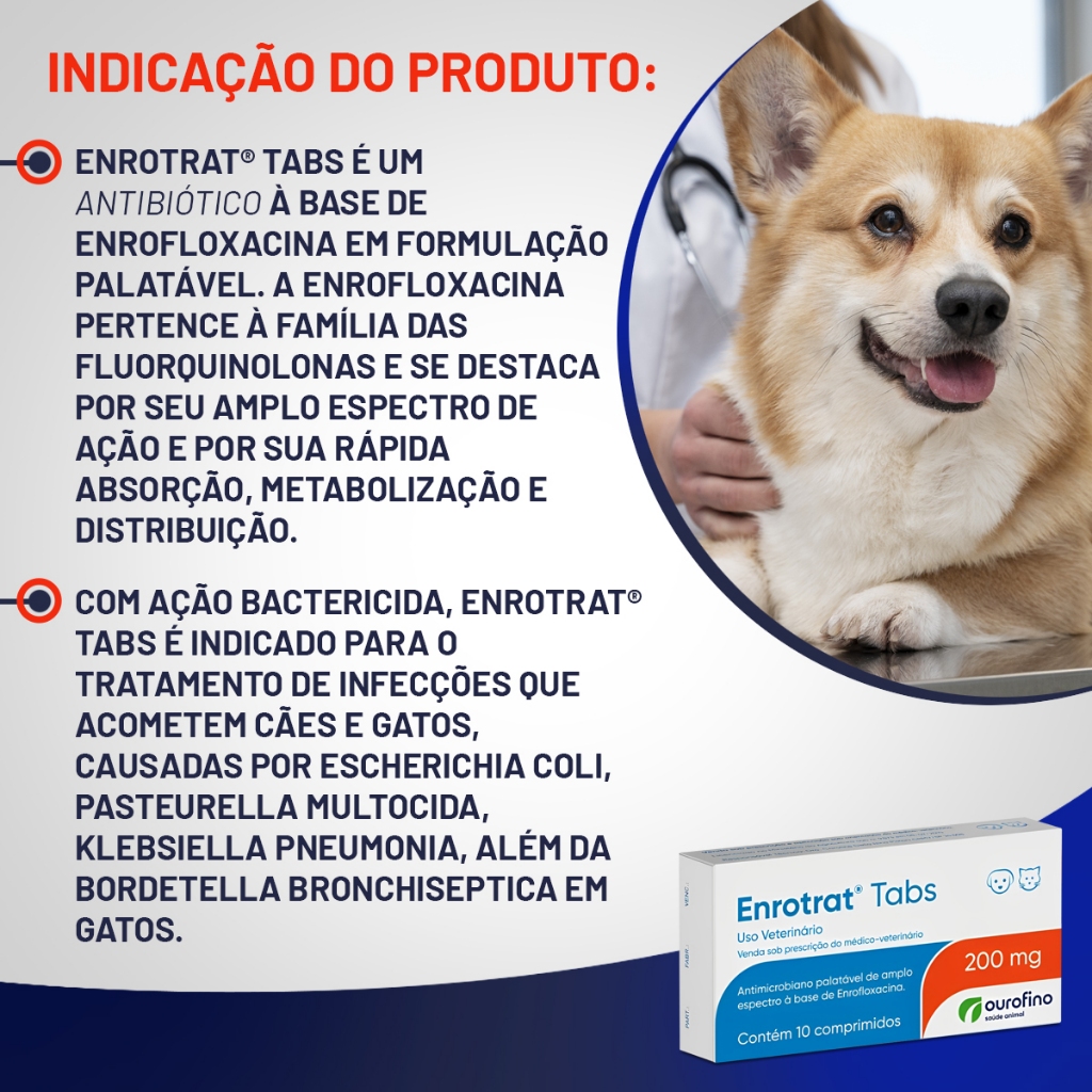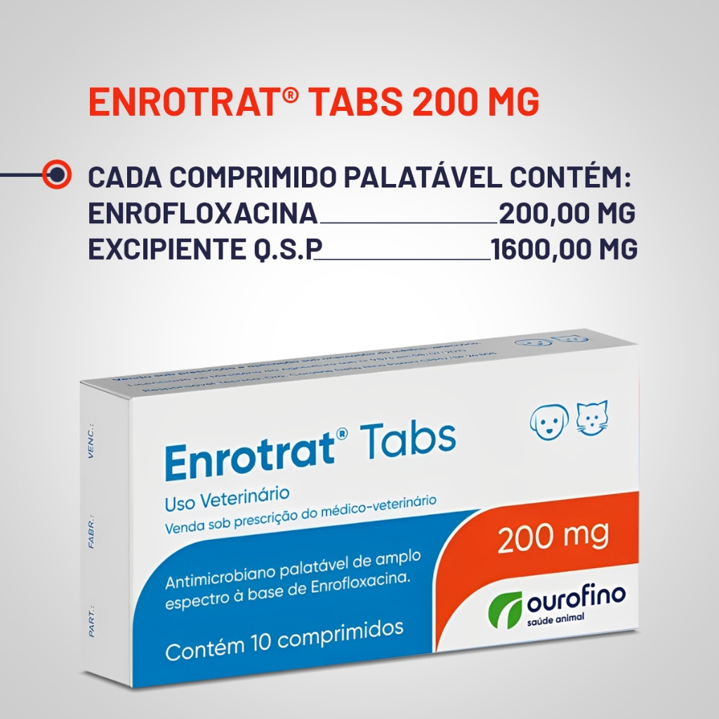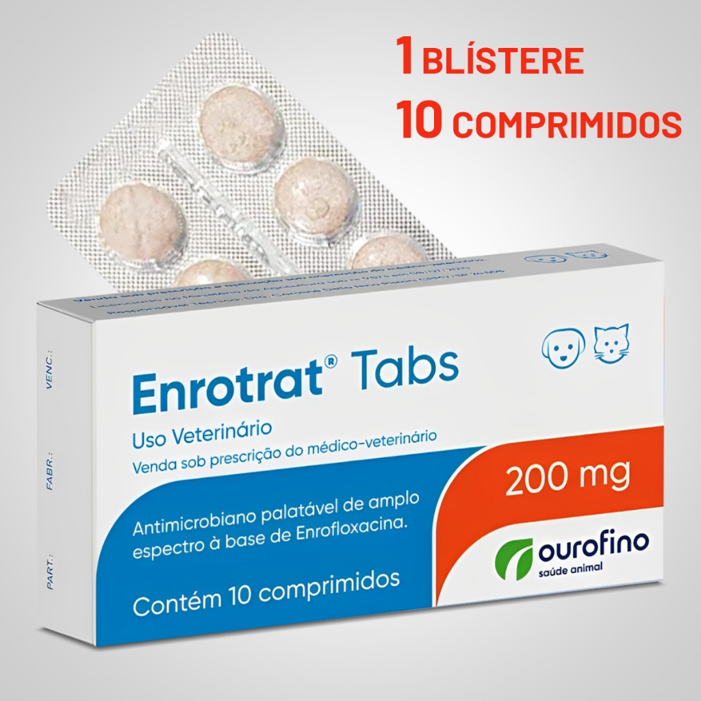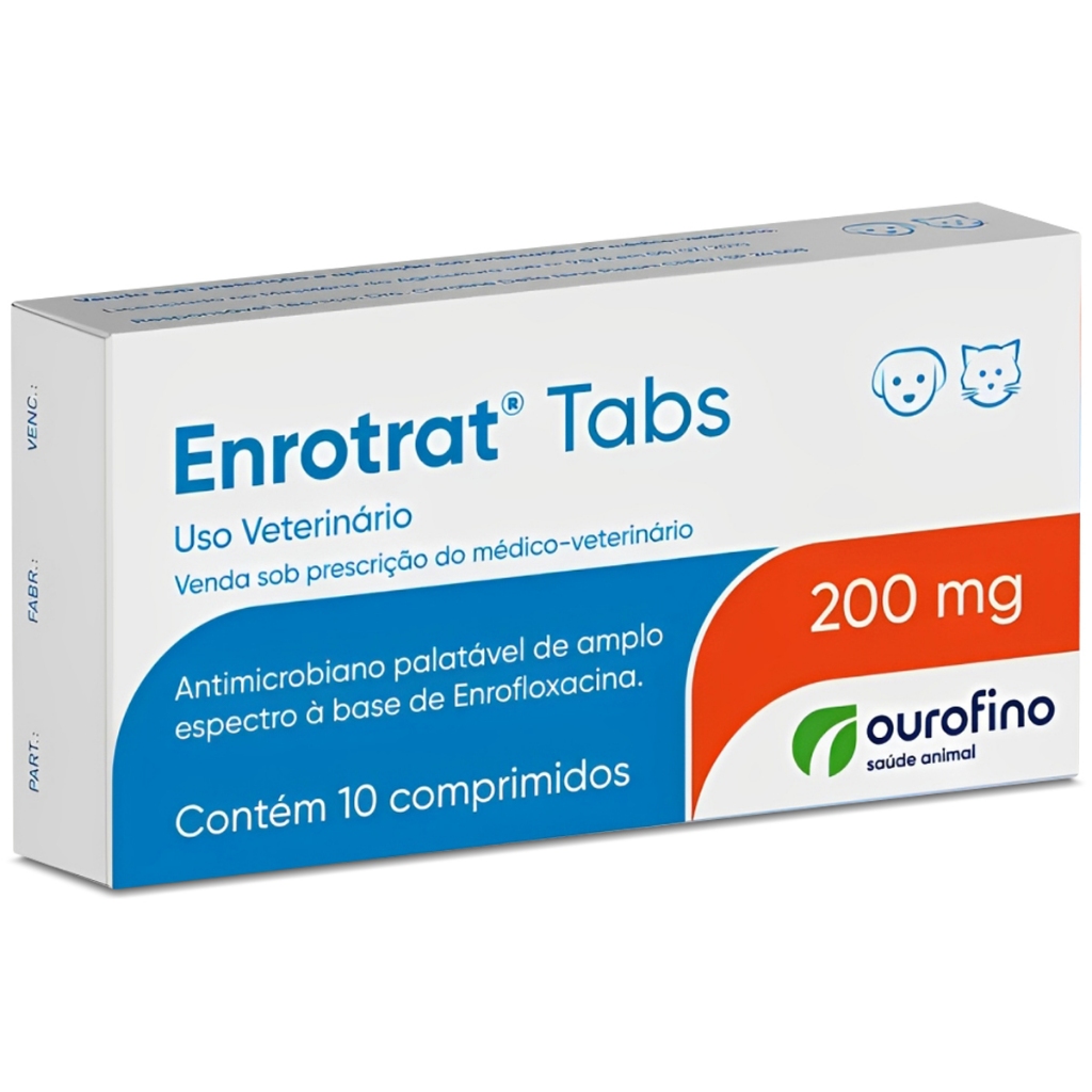 Antibiótico Enrotrat Tabs 200mg Ourofino para Cães e Gatos - 10 Comprimidos