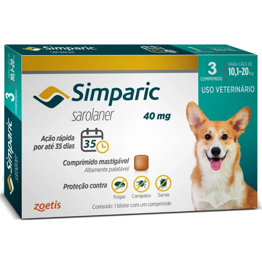 Simparic Zoetis 40mg Antipulgas Carrapatos Sarnas Cães 1,3 a 40kg 3 Comprimidos