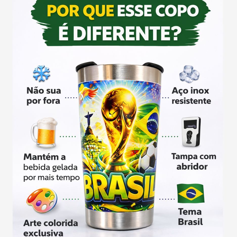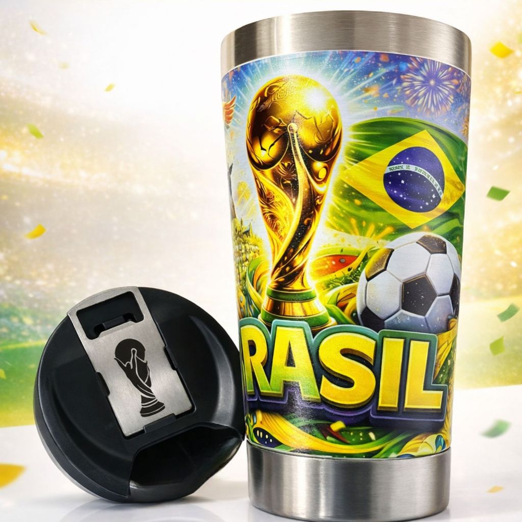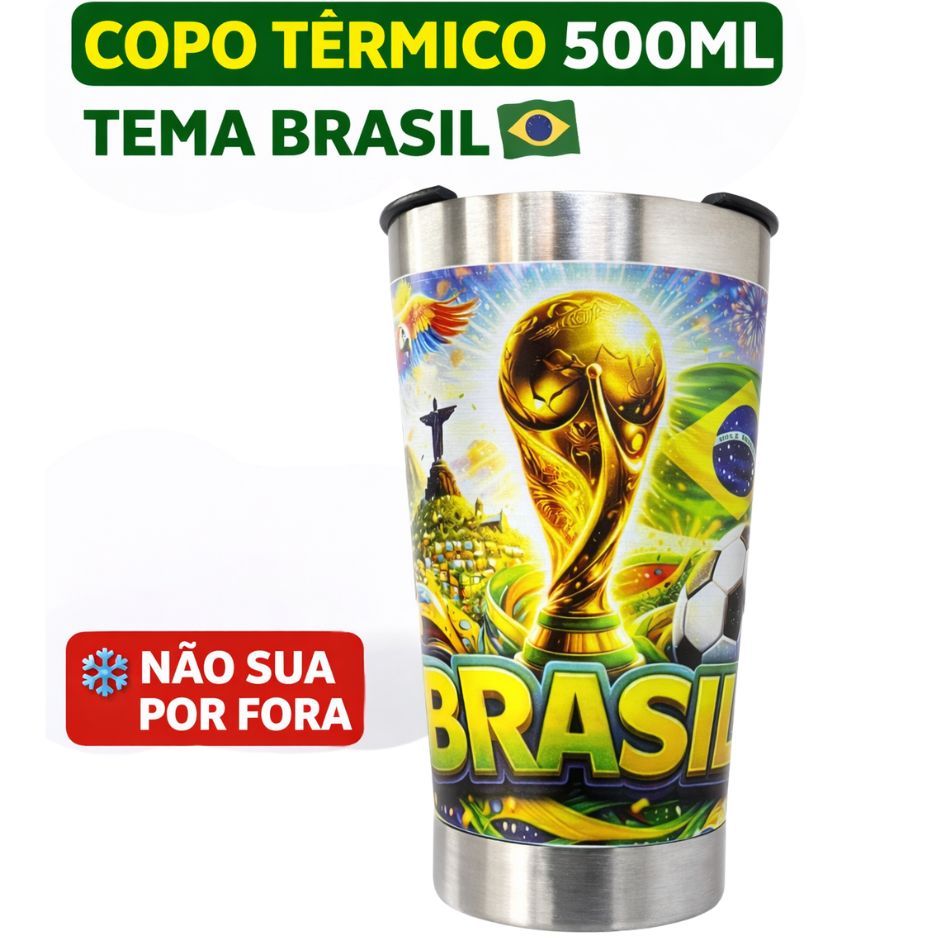 Copo Térmico Brasil 500ml Inox Tampa com Abridor Futebol Copa Cerveja Gelada Bebida Térmica Torcedor