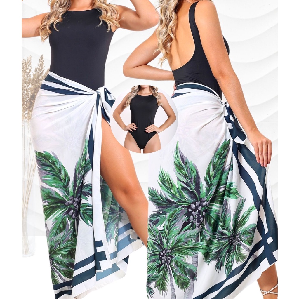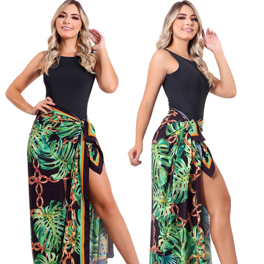 Maio Preto Moda Praia Conjunto Com Bojo Forrado No Busto Saida de Praia Pareô Canga EstampadaModa