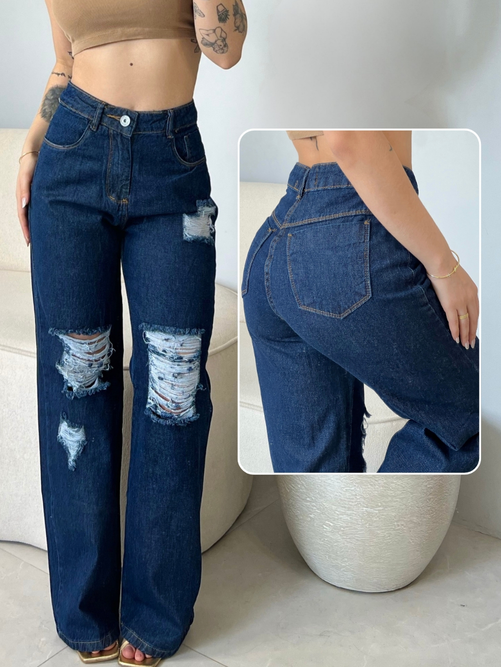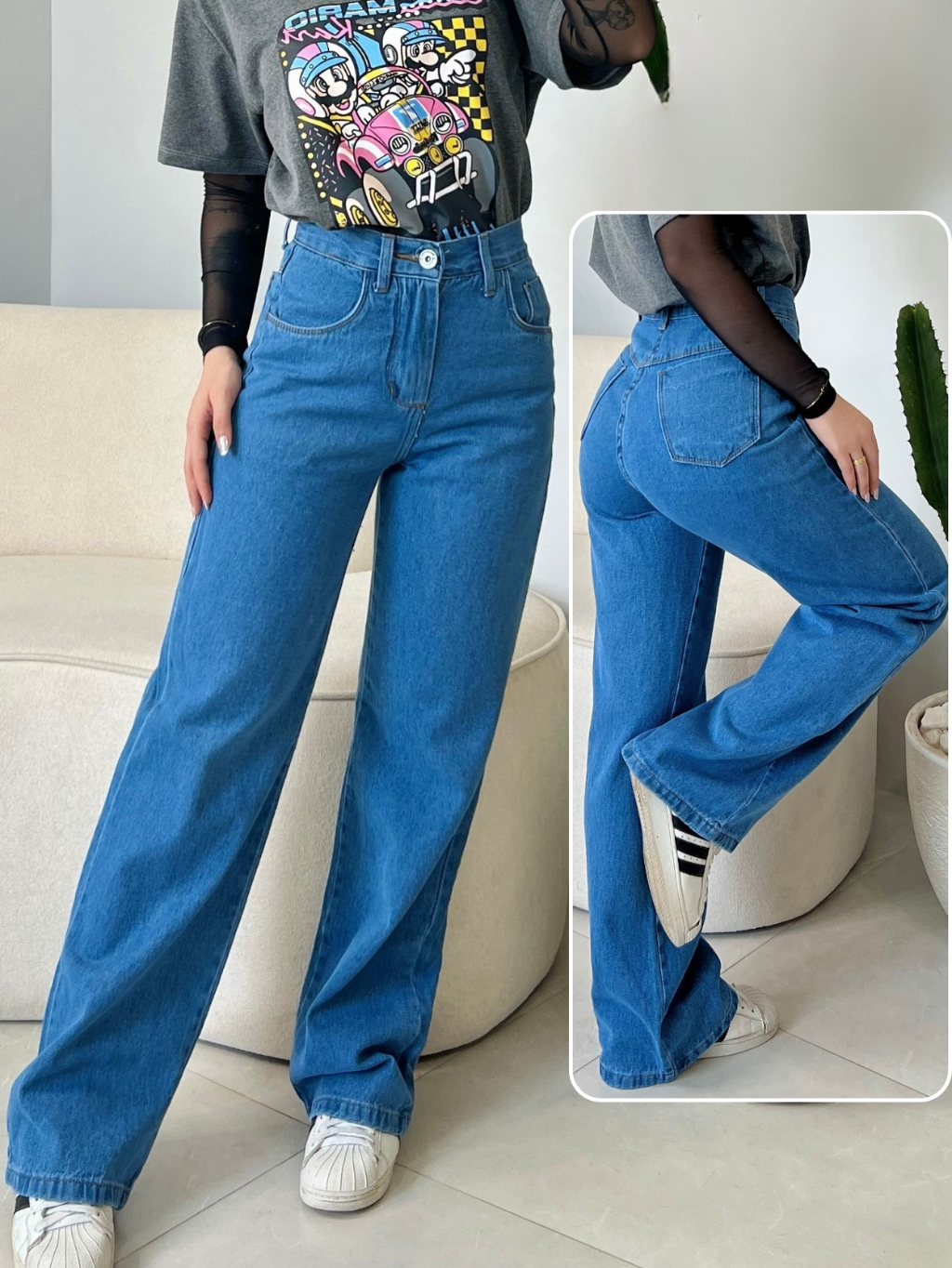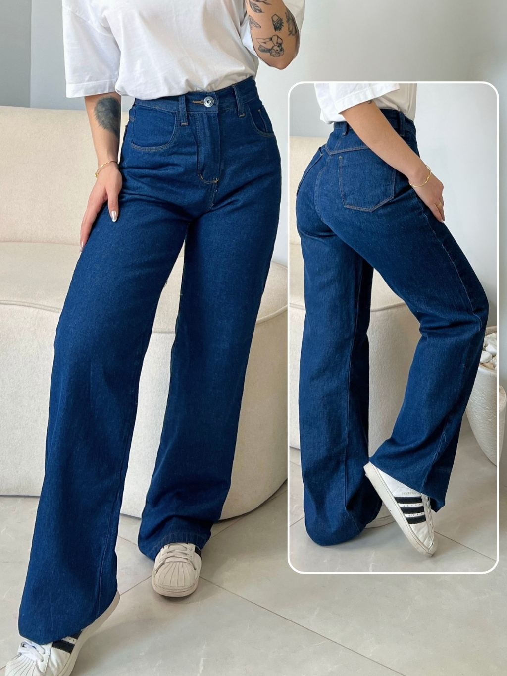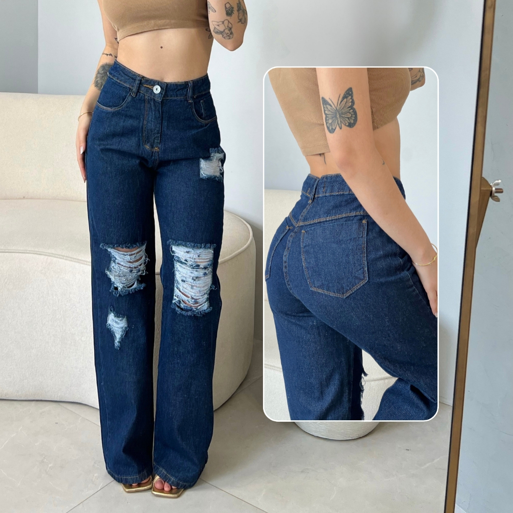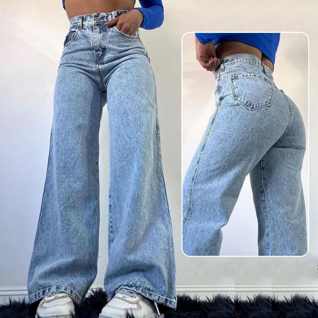 Calça Jeans Feminina Wide Leg Cintura Alta 100% Algodão