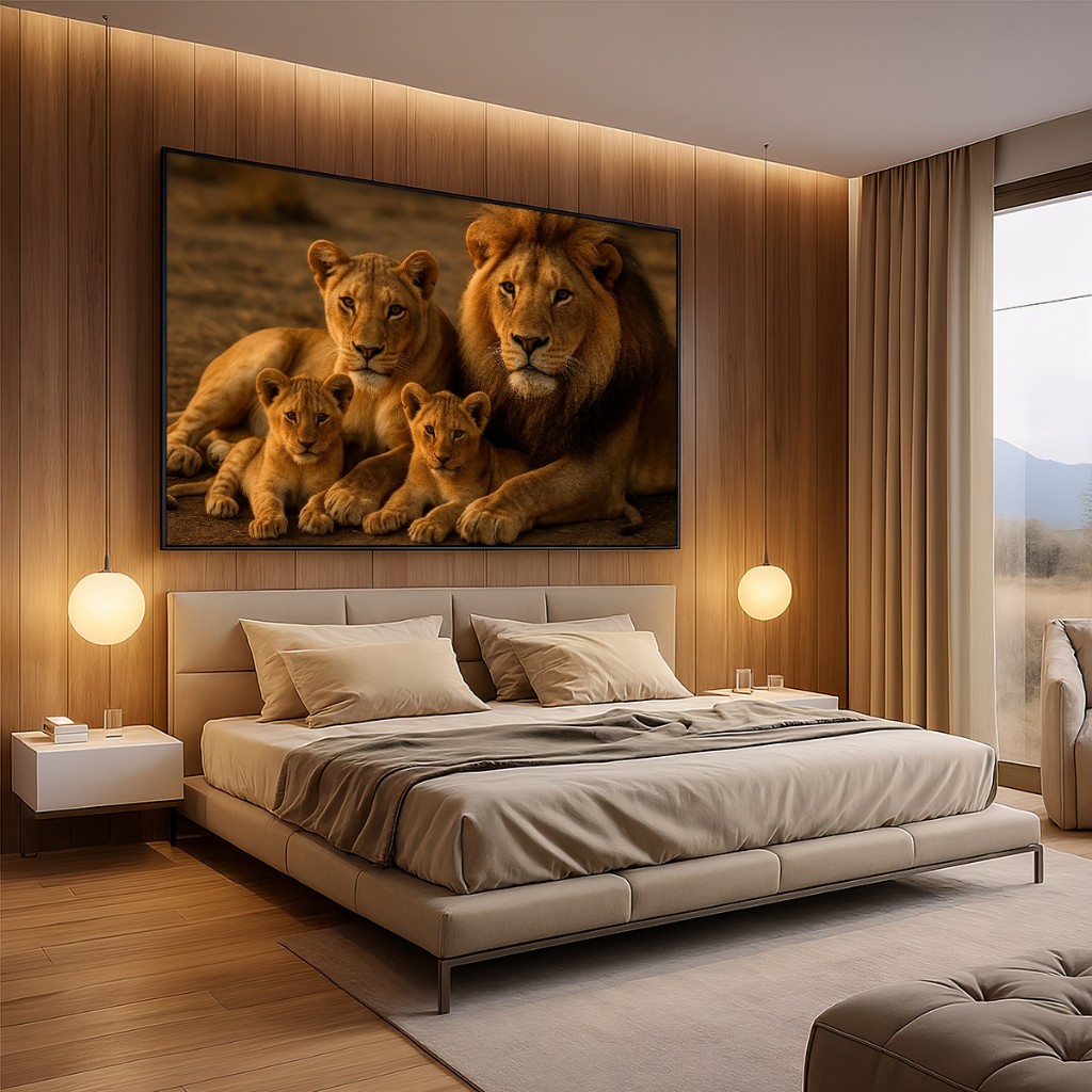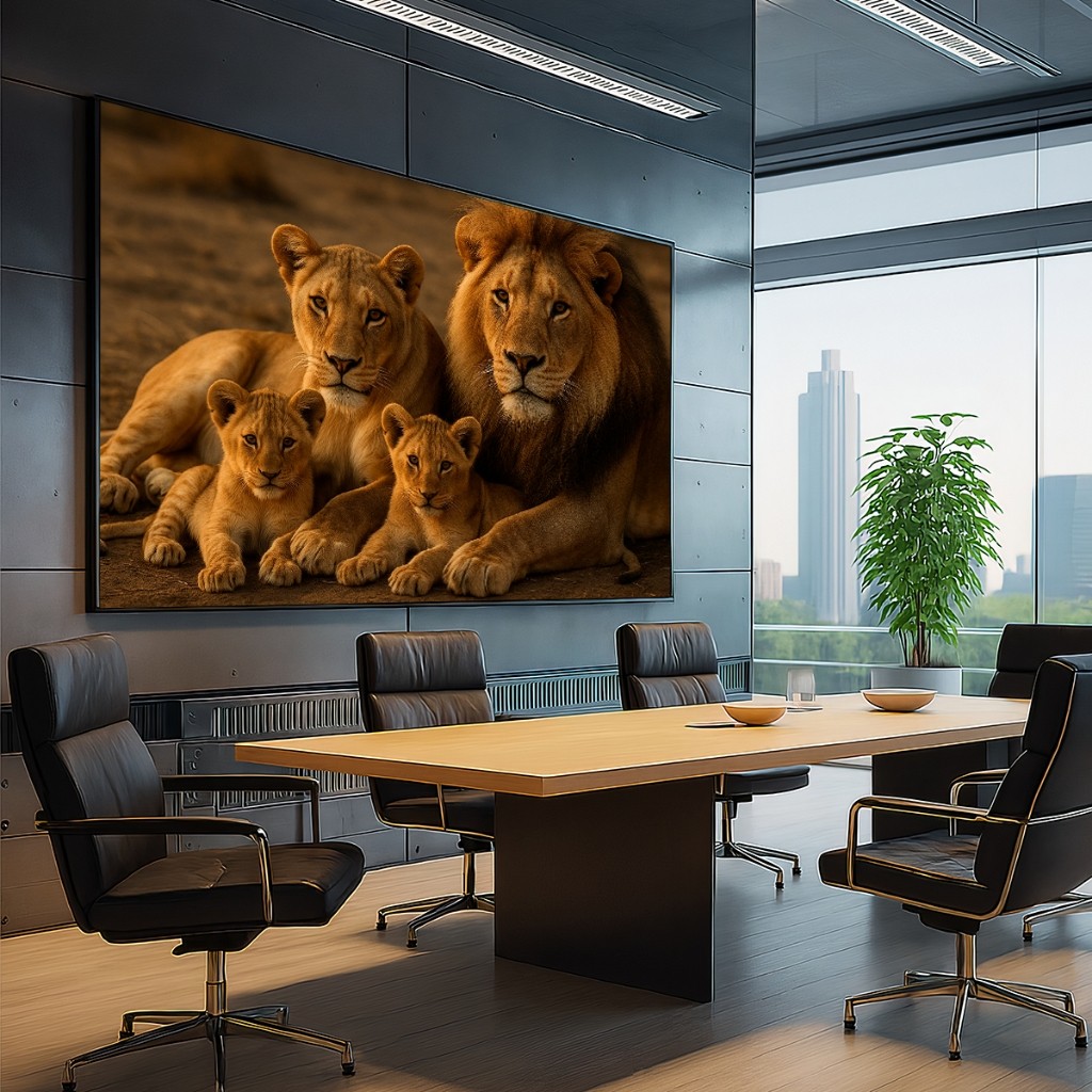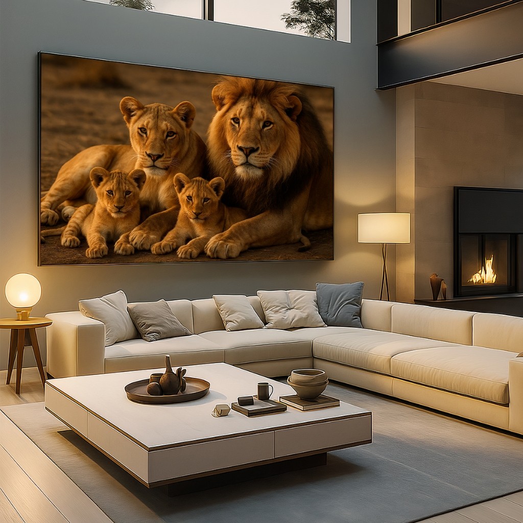 Quadro Decorativo GRANDE Alta Resolução Escritório Quadro Familia de Leão com 2 filhotes horizontal