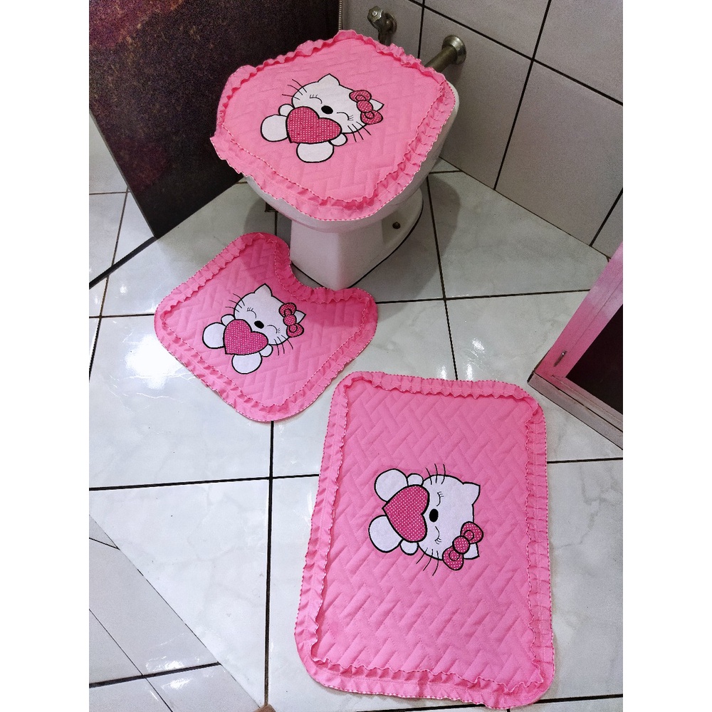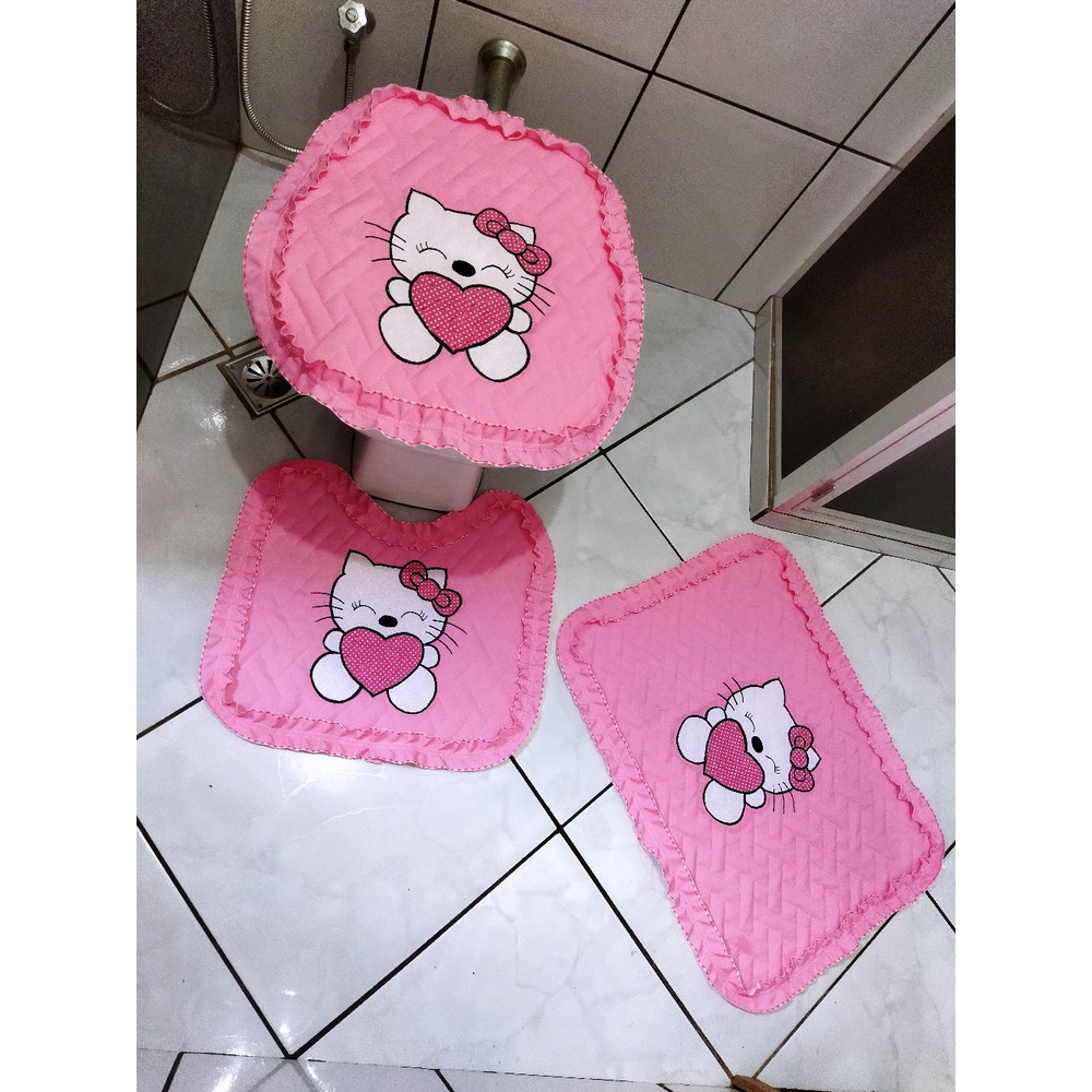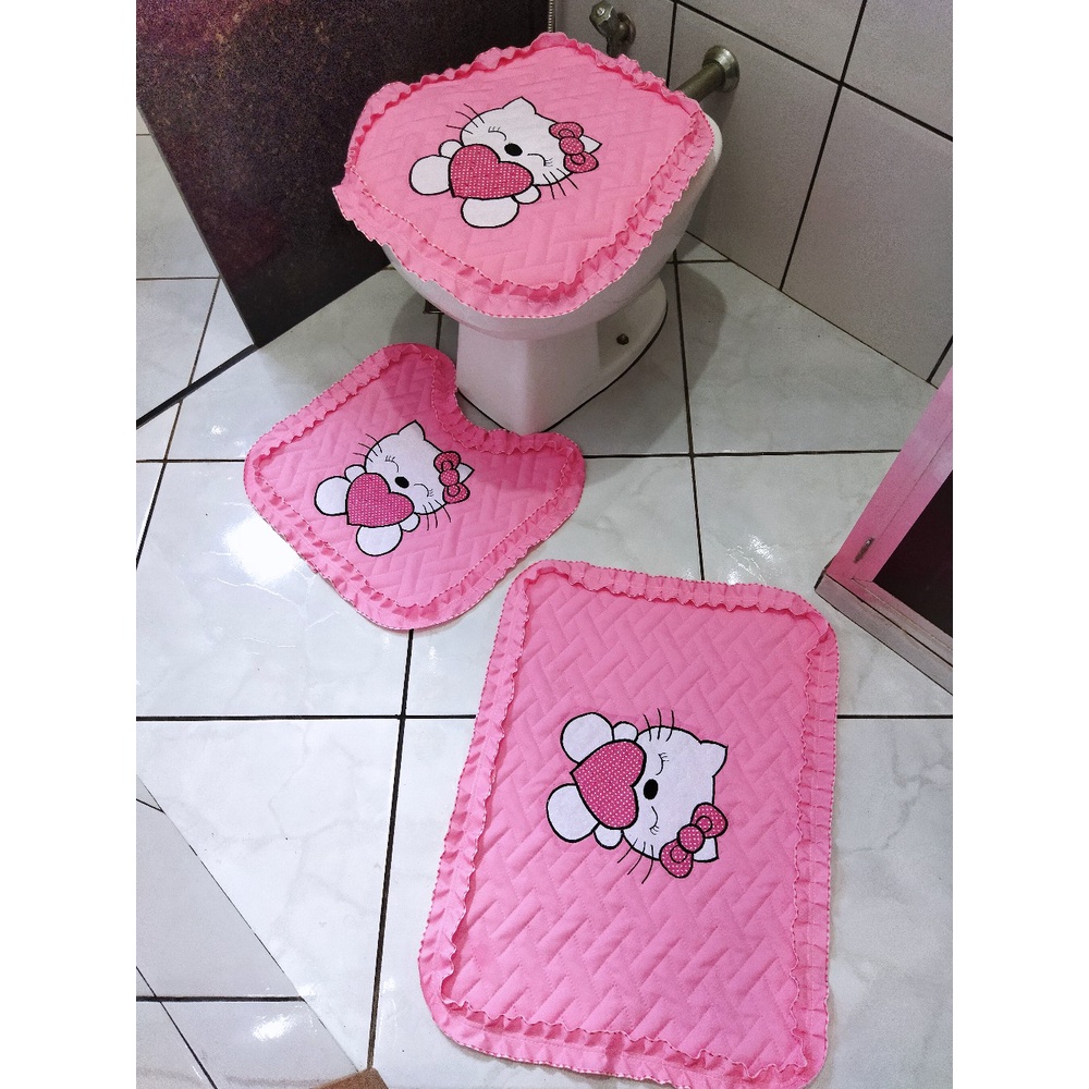 Jogo de banheiro Hello Kitty fofo 3 peças tecido metalassê com coração de bolinha laço fofo