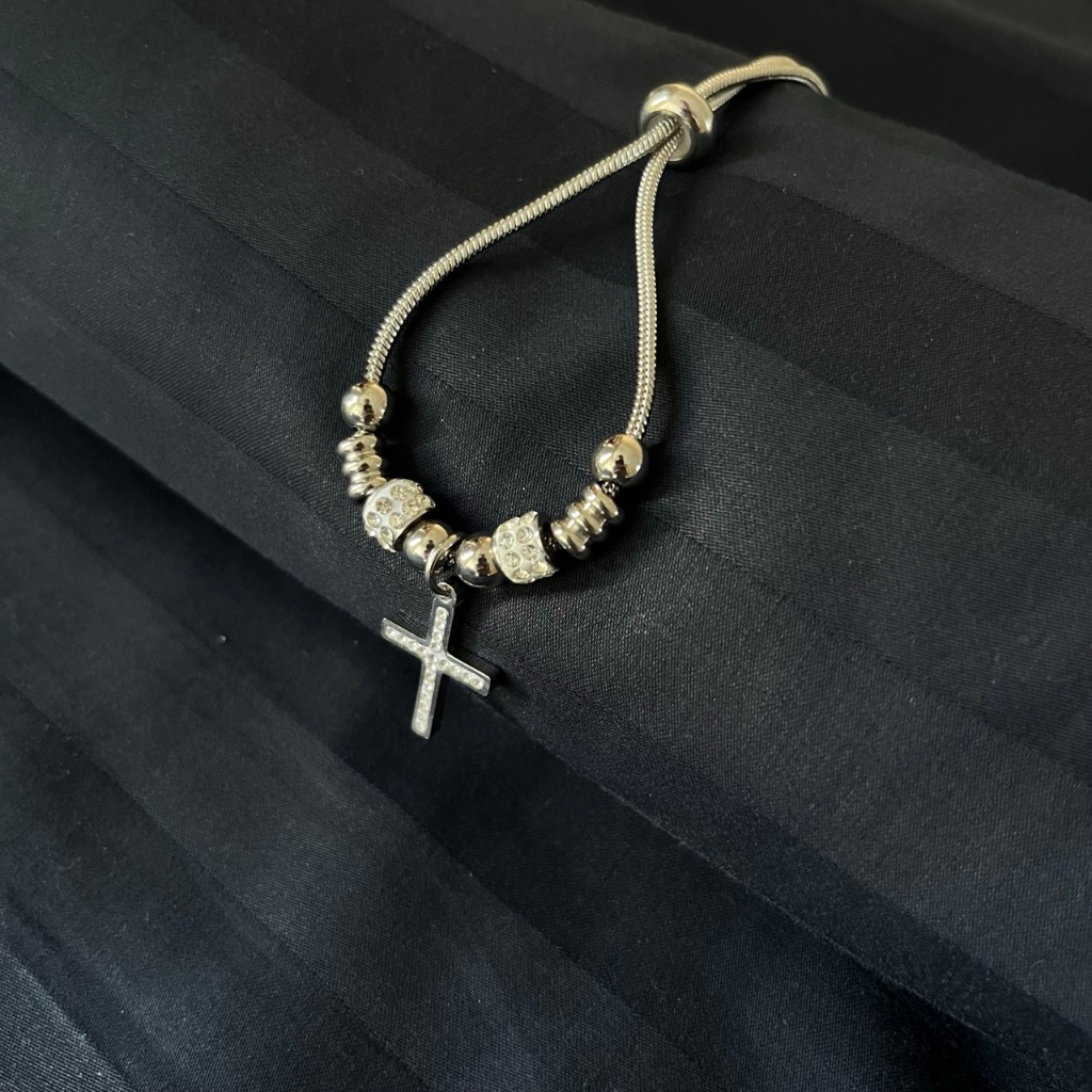 Pulseira com Cruz, Regulável em Aço Inox 316L – Bolo Tie, Prateada, com Brilho