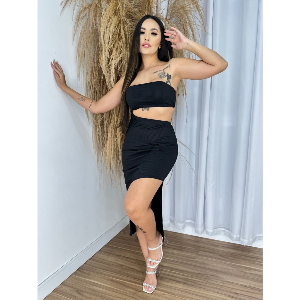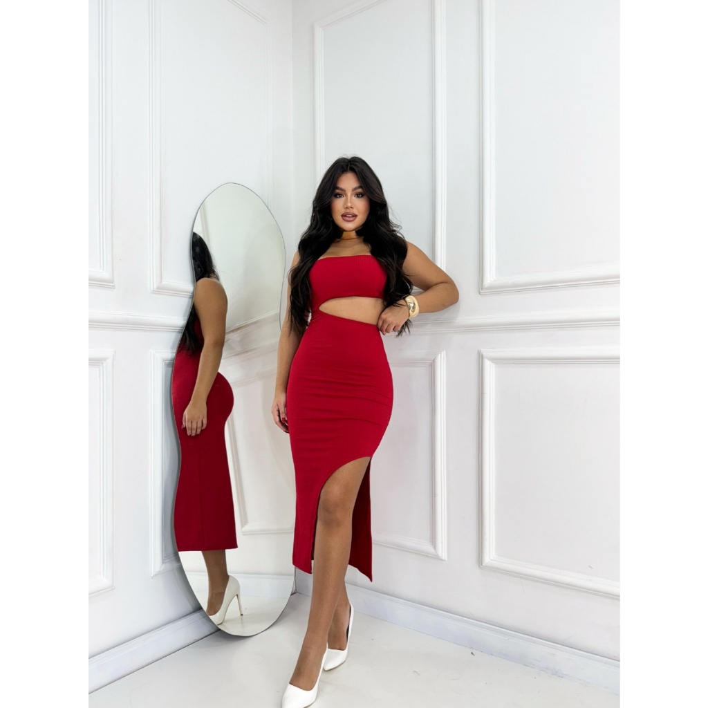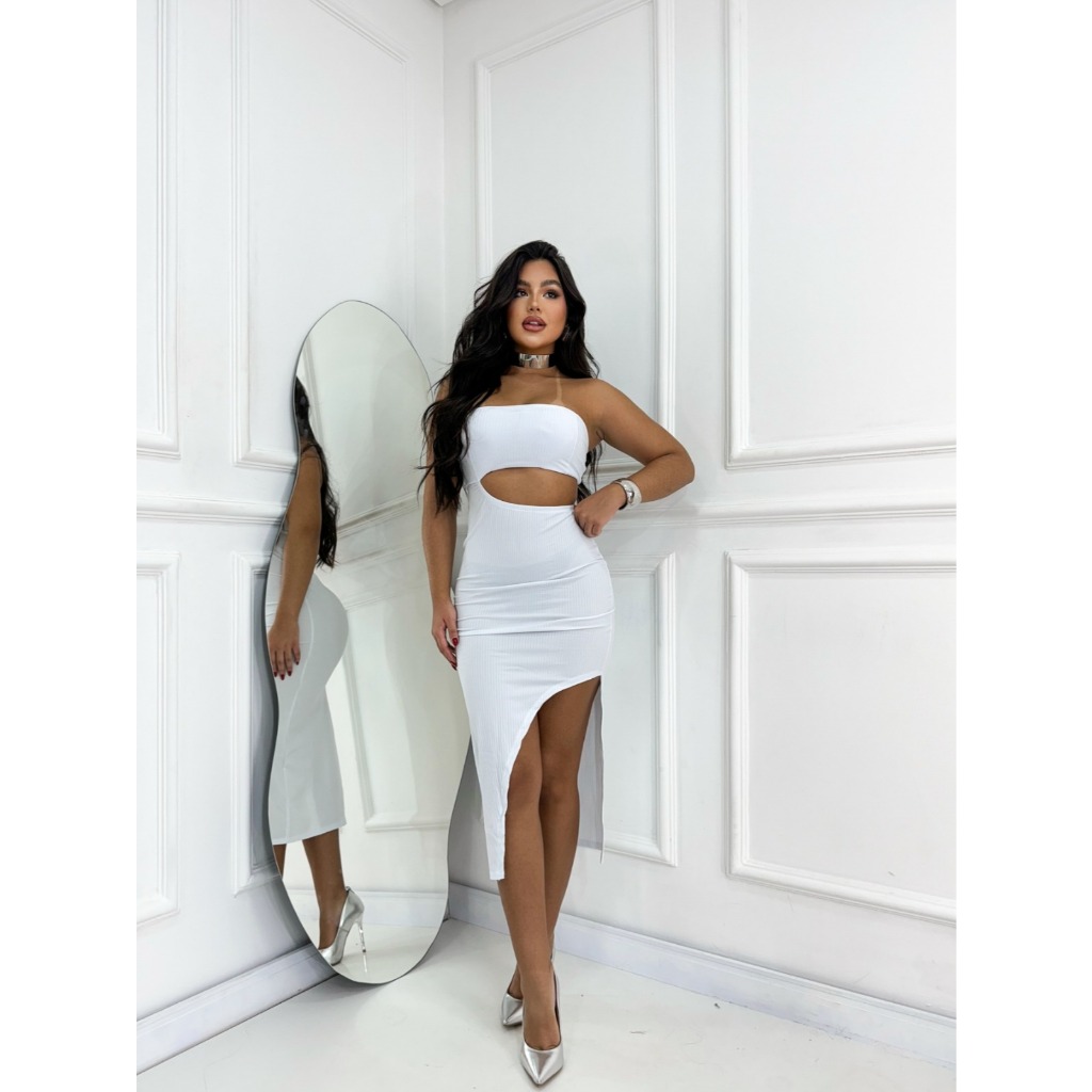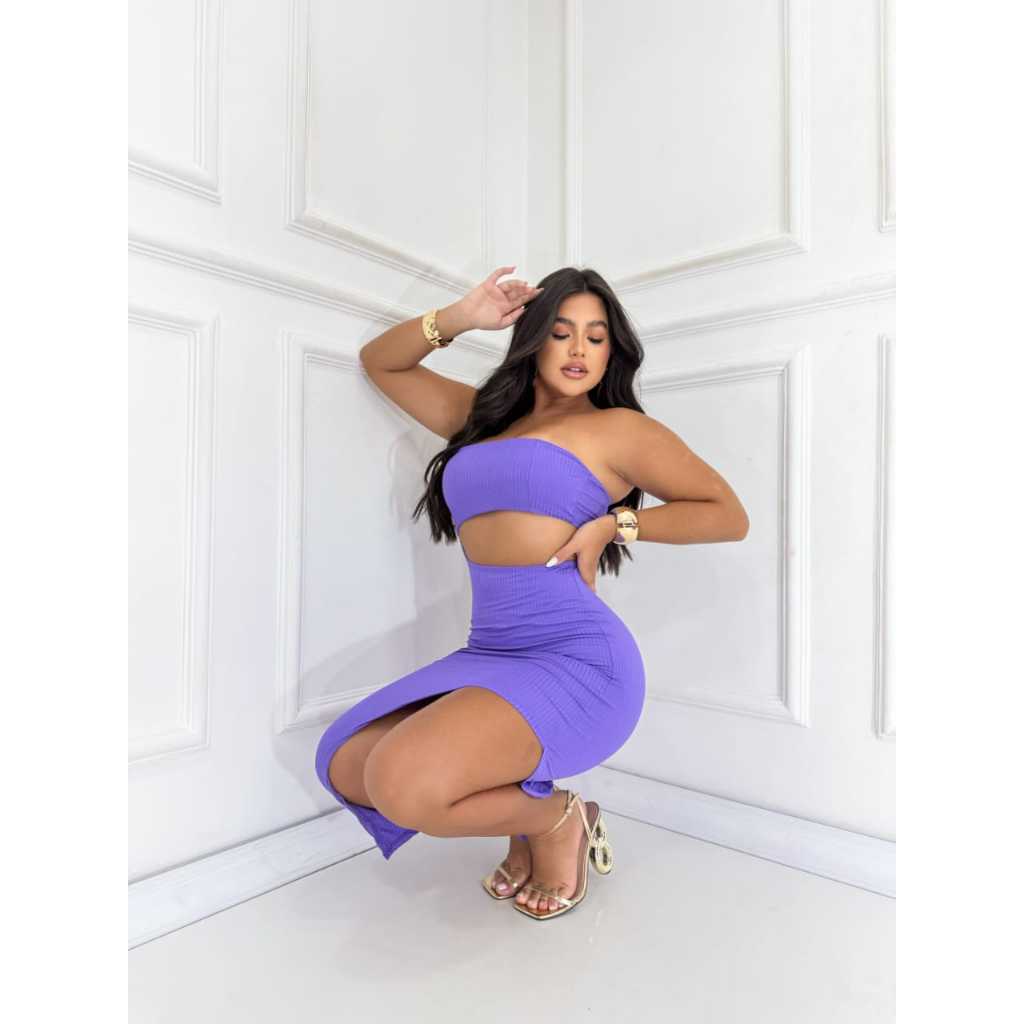 Vestido Feminino Colado Tomara Que Caia Canelado Com Fenda lateral Midi