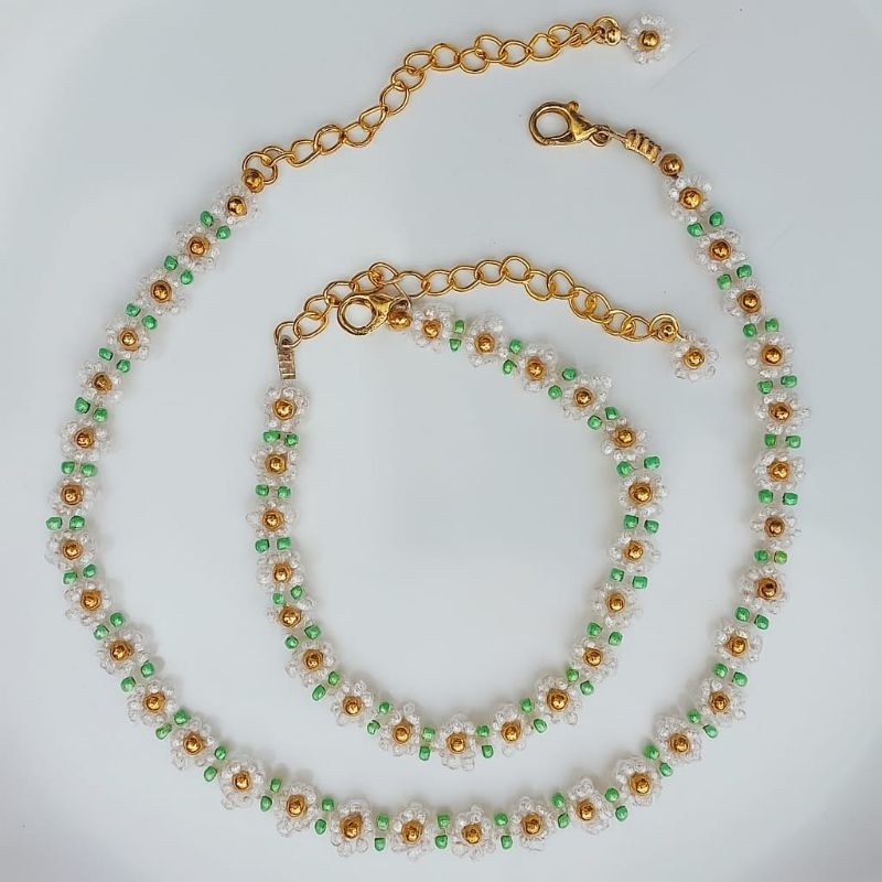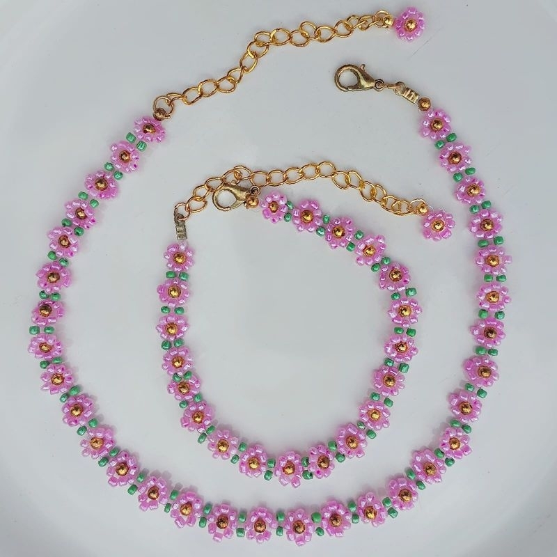 Conjunto Choker e Pulseira Florzinhas de Miçanga Fofo e Ajustável