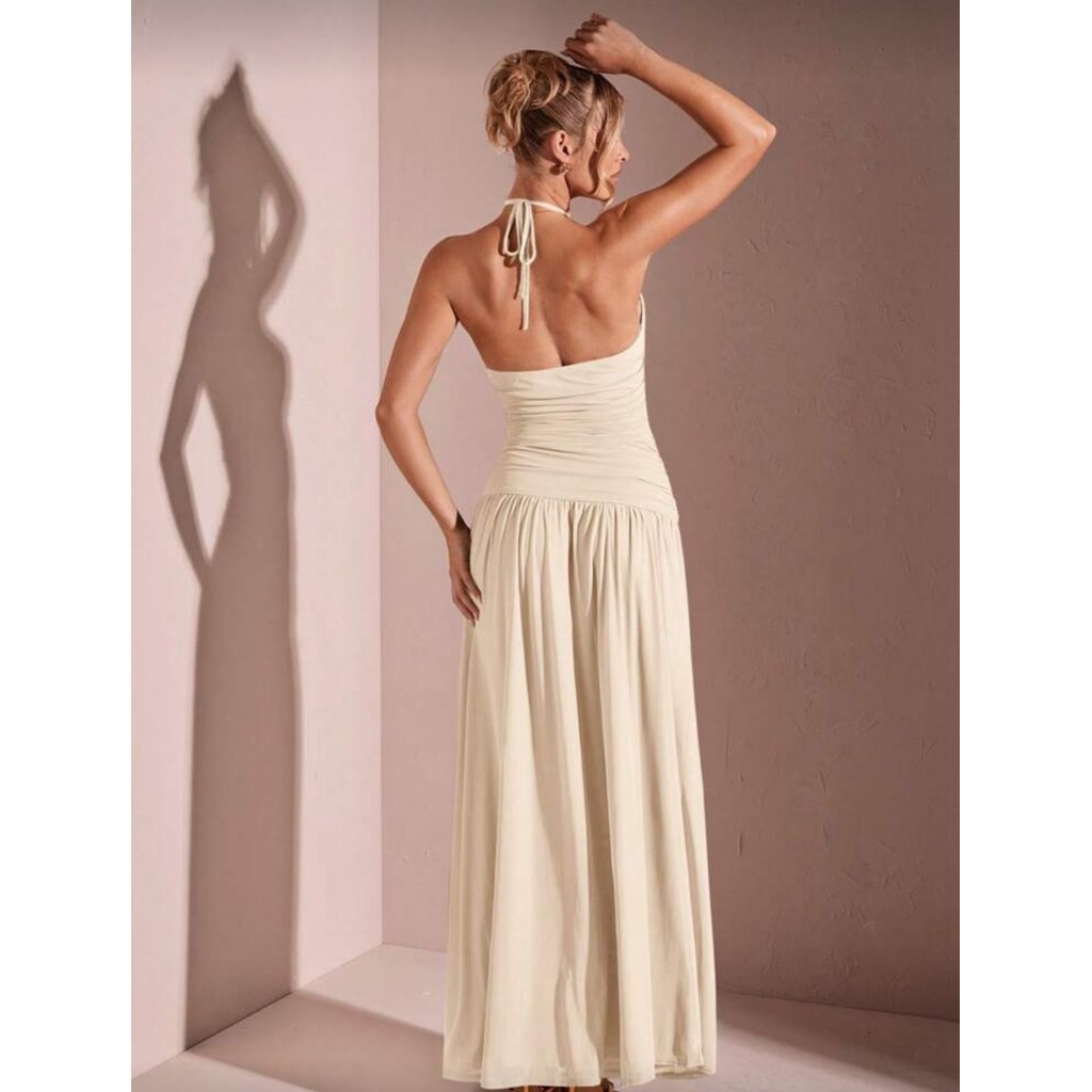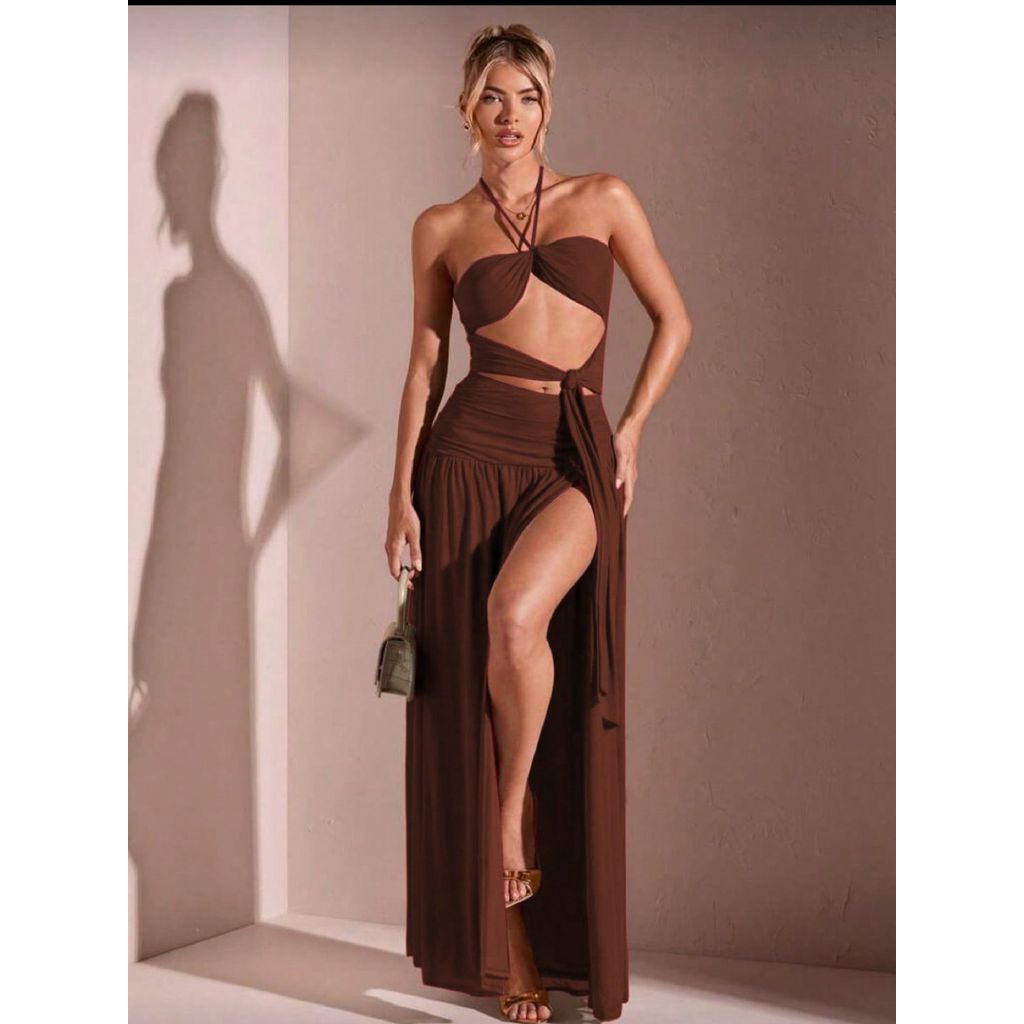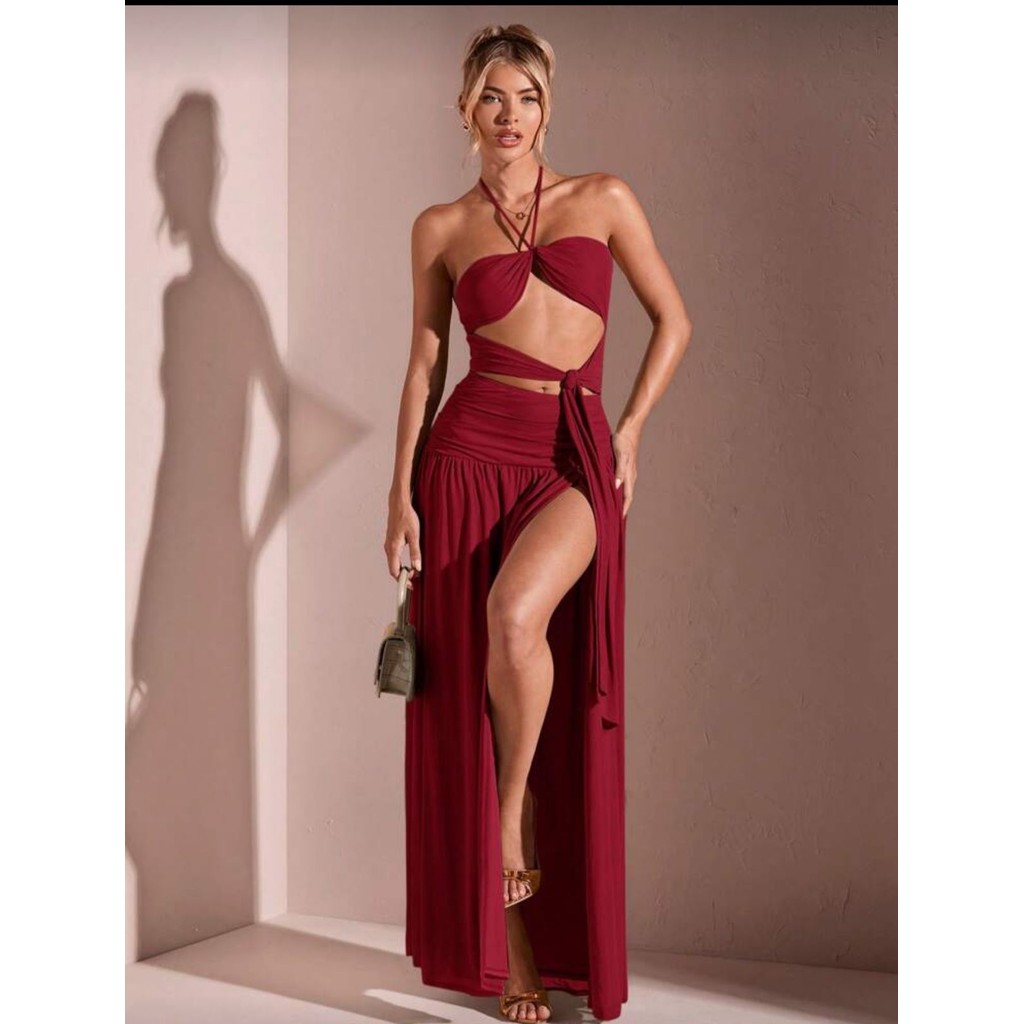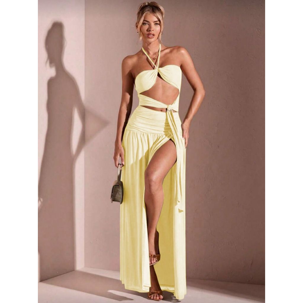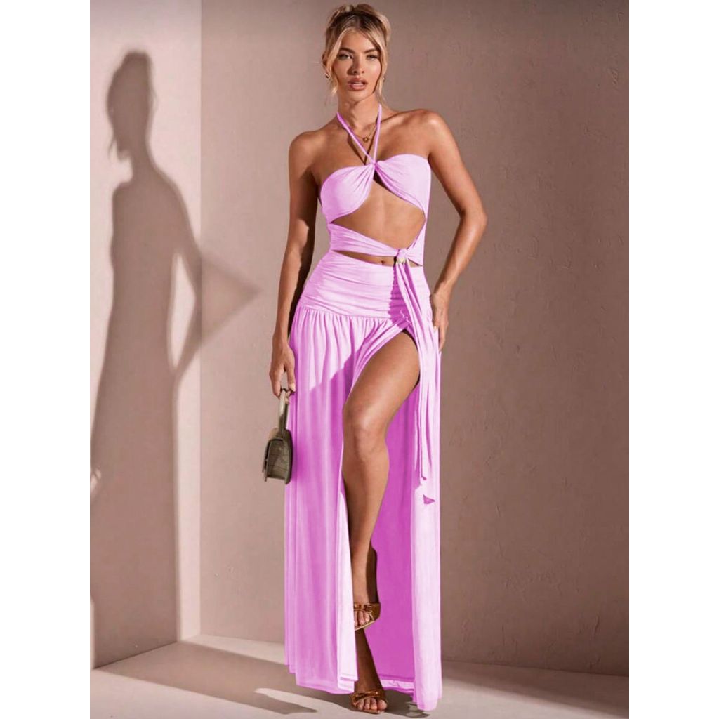 Vestido feminino longo com fenda na perna com bojo amarração no pescoço com decote fashion 2025 duplo frontal na frente